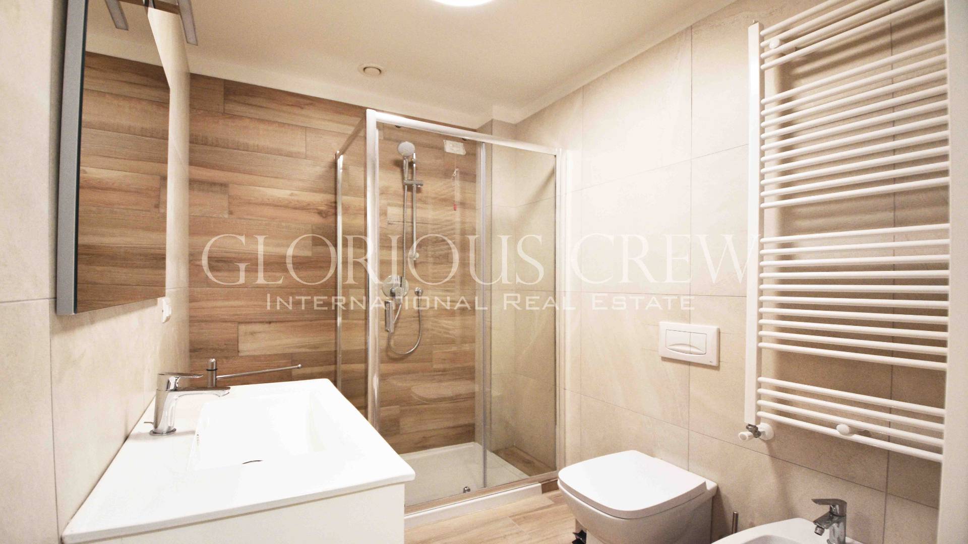 Il bagno, moderno e ben rifinito, dotato di comoda doccia.