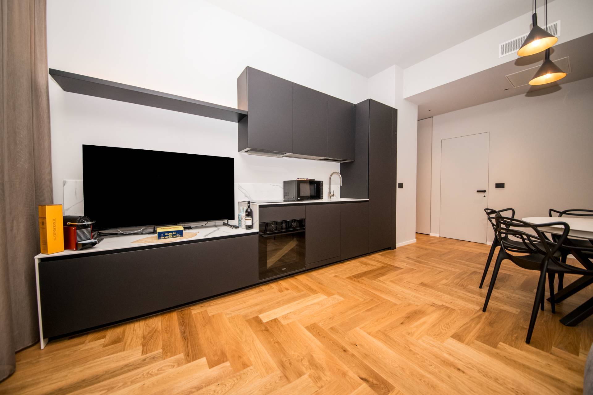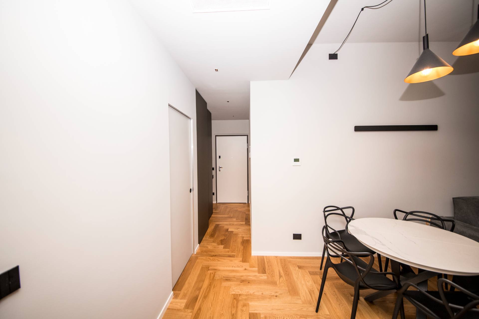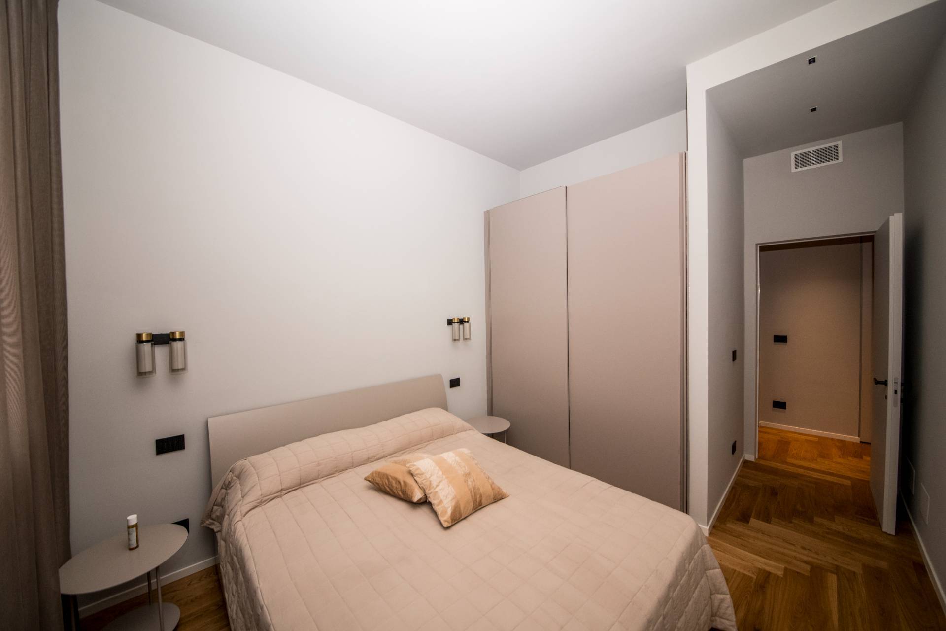 Ingresso su disimpegno, soggiorno con cucina a vista, 1 camera da letto , ampio vano studio versatile con ULTERIORE POSTO LETTO , doppi servizi e zona lavanderia . DOTAZIONI IMMOBILI: -Elegante parquet in rovere verniciato a spina italiana -Impianto di condizionamento canalizzato con ventilazione meccanica controllata . -Serramenti esterni che garantiscono il massimo della coibentazione -Porte interne filo muro -Portoncino di ingresso blindato con codice di accesso di ultima generazione -Illuminazione studiata nei particolari.