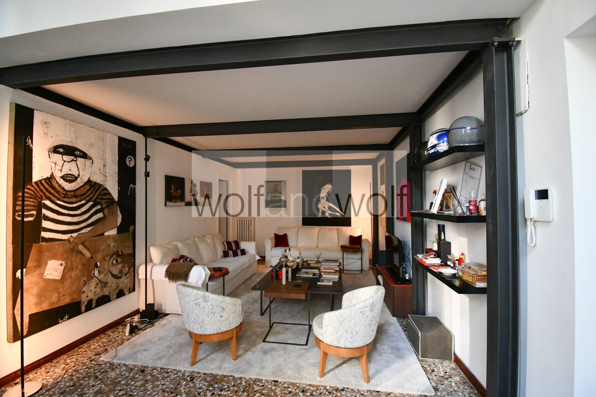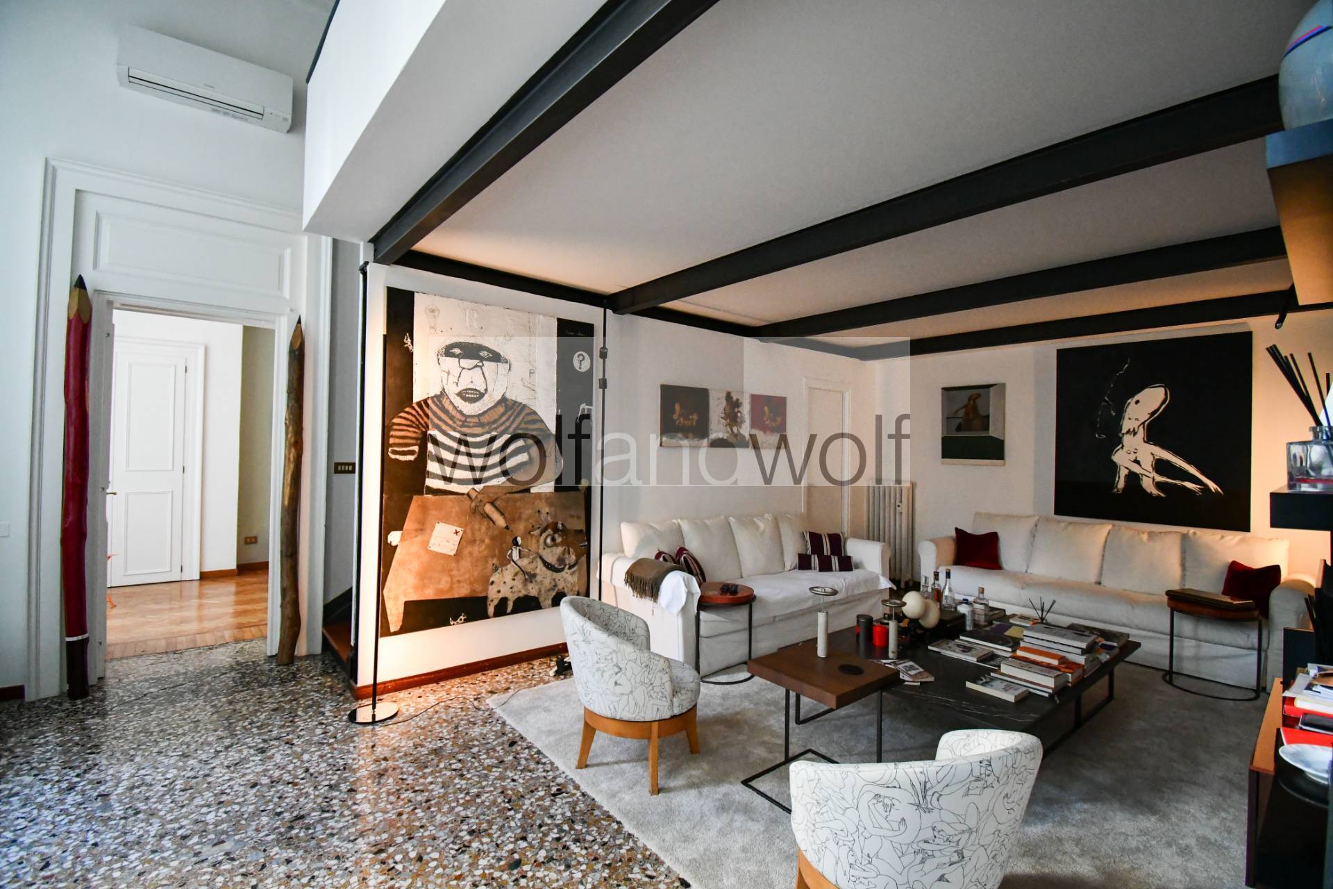 Labitazione, disposta su due livelli, si distingue per i soffitti molto alti e gli ambienti luminosi e raffinati.