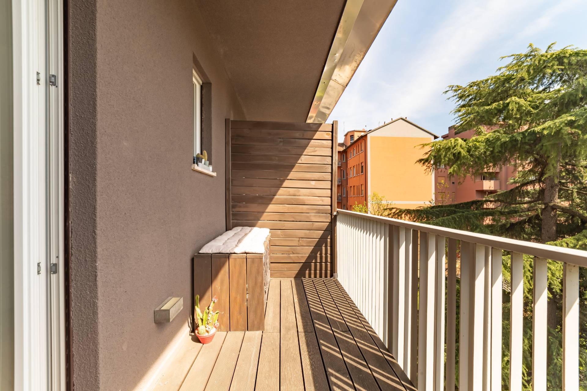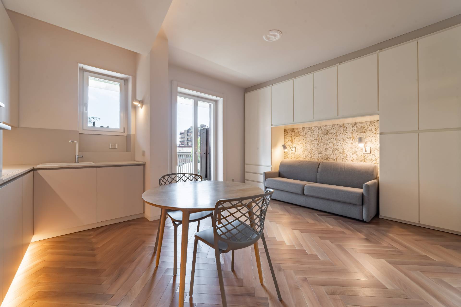 La zona giorno/notte con cucina a vista completa di elettrodomestici e divano letto si apre su un bellissimo e riservato balcone con affaccio sul verde del cortile interno.