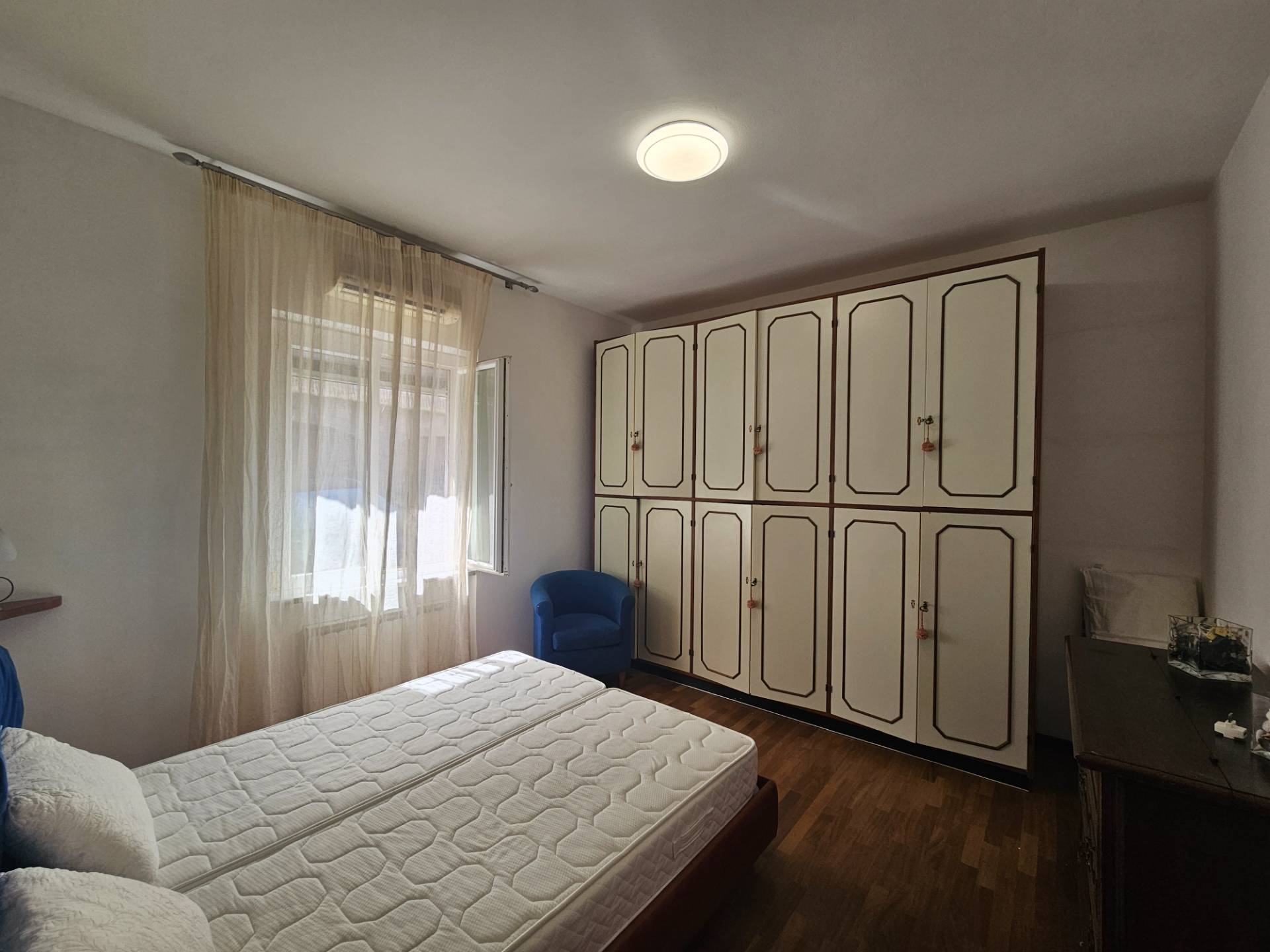Composto da camera da letto matrimoniale, camera con doppio letto singolo, ampio soggiorno con angolo cottura, bagno con vasca e doccia, balcone e un comodo posto auto sotto casa. No animali.