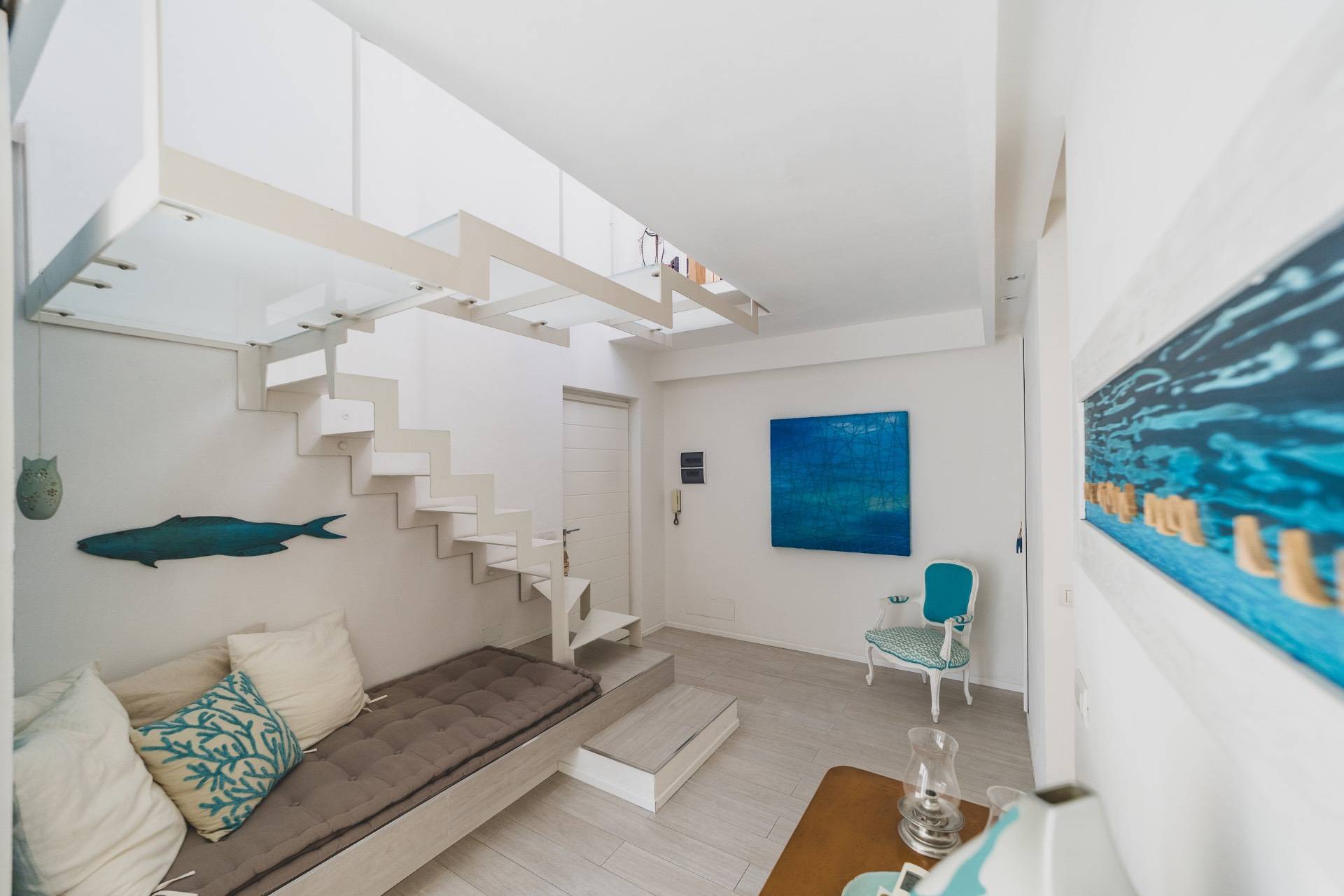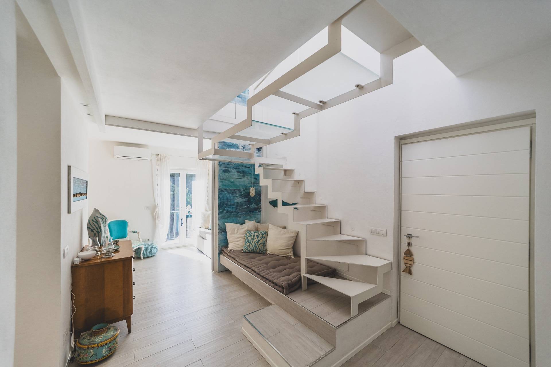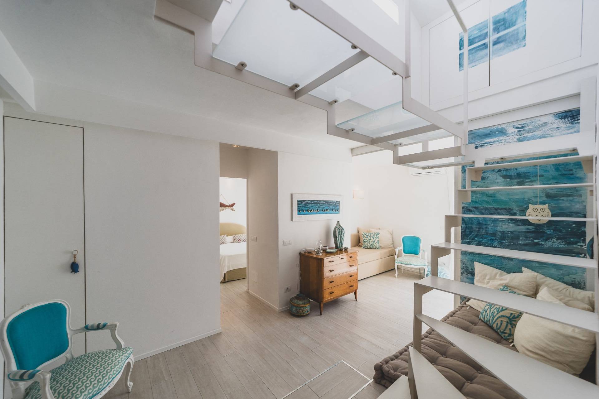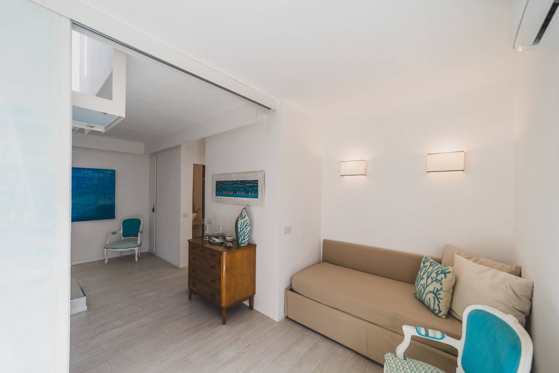 Il piano superiore ospita una seconda zona giorno con angolo cottura che si apre su una magnifica terrazza arredata, ideale per pranzi, aperitivi e momenti di relax.
