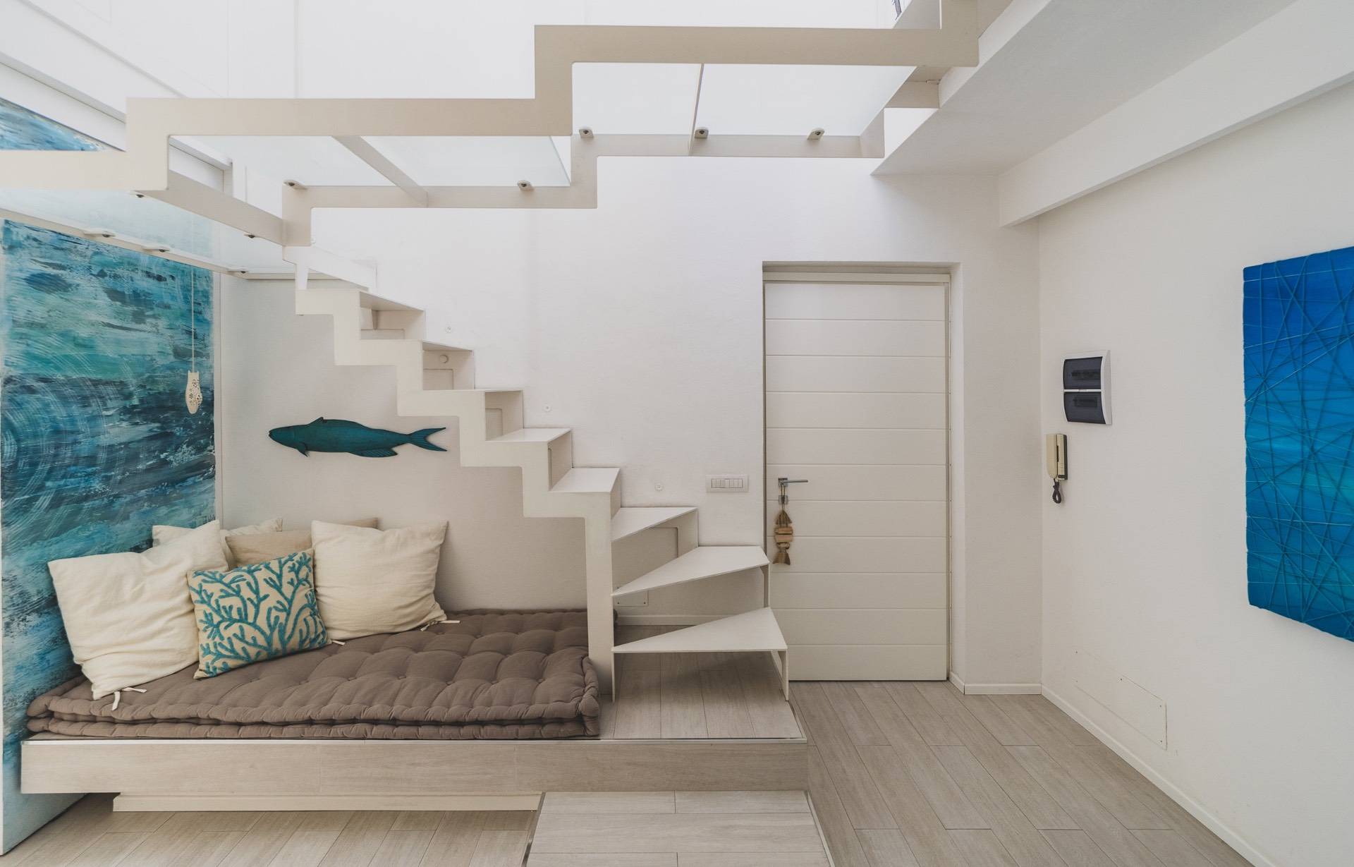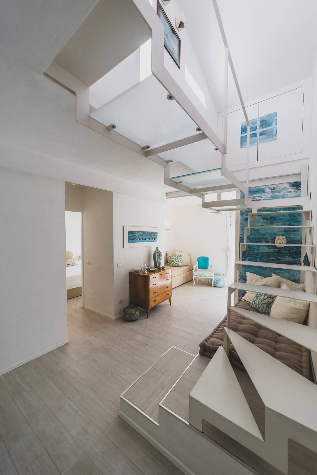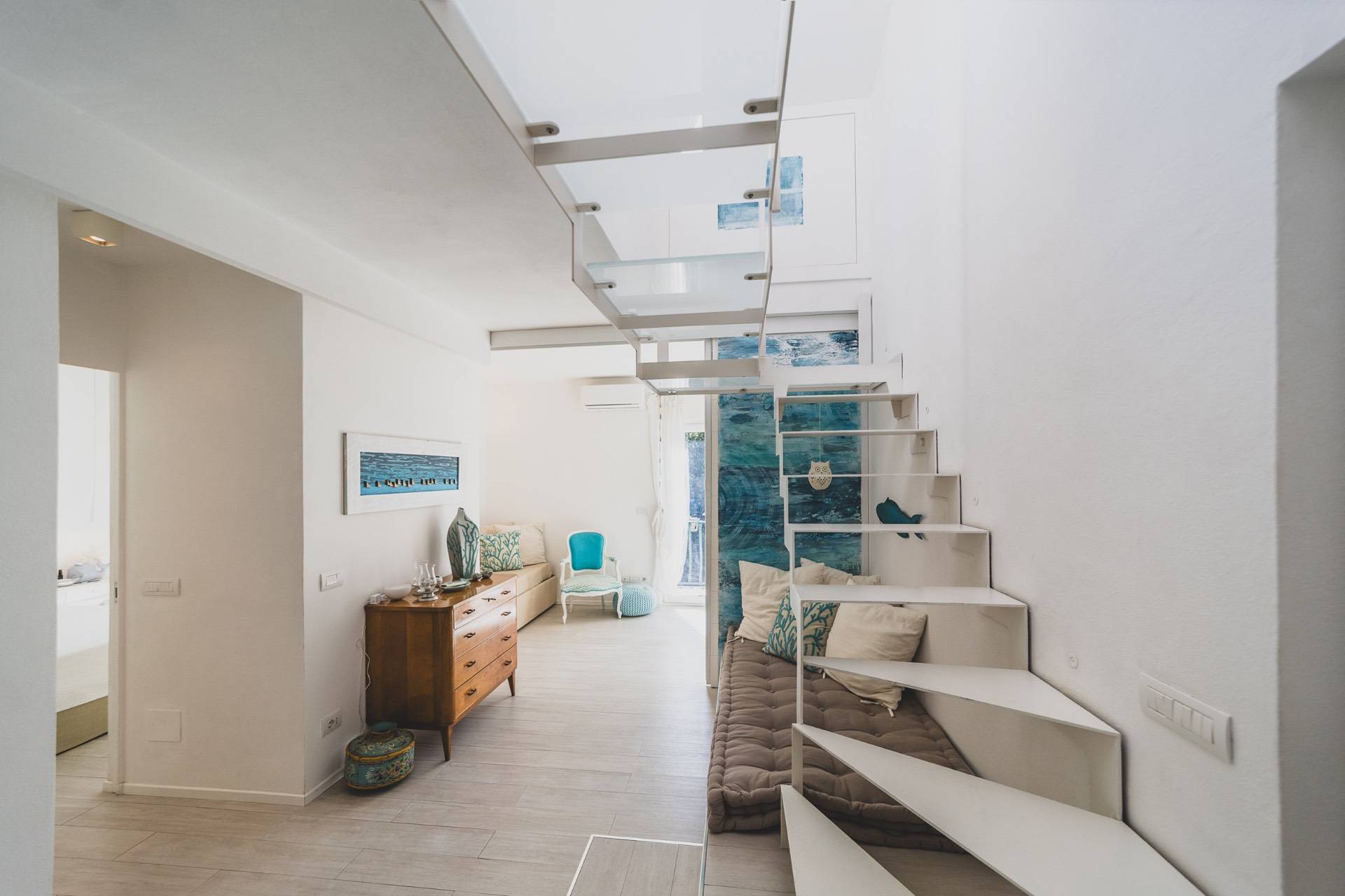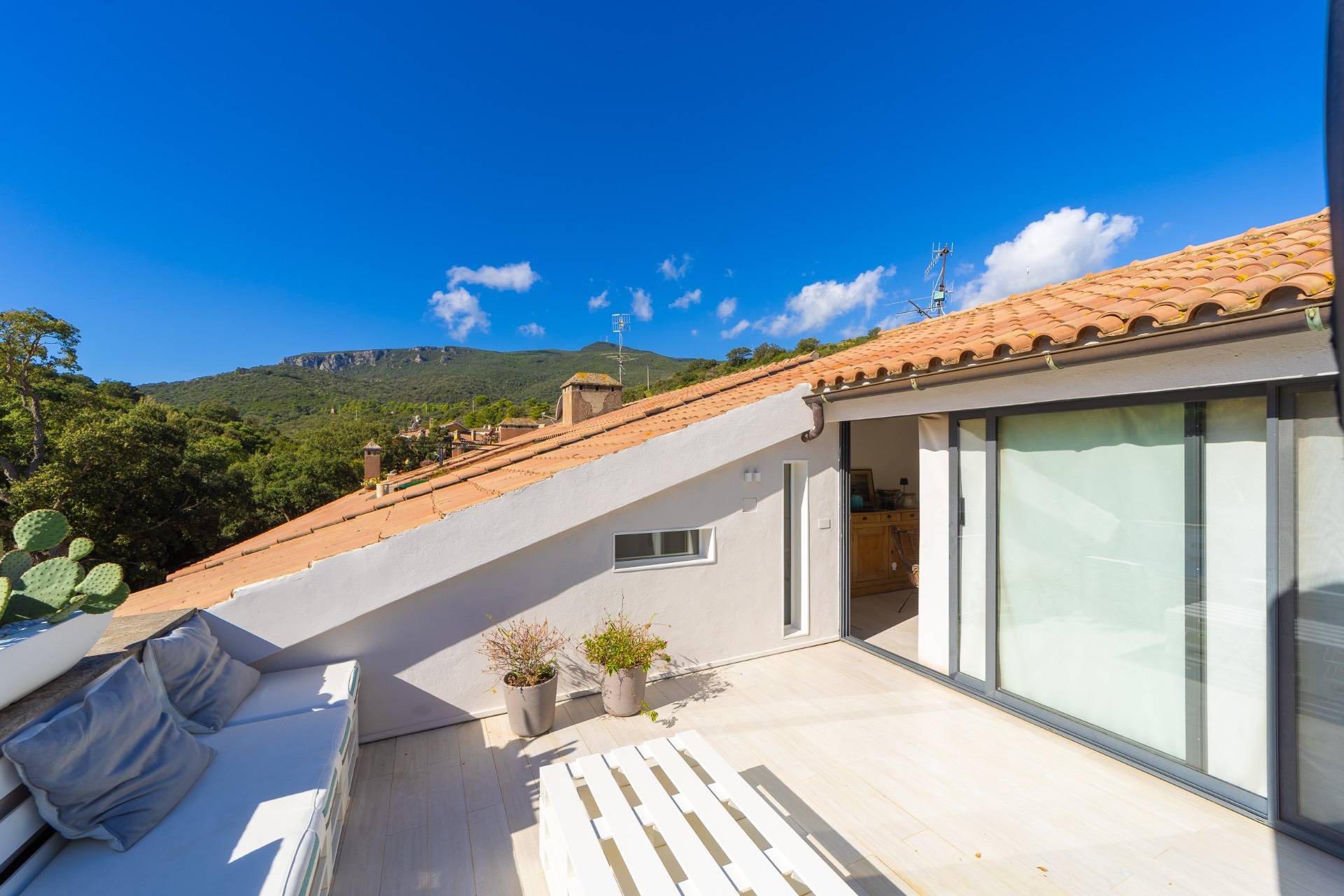 Il piano superiore ospita una seconda zona giorno con angolo cottura che si apre su una magnifica terrazza arredata, ideale per pranzi, aperitivi e momenti di relax.