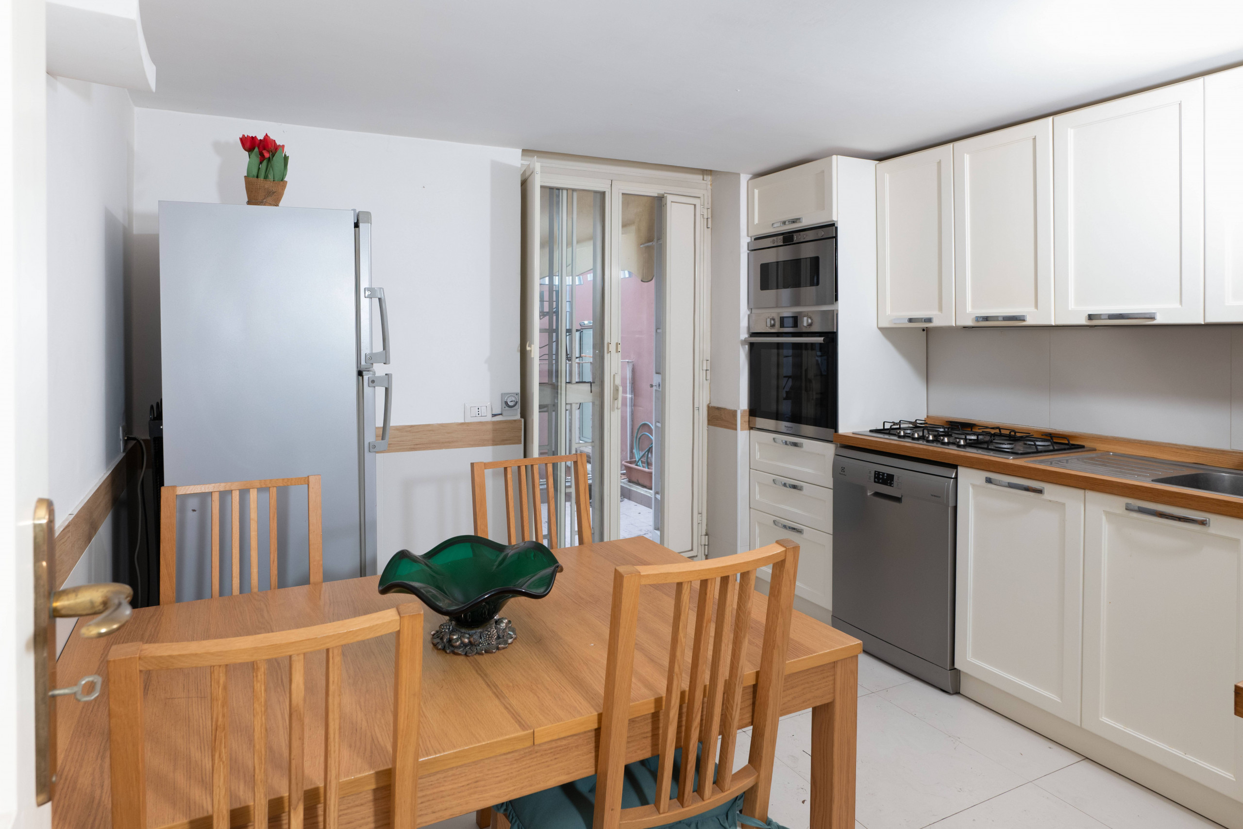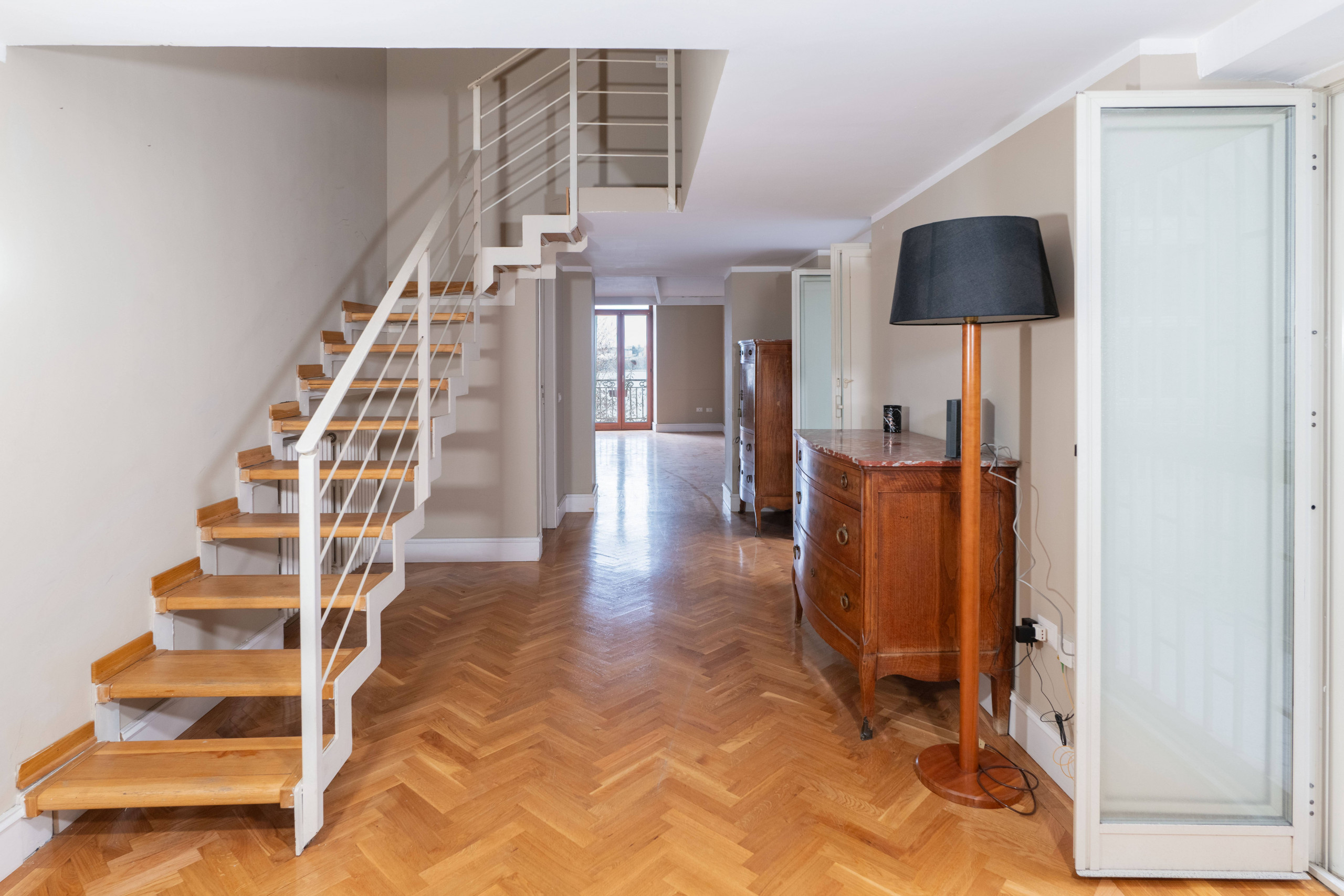 Dal disimpegno si accede anche a una cucina abitabile e a un bagno, mentre una scala interna conduce al piano superiore dove si sviluppa la zona notte, composta da 2 camere da letto, un bagno con vasca e una raffinata stanza armadio con bagno privato.