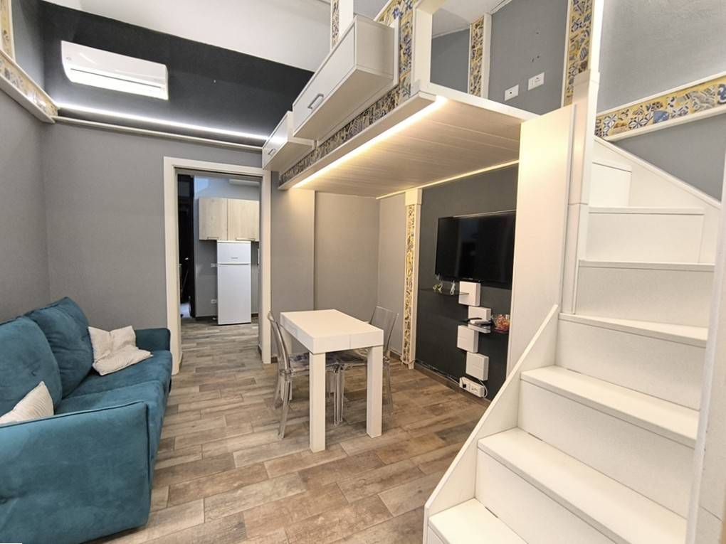 Lappartamento si compone di ingresso, ampia zona living con letto a una piazza e mezza soppalcato, raggiungibile tramite una particolare scala in legno artigianale che conferisce un tocco unico e scenografico allambiente.