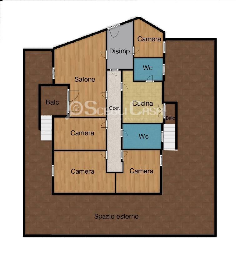 L'immobile si sviluppa su una superficie di 128 mq composto da: ingresso su disimpegno, salone doppio con accesso al terrazzo, tre camere da letto finestrate, cucina abitabile con accesso allo spazio esterno e due servizi.