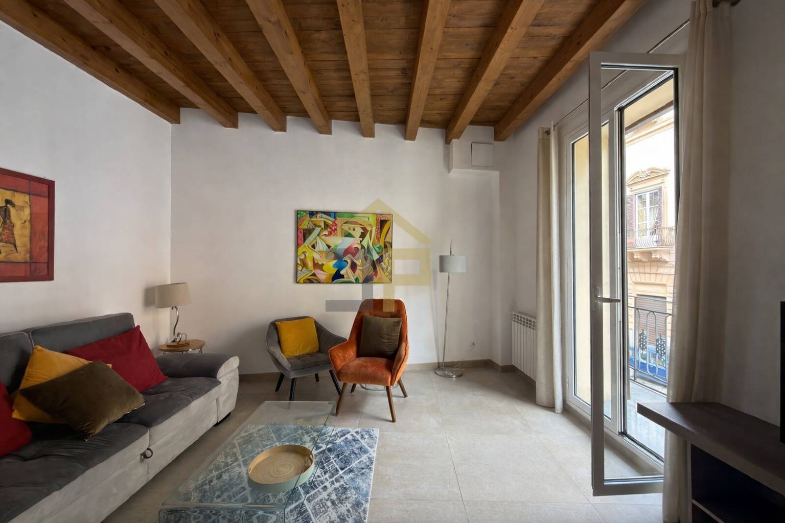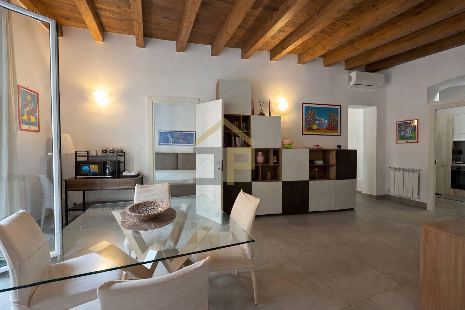 Gli ambienti interni si presentano ristrutturati e curati nei dettagli, con pavimentazione in gres, travi a vista in legno, porte in legno laccato bianco e infissi con persiane esterne in alluminio, elementi che conferiscono allabitazione un aspetto moderno e luminoso.