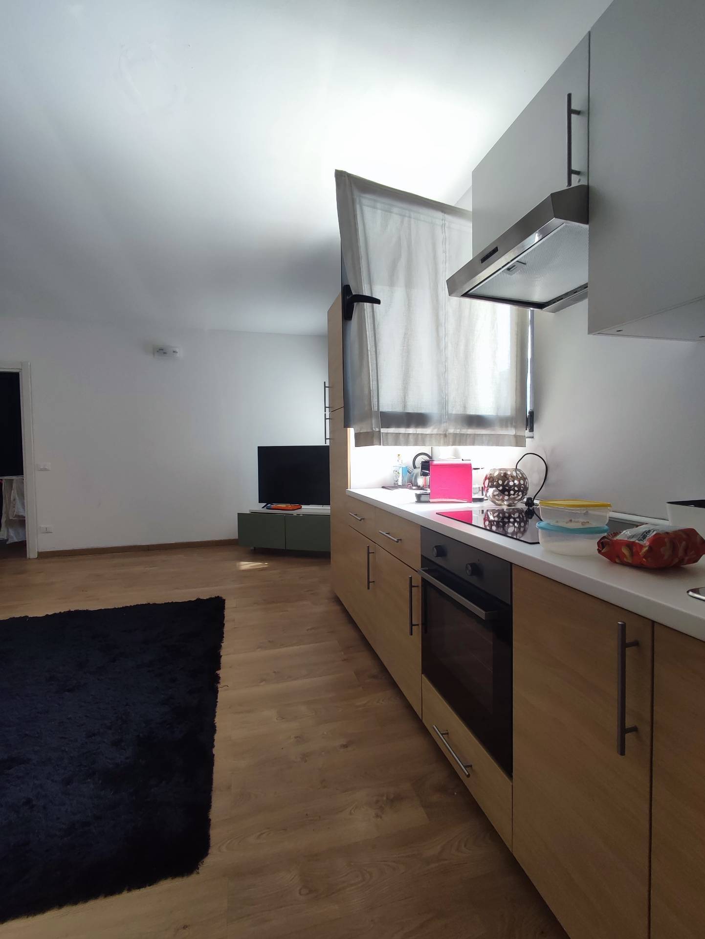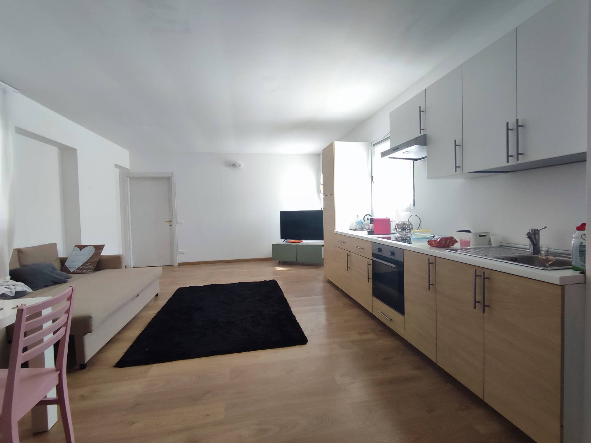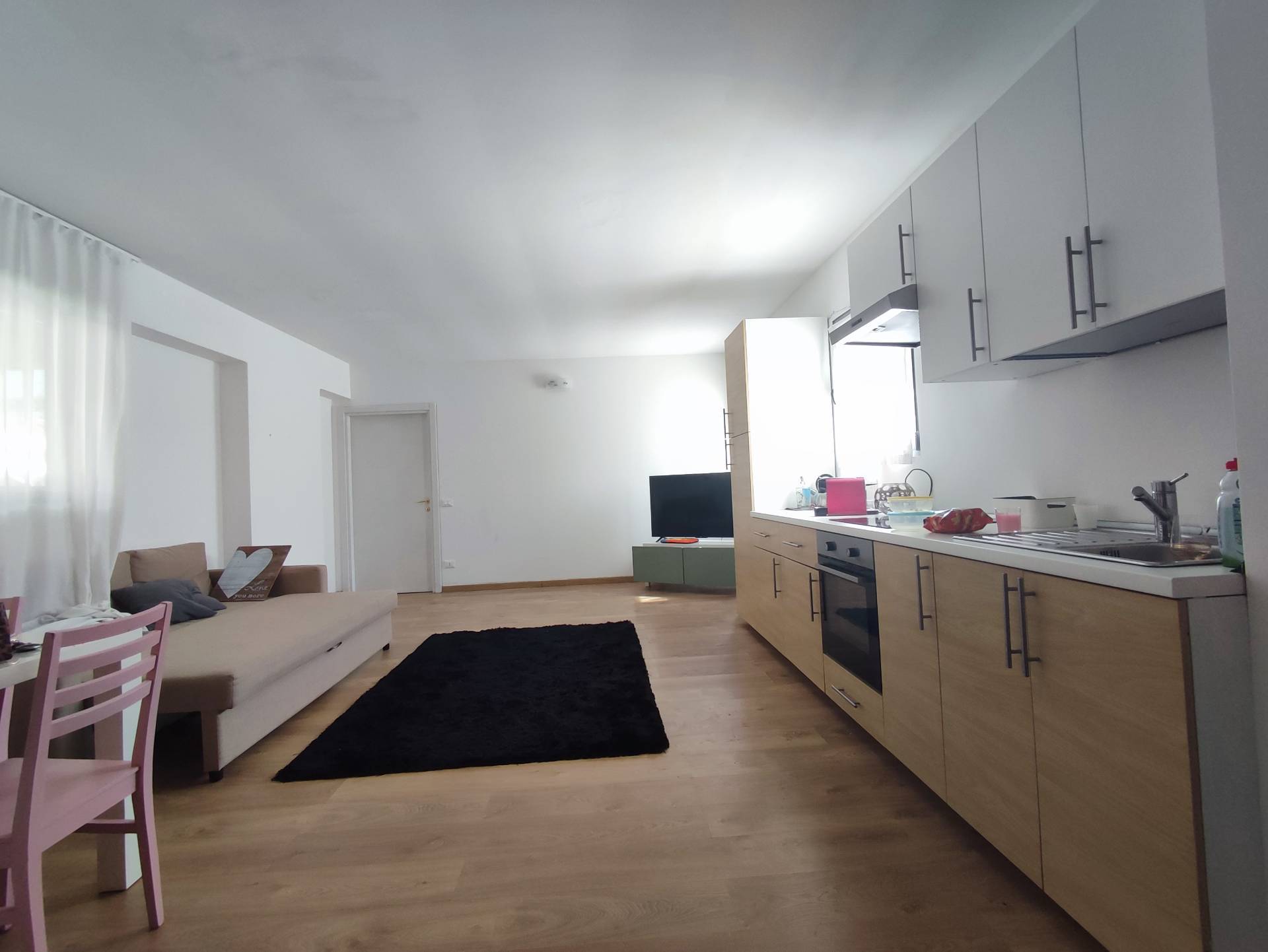 L'appartamento con ingresso comune a solo due unit si apre sulla zona giorno con cucina fornita e living.