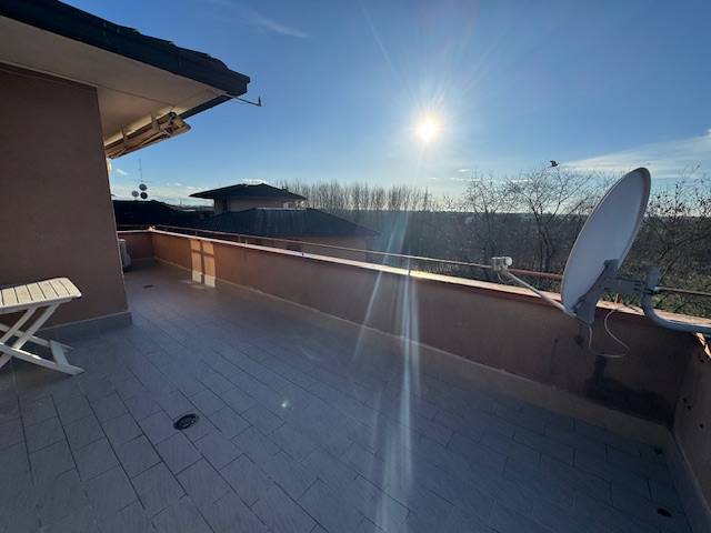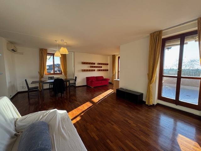 L'immobile completamente arredato, e composto dall'ingresso che porta al grande salone tutto in parquet dotato di camino funzionante e condizionatore, il quale affaccia poi su uno splendido terrazzo di 20 metri quadri; successivamente si accede alla cucina abitabile con balcone privato; dopodich si passa alla zona notte composta da un ampio disimpegno che porta alla prima camera da letto; per poi arrivare al primo bagno con vasca; successivamente alla camera matrimoniale ed infine al secondo bagno con box doccia e lavatrice.
