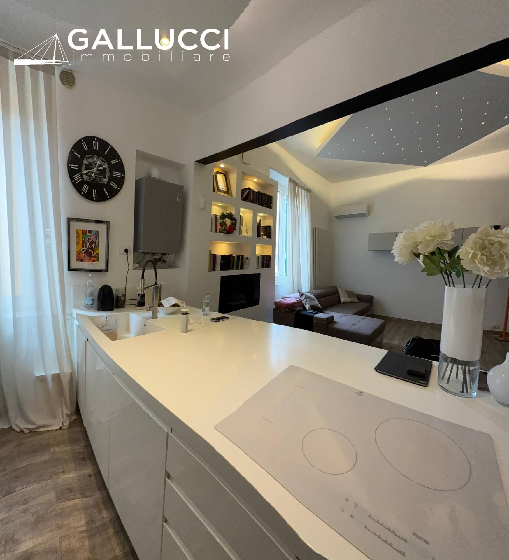 La zona giorno composta da unampia cucina e sala open space, luminosa e funzionale, con cucina a induzione.