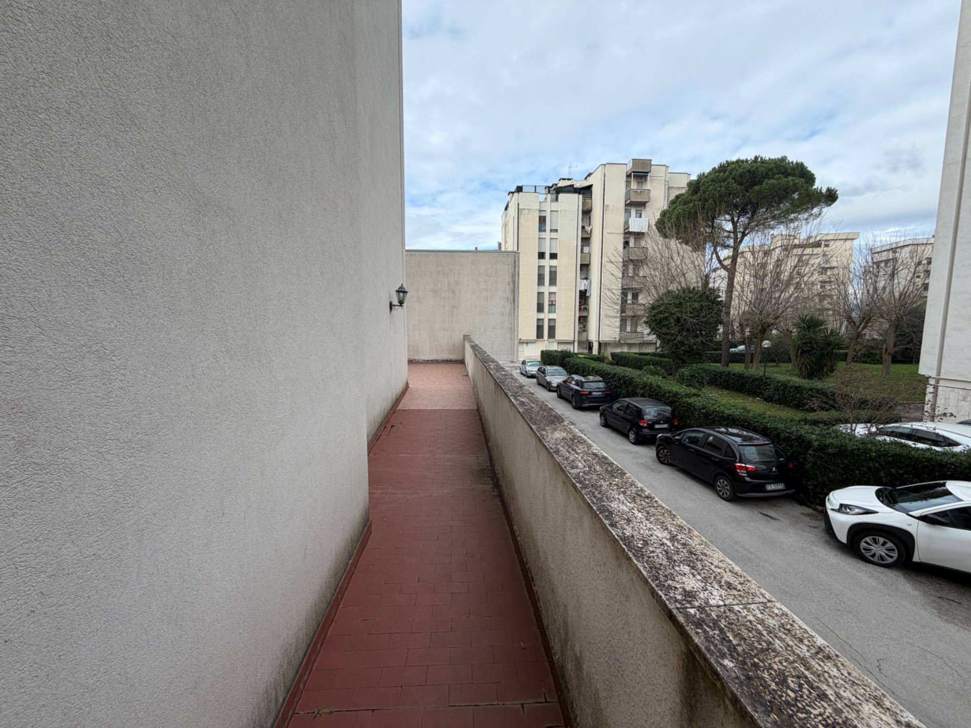 Ingresso a corridoio, soggiorno con cucinotto, due terrazze abitabili comunicanti tra loro (una lato zona giorno con attacco per lavatrice e pilozzo, l'altra lato zona notte), camera matrimoniale, camera singola, bagno con doccia e finestra.