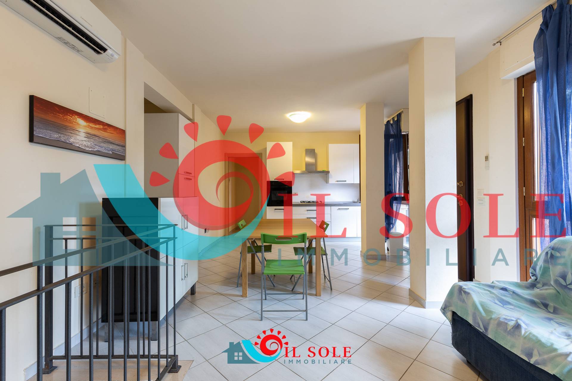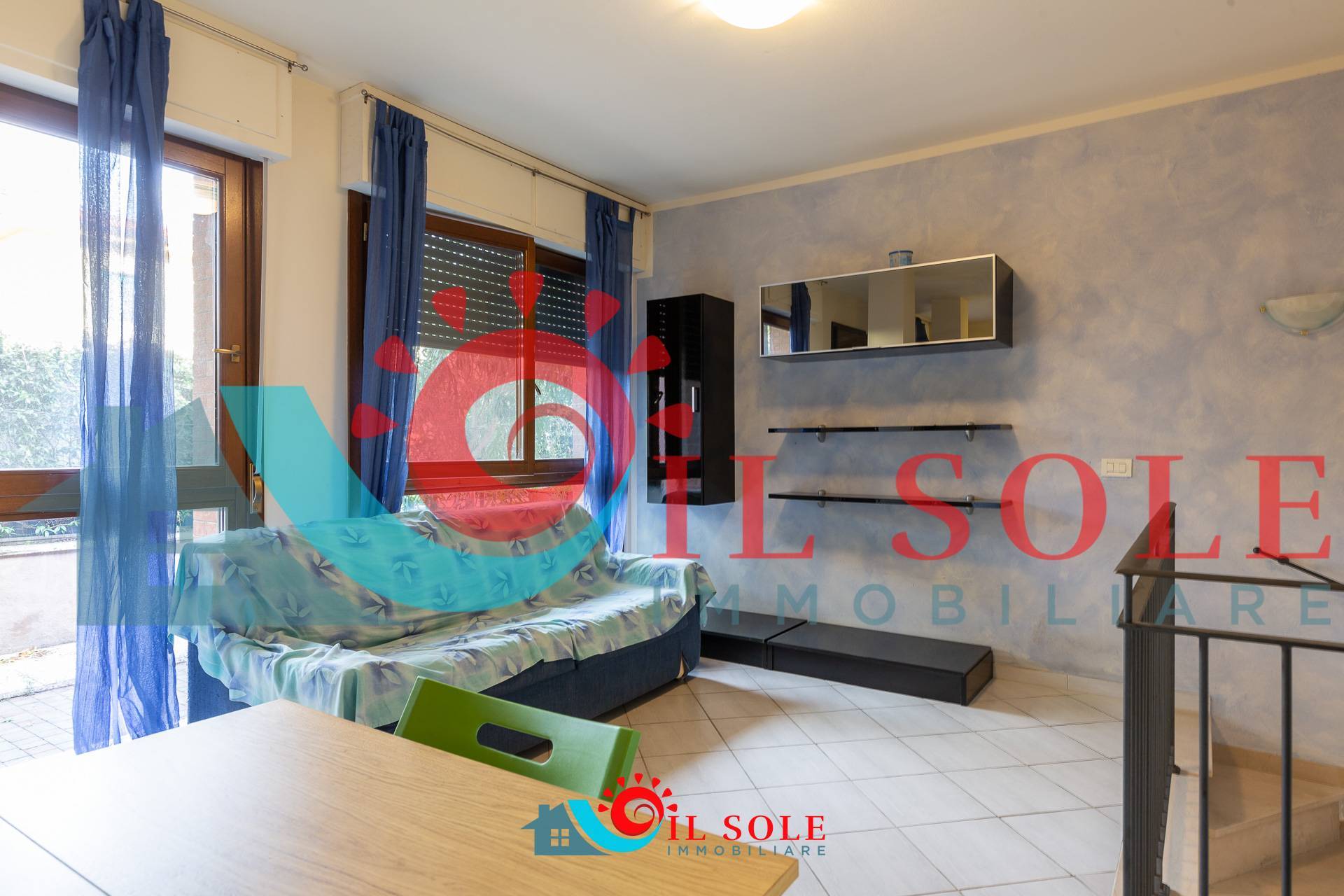 Il trilocale si sviluppa su due livelli : al primo livello troviamo soggiorno con cucina a vista, da cui possibile accedere direttamente al giardino e primo bagno; Al livello inferiore due camere matrimoniali e secondo bagno.
