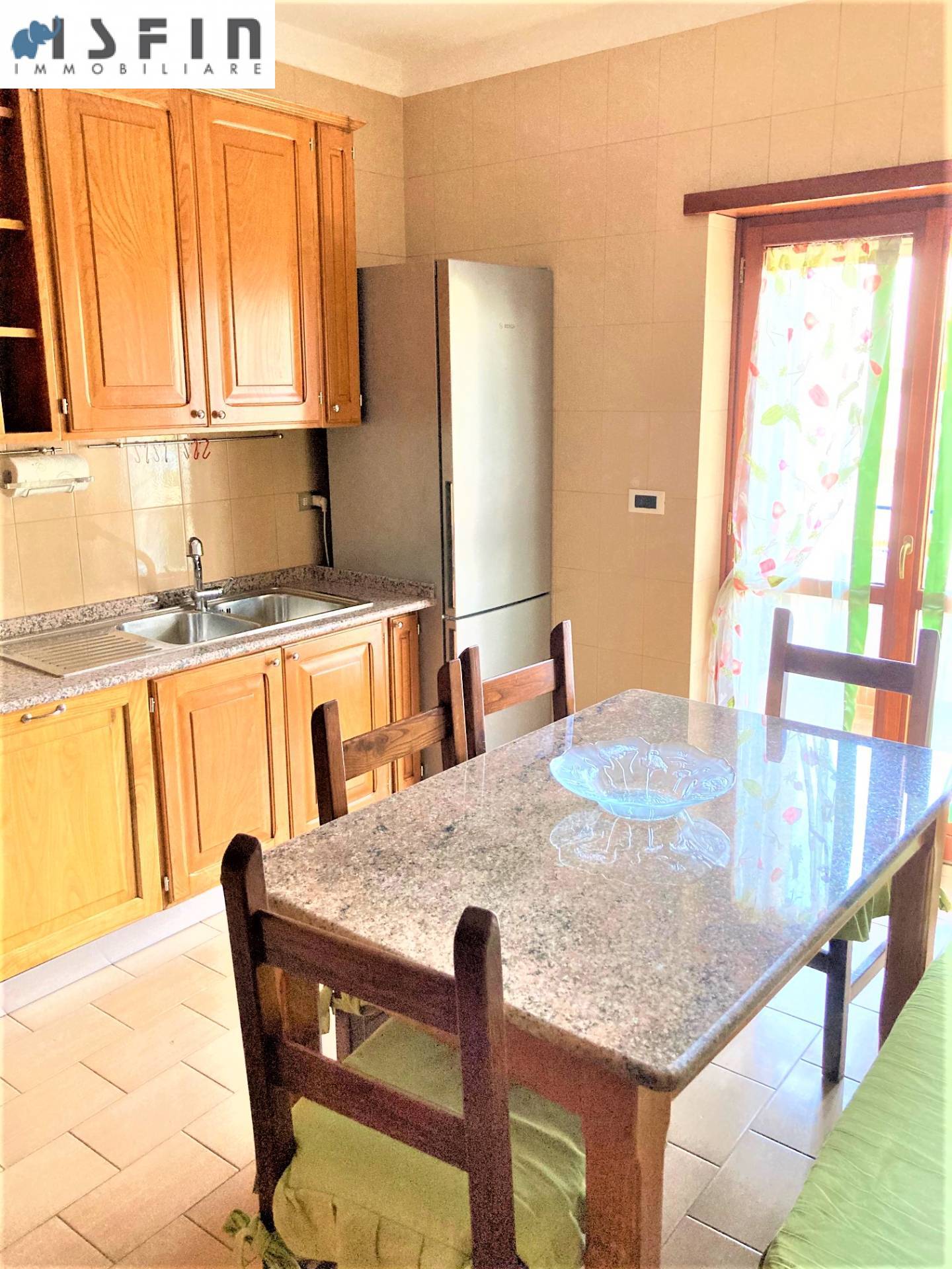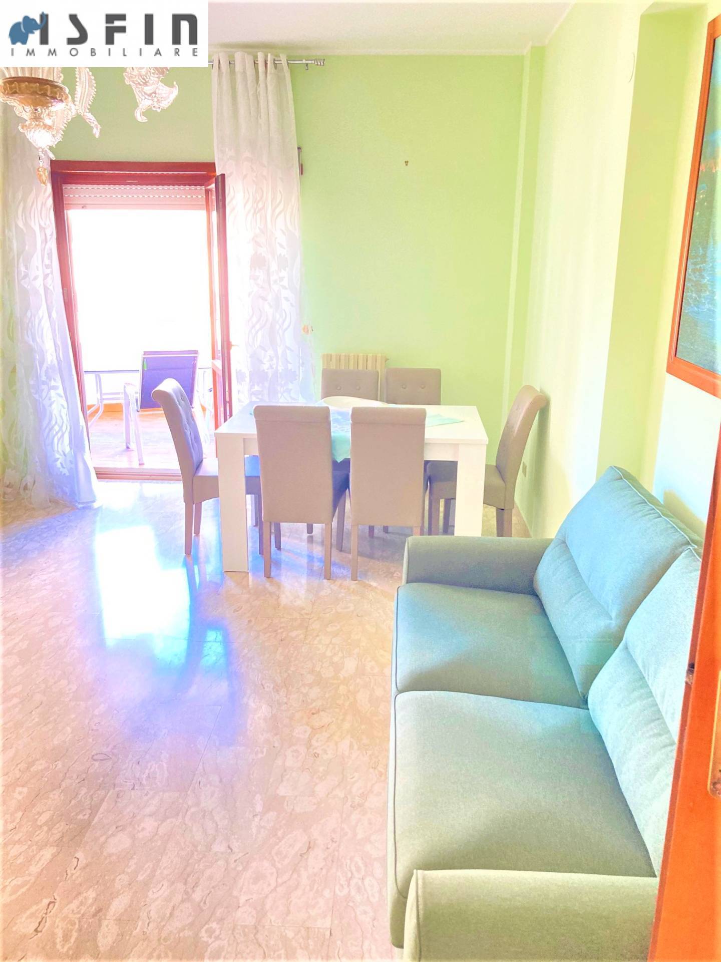 L'appartamento cos composto: ingresso, disimpegno, cucina abitabile con balcone e ripostiglio, salone con terrazzino/balcone, tre camere da letto, due bagni e posti auto scoperti nel cortile recintato.