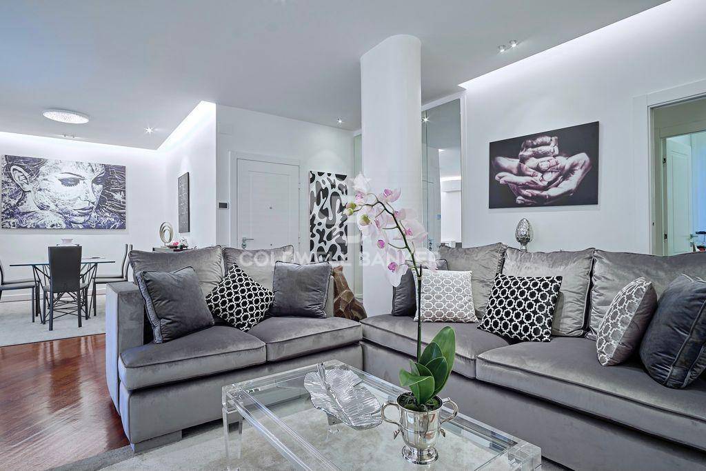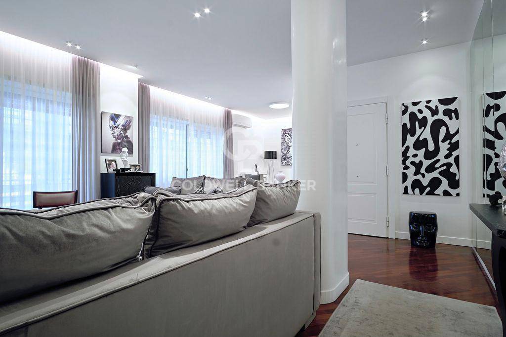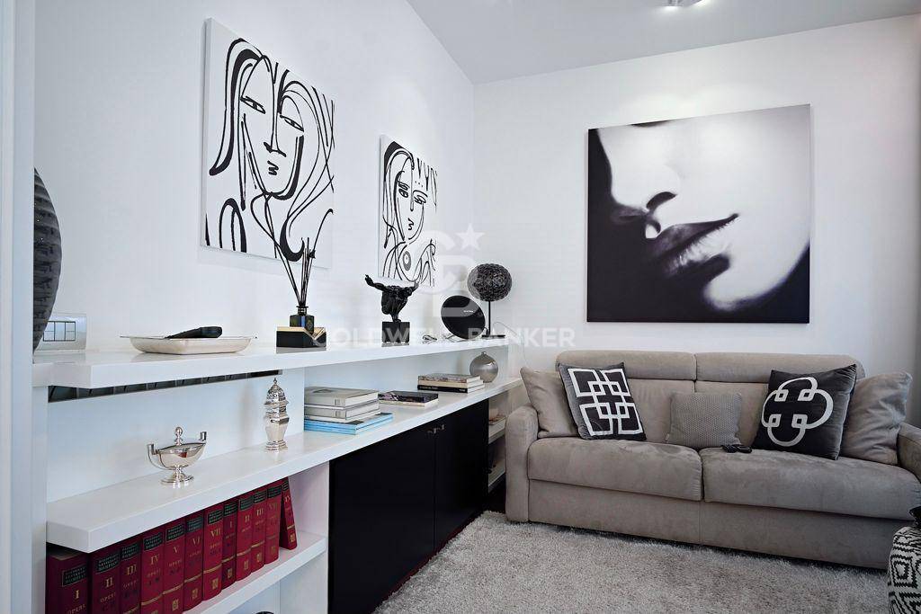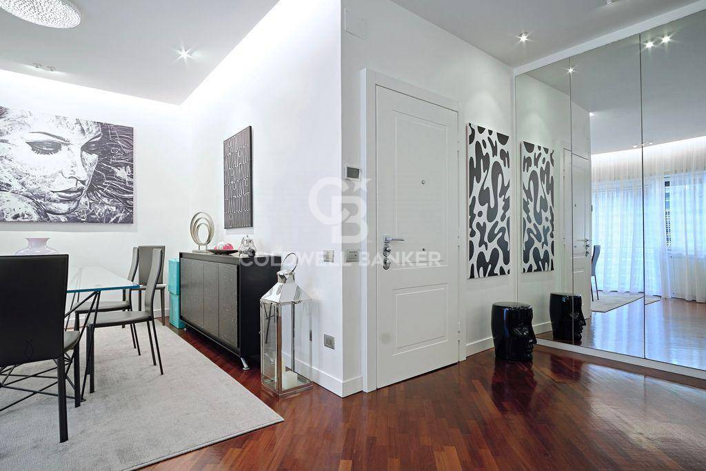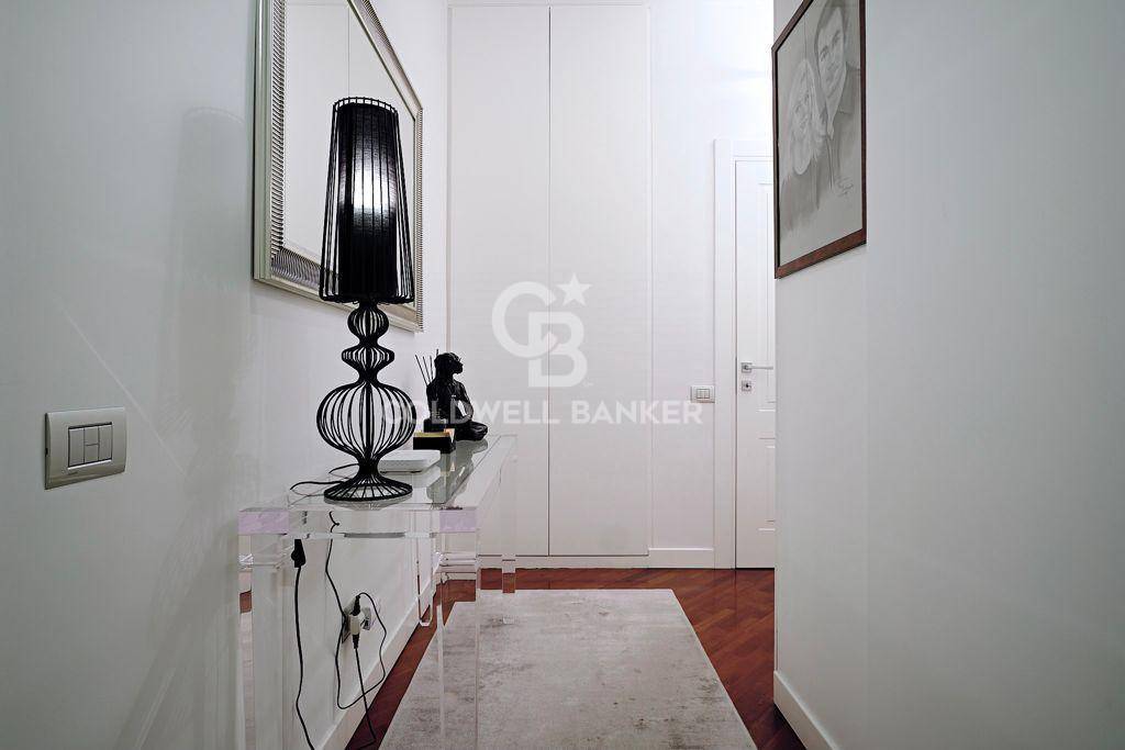 Posto al terzo piano di una palazzina di cinque, stato completamente ristrutturato creando spazi ampi e luminosi, soffitti e controsoffitti sono dotati di illuminazioni dimerabile, le verniciature bianche in tutta la casa hanno permesso di ottenere un gradevole effetto di modernit e la presenza di pezzi unici, nonch la scelta dei materiali e di un mobilio di design, conferiscono una nota di stile a tutta la casa. Dall'ingresso principale si accede al salone triplo con sala da pranzo e sala relax, dove spiccano particolarmente gli arredi di falegnameria, I tendaggi Dedar, faretti "oty light pop"e una lampada Calipso di Artemide in sala da pranzo la cui illuminazione esalta il tavolo e le sedie di Cattelan.