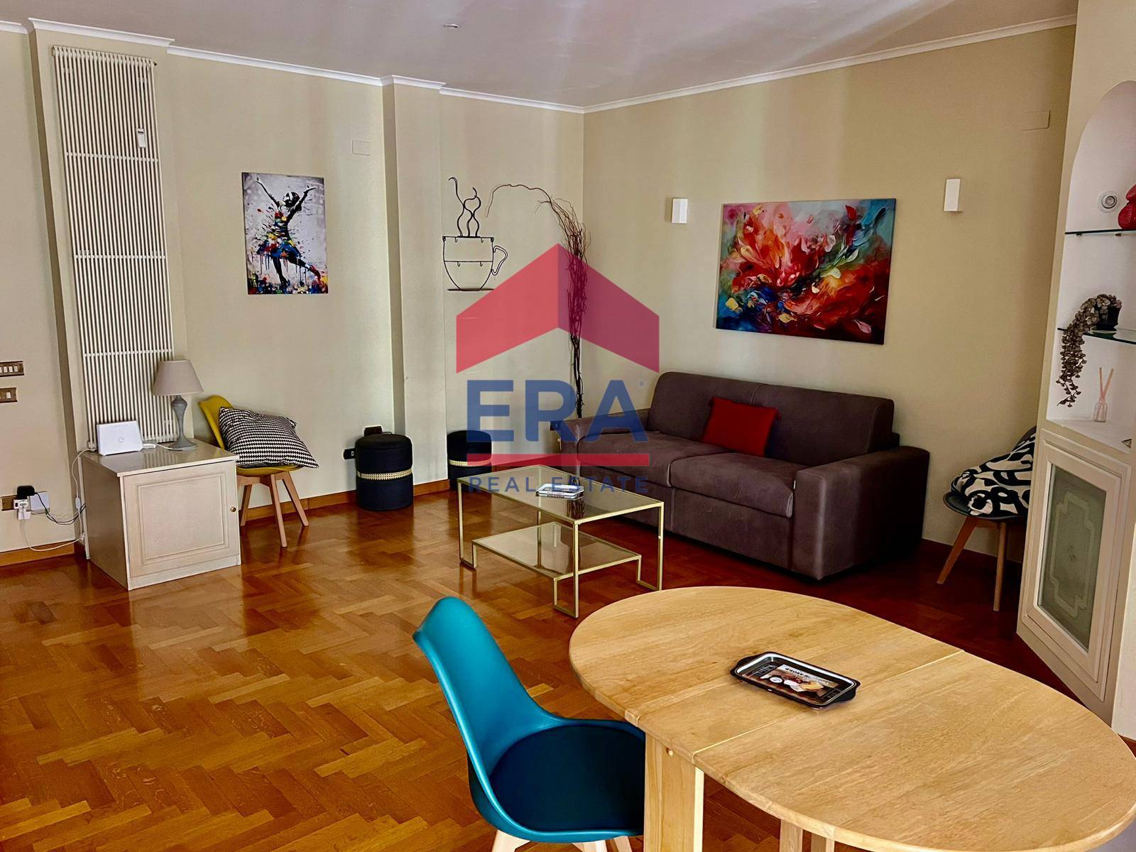 L'appartamento composto da un ampio soggiorno con boiserie in legno bianco, cucinotto, camera da letto, corridoio con pratico armadio a muro, bagno e balcone abitabile.