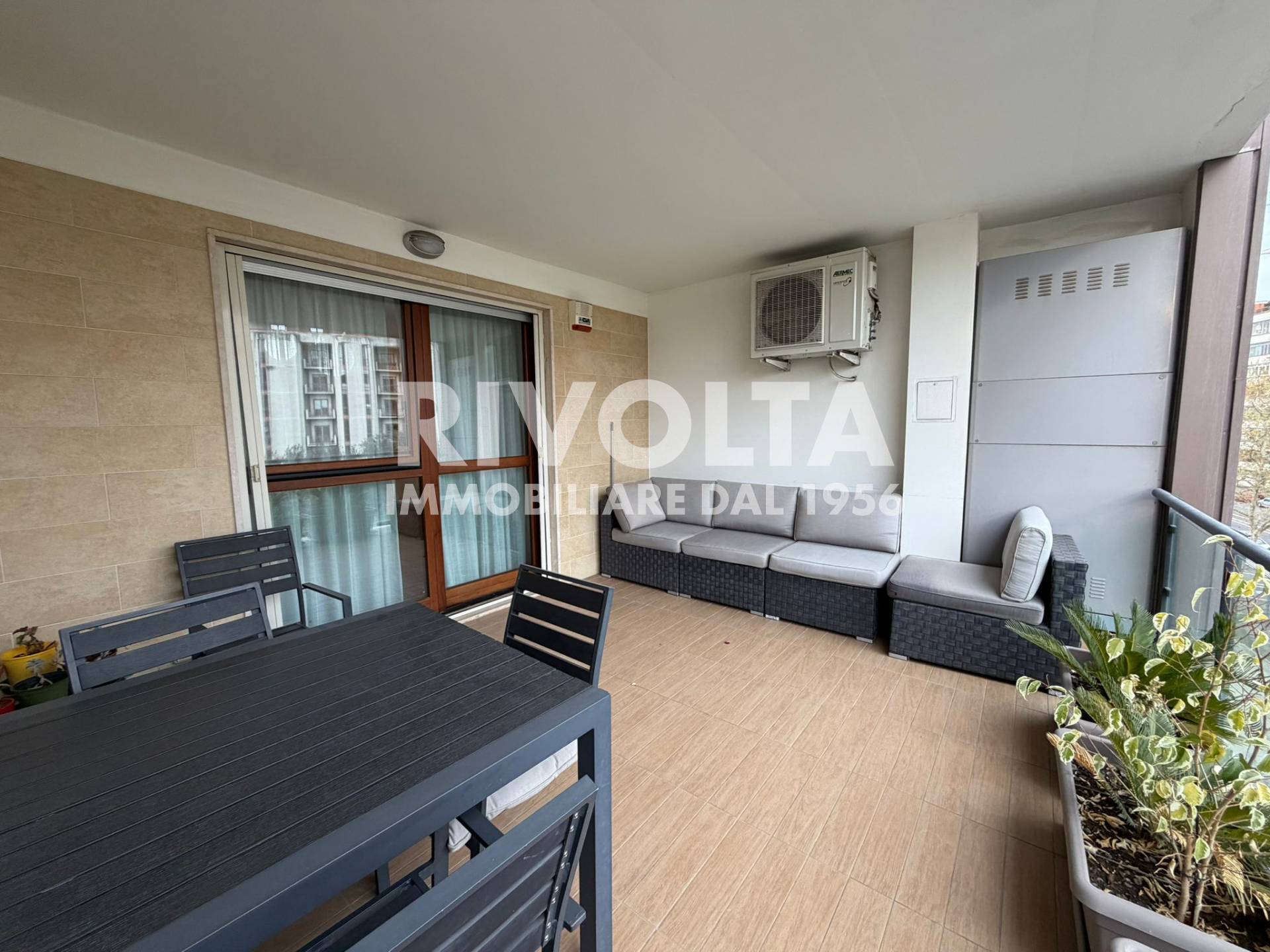 La propriet composta da un ampio soggiorno con cucina a vista, due camere da letto, doppi servizi di cui uno en suite, due balconi e un piacevole terrazzo vivibile.