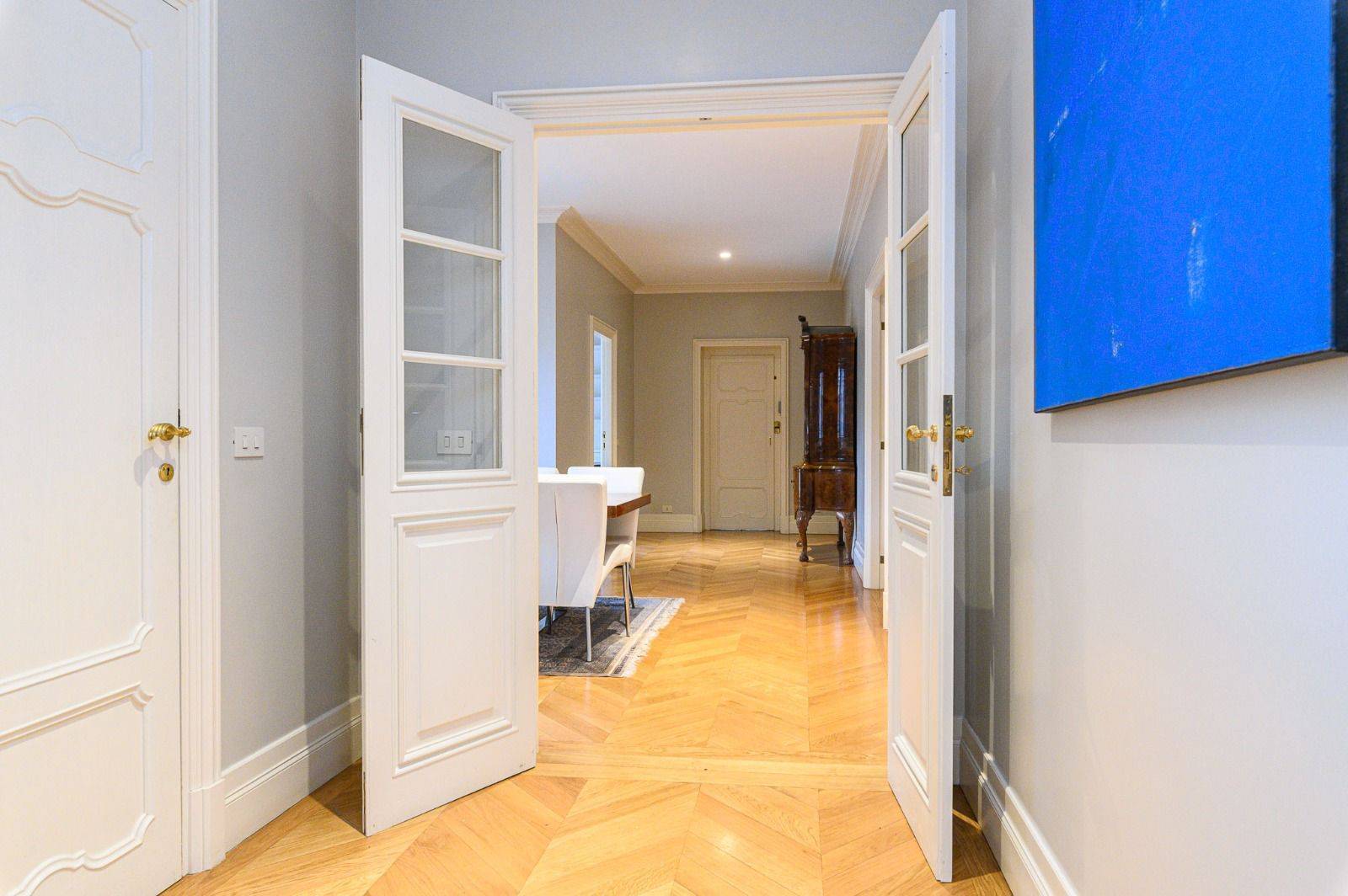 Lappartamento composto da ingresso, salone doppio con accesso direttamente sul terrazzo, sala da pranzo, studio con boiserie e libreria, cucina abitabile arredata con adiacente locale climatizzato, una camera padronale con bagno en suite e cabina armadio, due camere da letto con arredi fissi di pregio, altri due bagni.