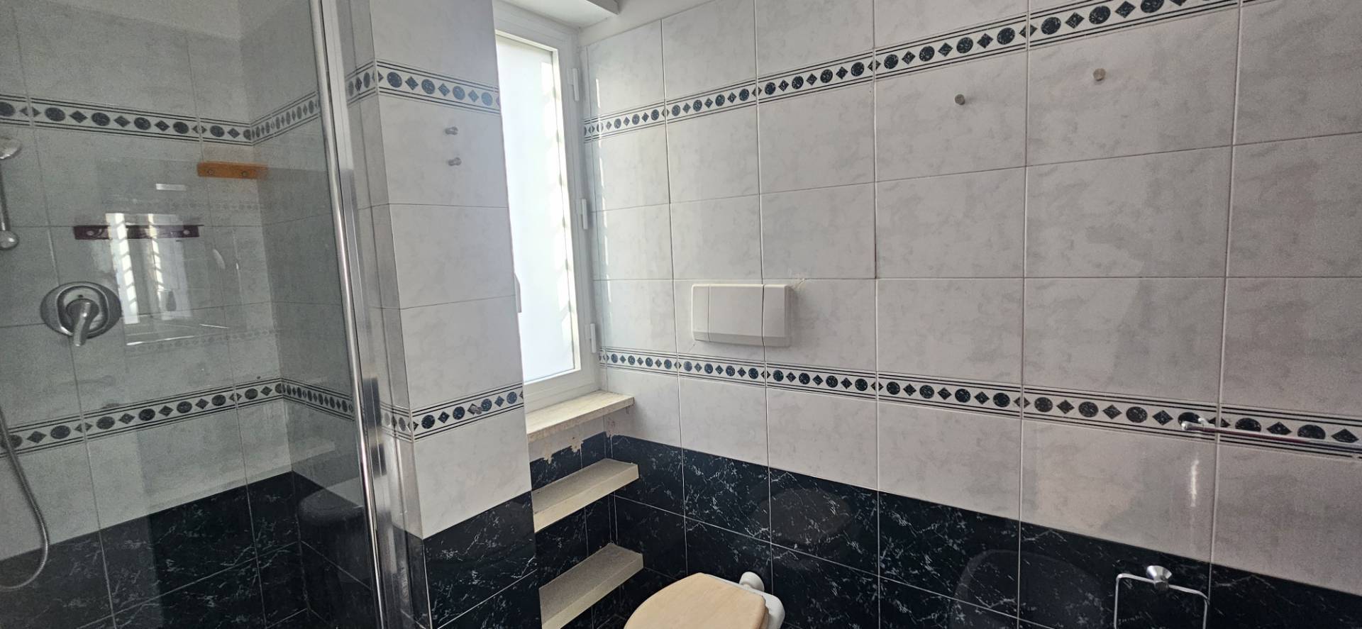 Questo ampio ambiente fornito di un armadio a muro con ante scorrevoli e delle mensole incassate nella parete a semicerchio che offrono un dettaglio delizioso alla camera e un comodo termostato digitale per programmare e regolare la temperatura allinterno della casa. Il bagno si presenta in ottimo stato, con delle maioliche marmorizzate e un lavabo in muratura.