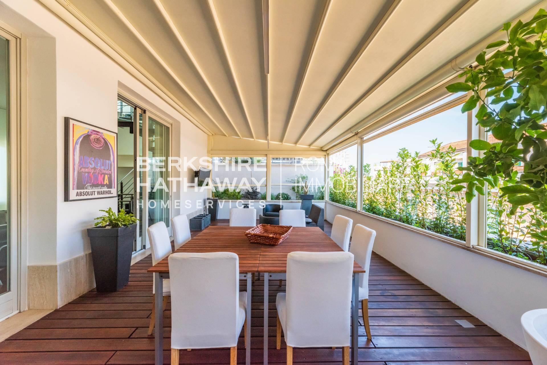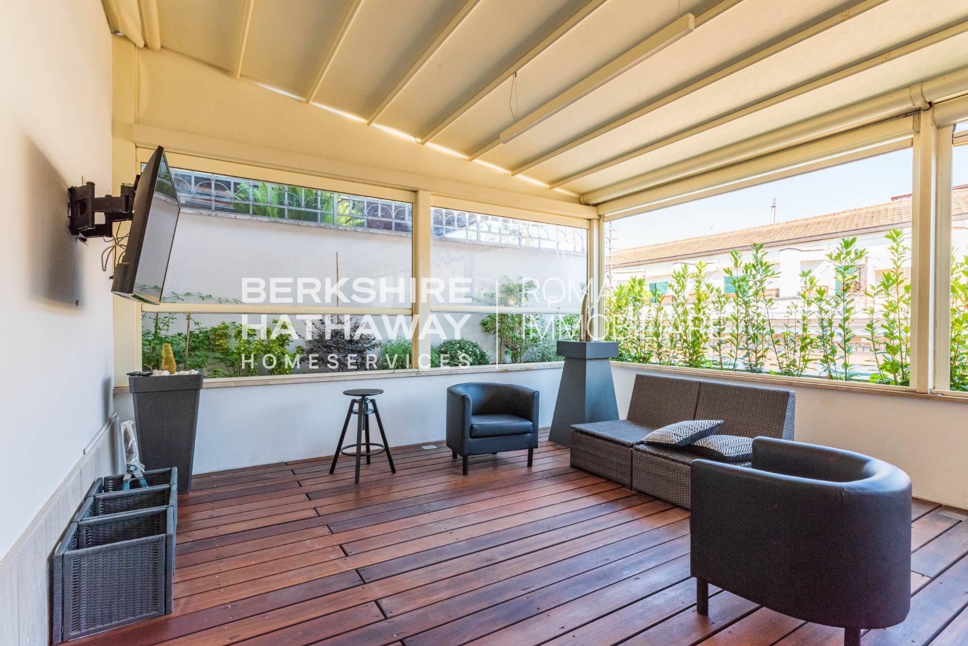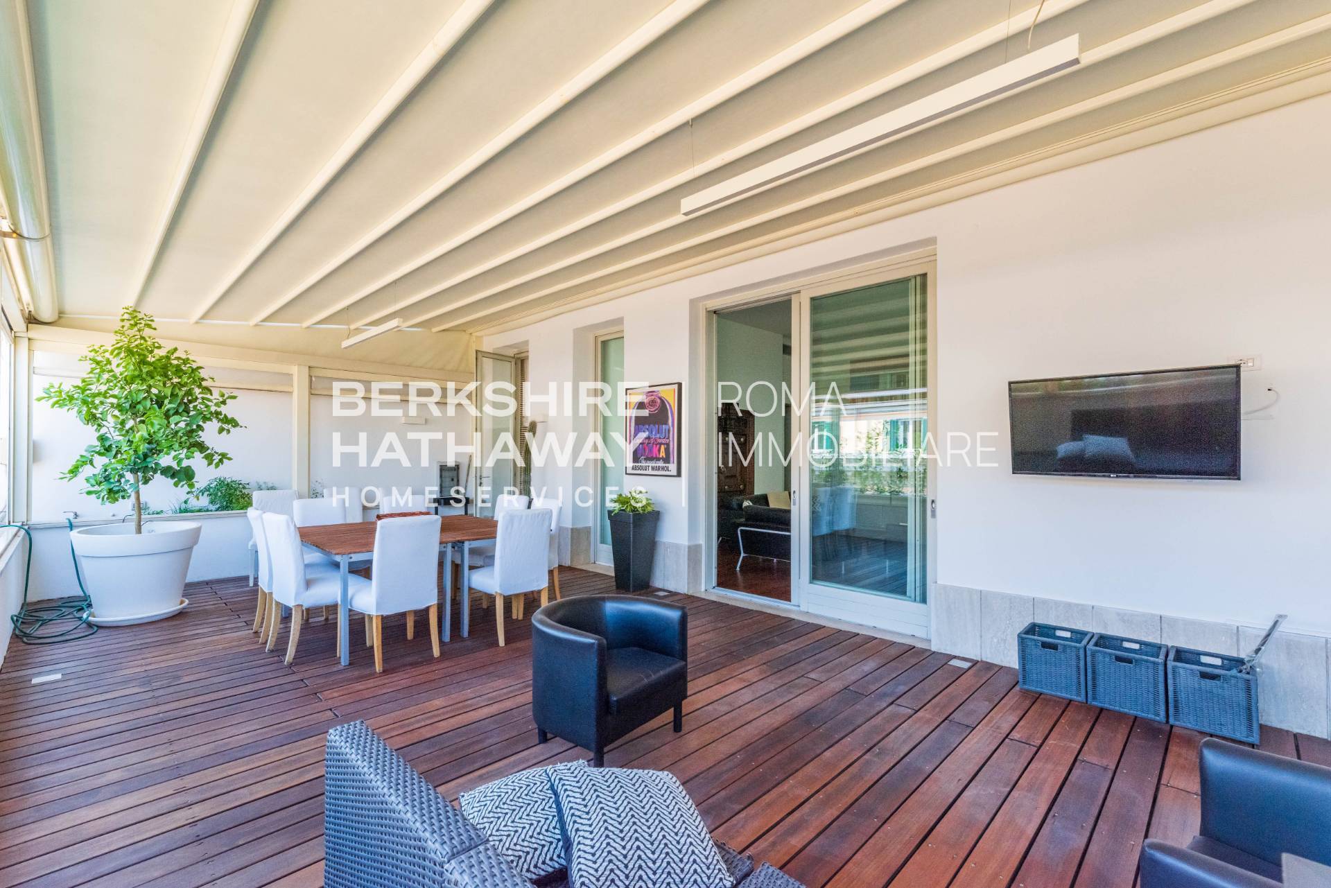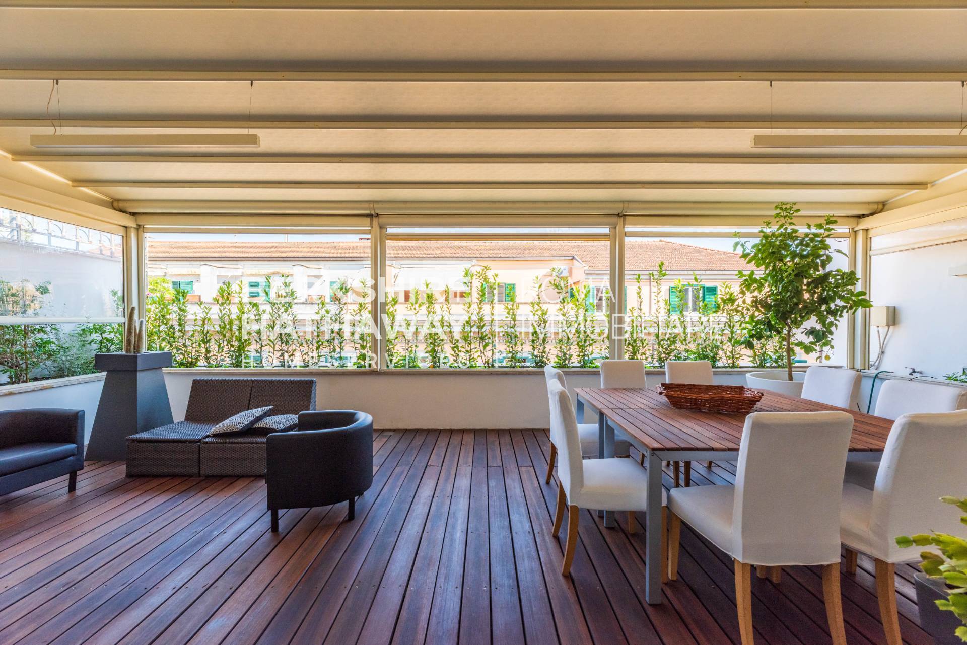 Il piano valorizzato da una SPLENDIDA TERRAZZA DI 60 MQ, perfettamente vivibile, con pavimentazione in legno e TENDAGGIO ELETTRICO RETRAIBILE, ideale per momenti di relax e convivialit allaperto.