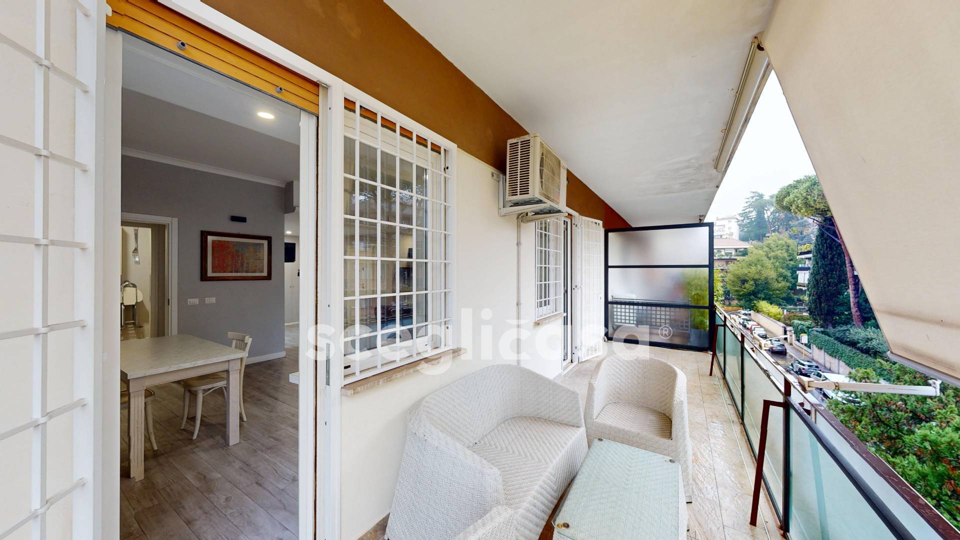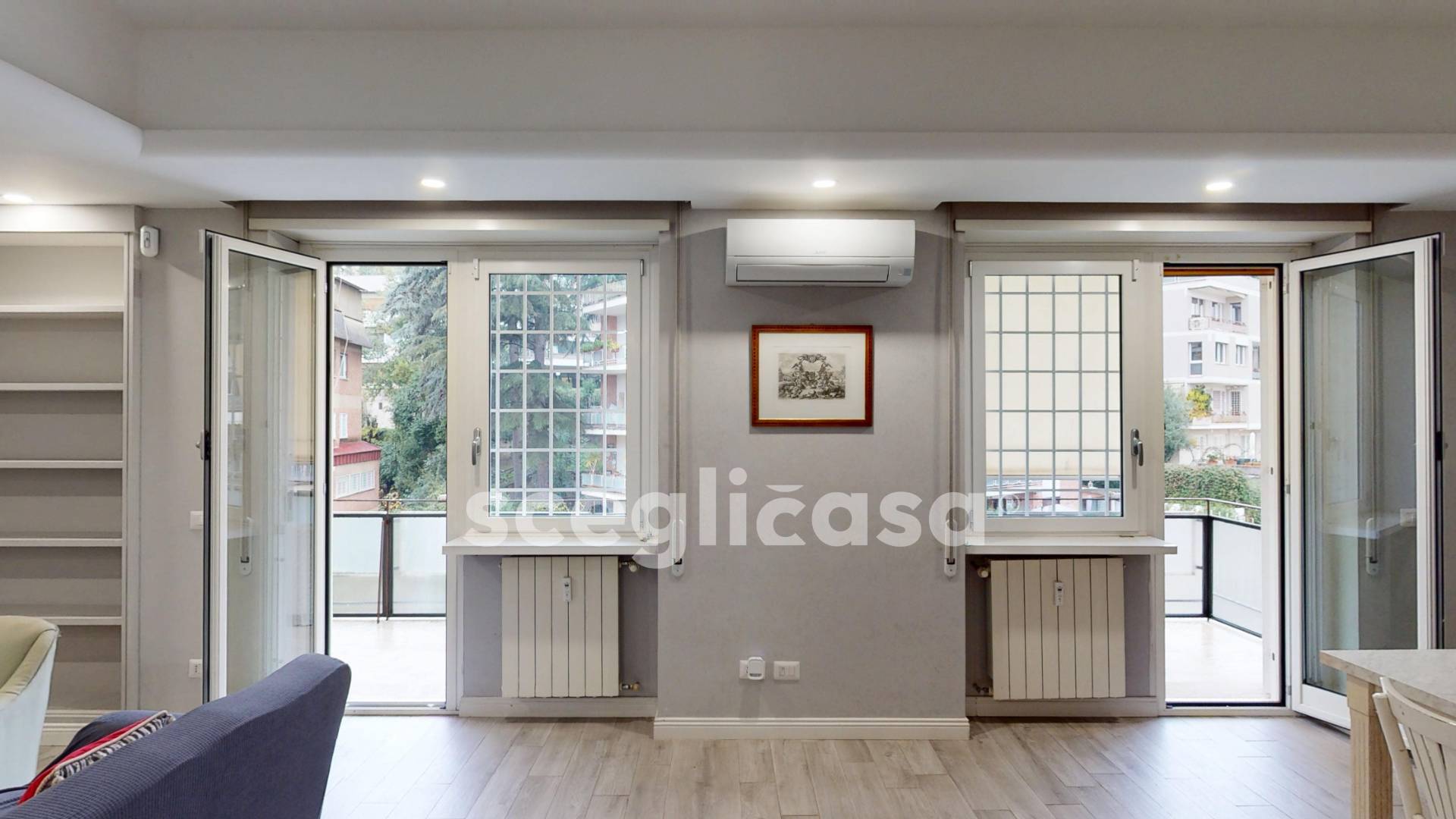 Due camere affacciano su un terzo balcone ampio, con scorci su verde privato, mentre sono presenti armadi a muro integrati nel corridoio di disimpegno.