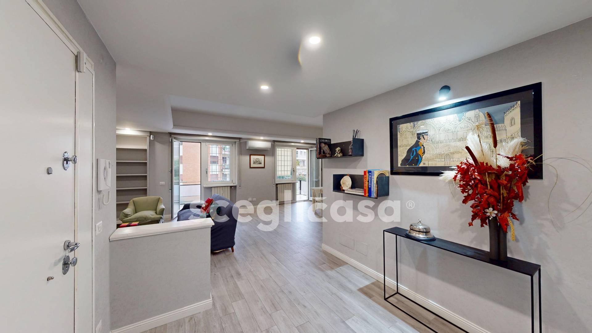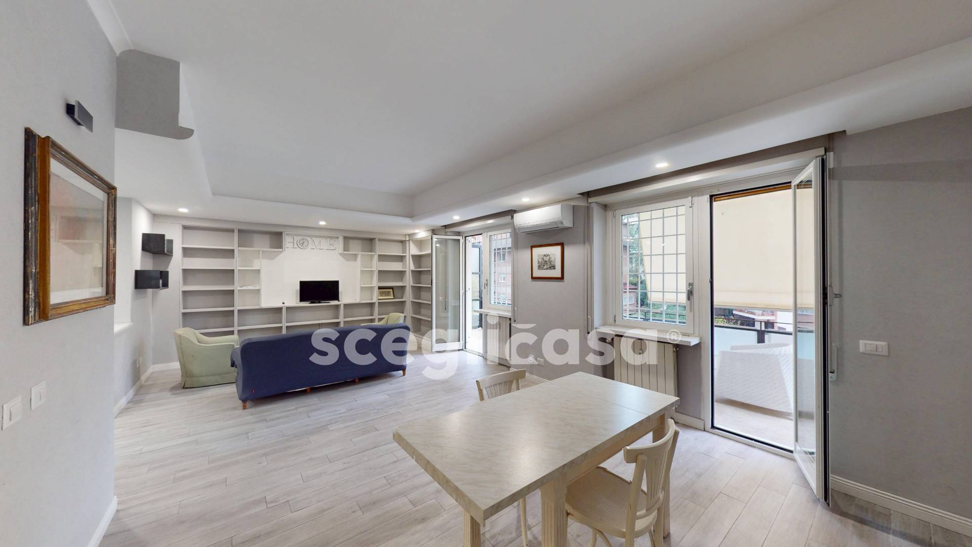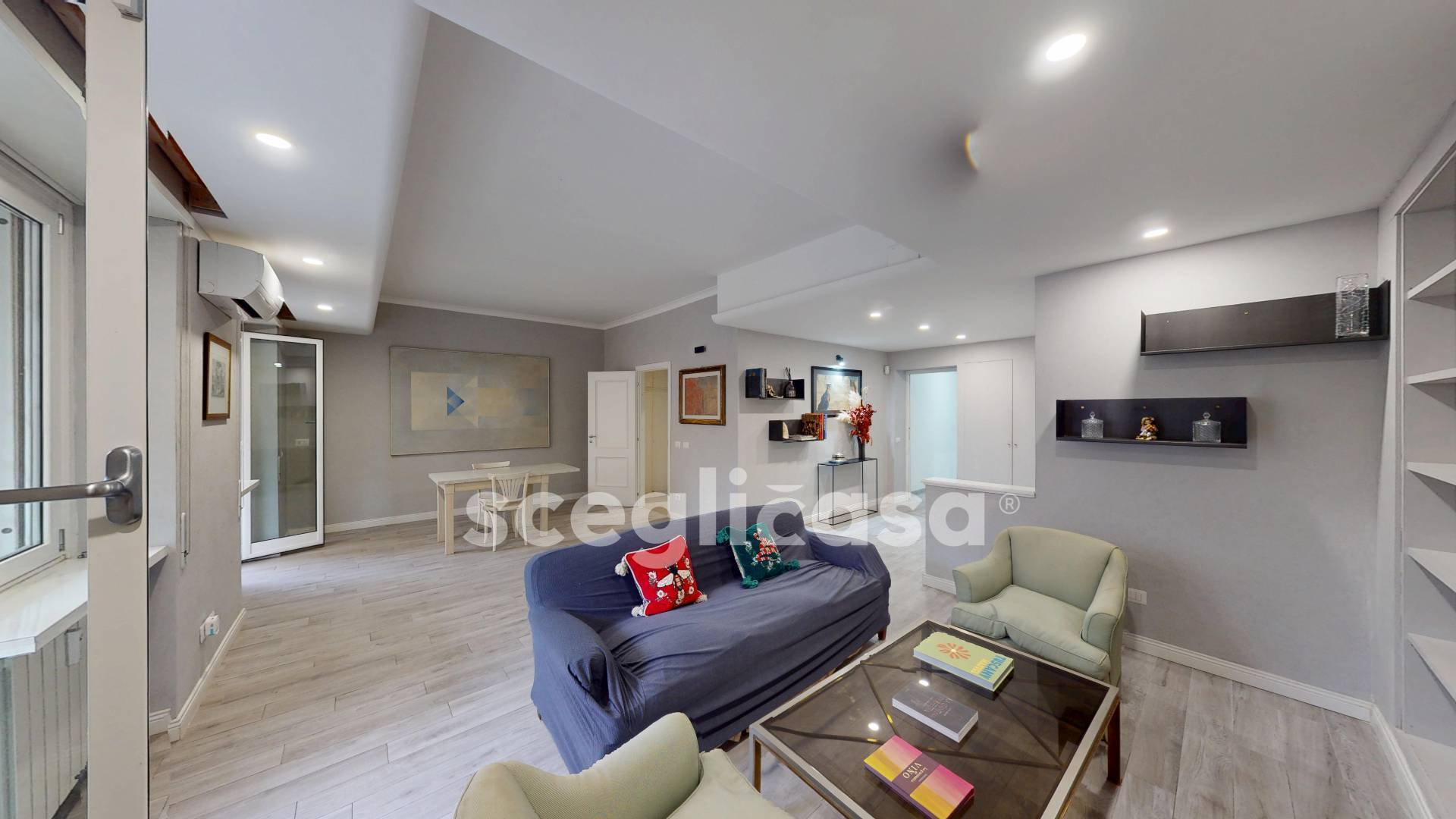 Lingresso conduce a un grande salotto-pranzo di circa 45 mq, vero fulcro della casa: uno spazio aperto e accogliente, valorizzato da una parete attrezzata su misura, illuminazione con faretti incassati e ampie superfici vetrate che garantiscono luce naturale durante tutta la giornata.