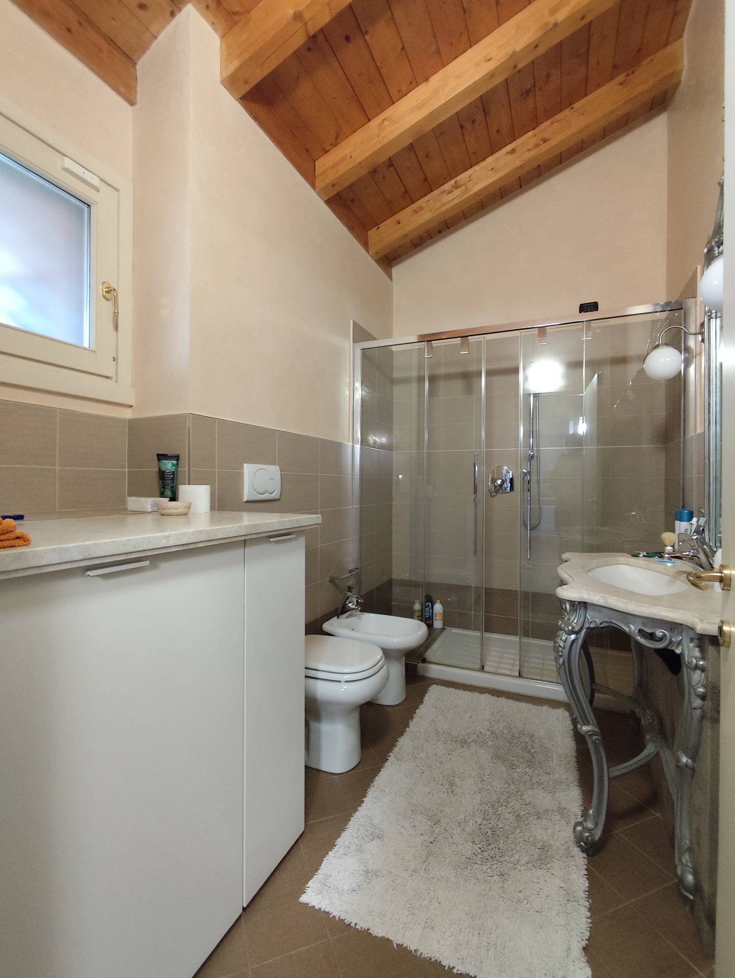 Il bagno, finestrato e moderno, dotato di una spaziosa doccia.