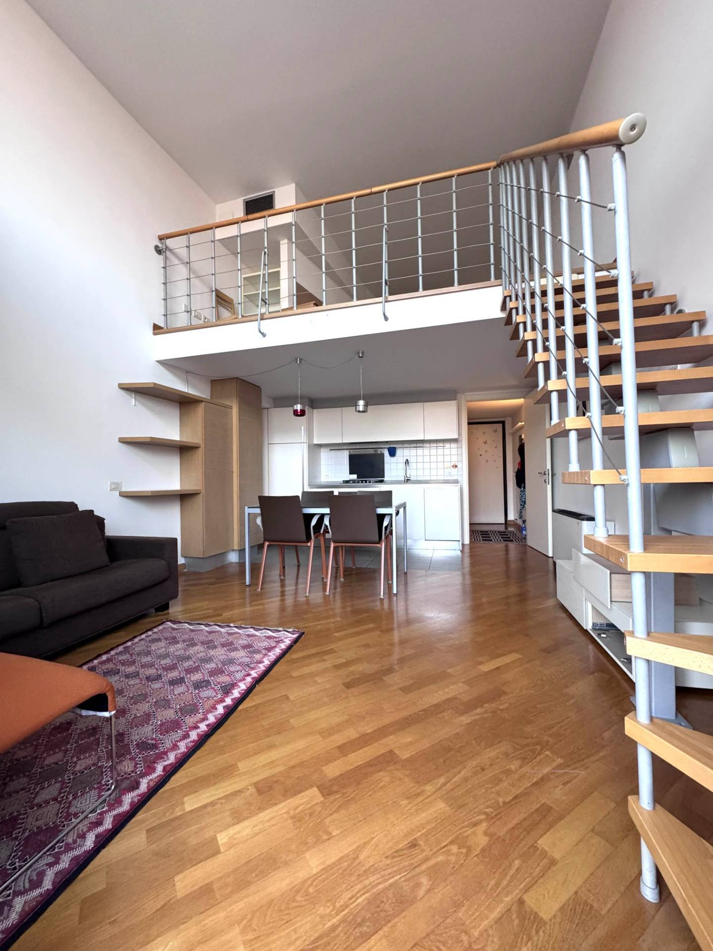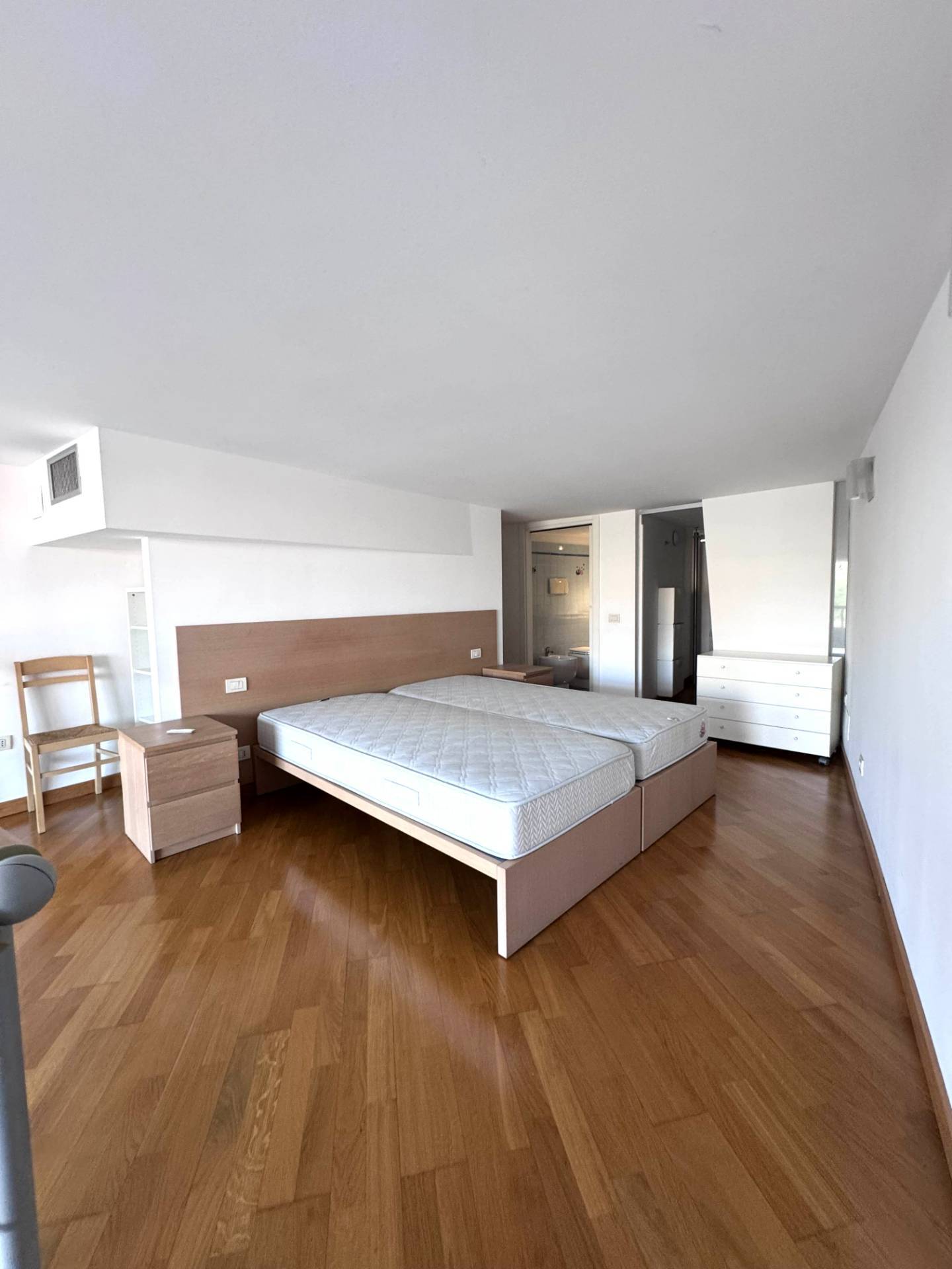 Dal soggiorno si accede al piano superiore (soppalco) dove vi la zona notte, la cabina armadio e il secondo bagno.