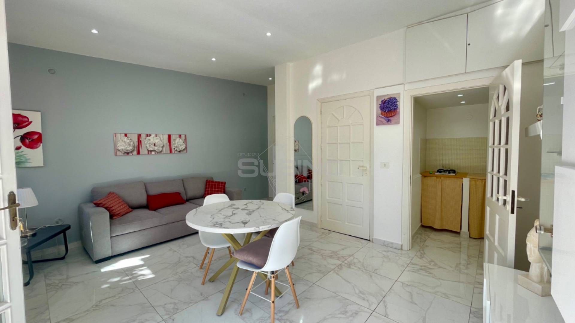 Internamente l'immobile si presenta con ingresso sul soggiorno con cucinino, camera da letto, due bagni di cui uno in camera ed una piccola cameretta.