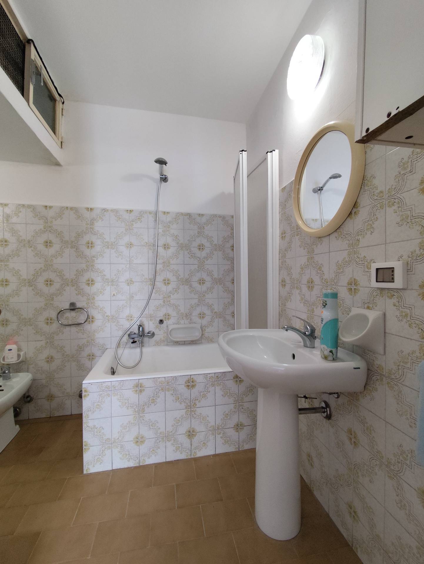 Completa la soluzione un bagno dotato di vasca e lavatrice, funzionale e comodo.