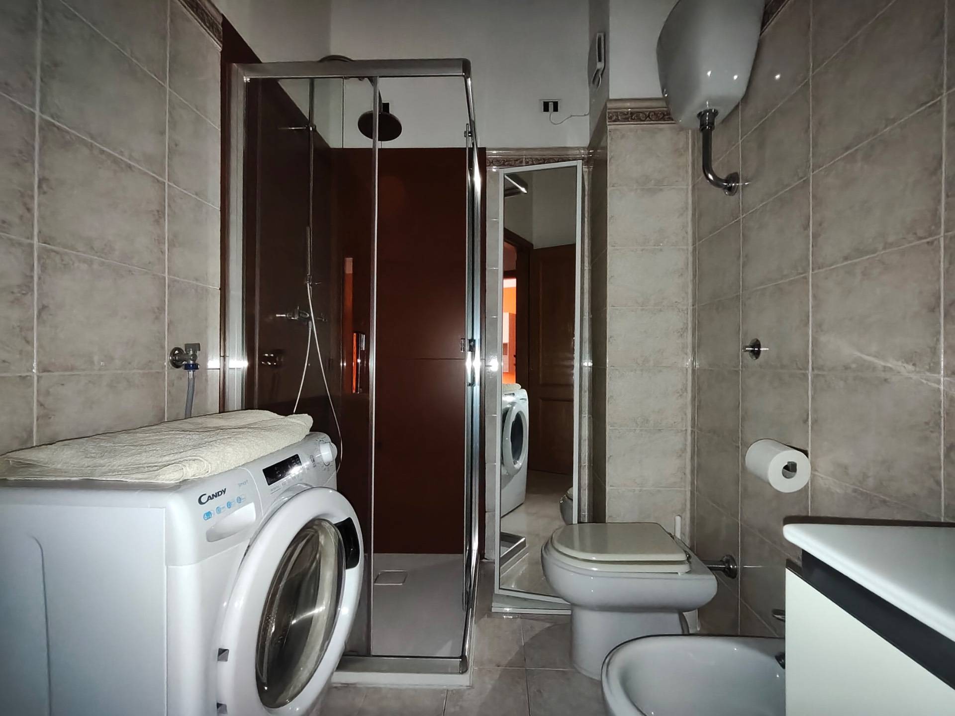 Il bagno, rifinito con cura, dispone di un moderno box doccia e di una zona lavanderia attrezzata.