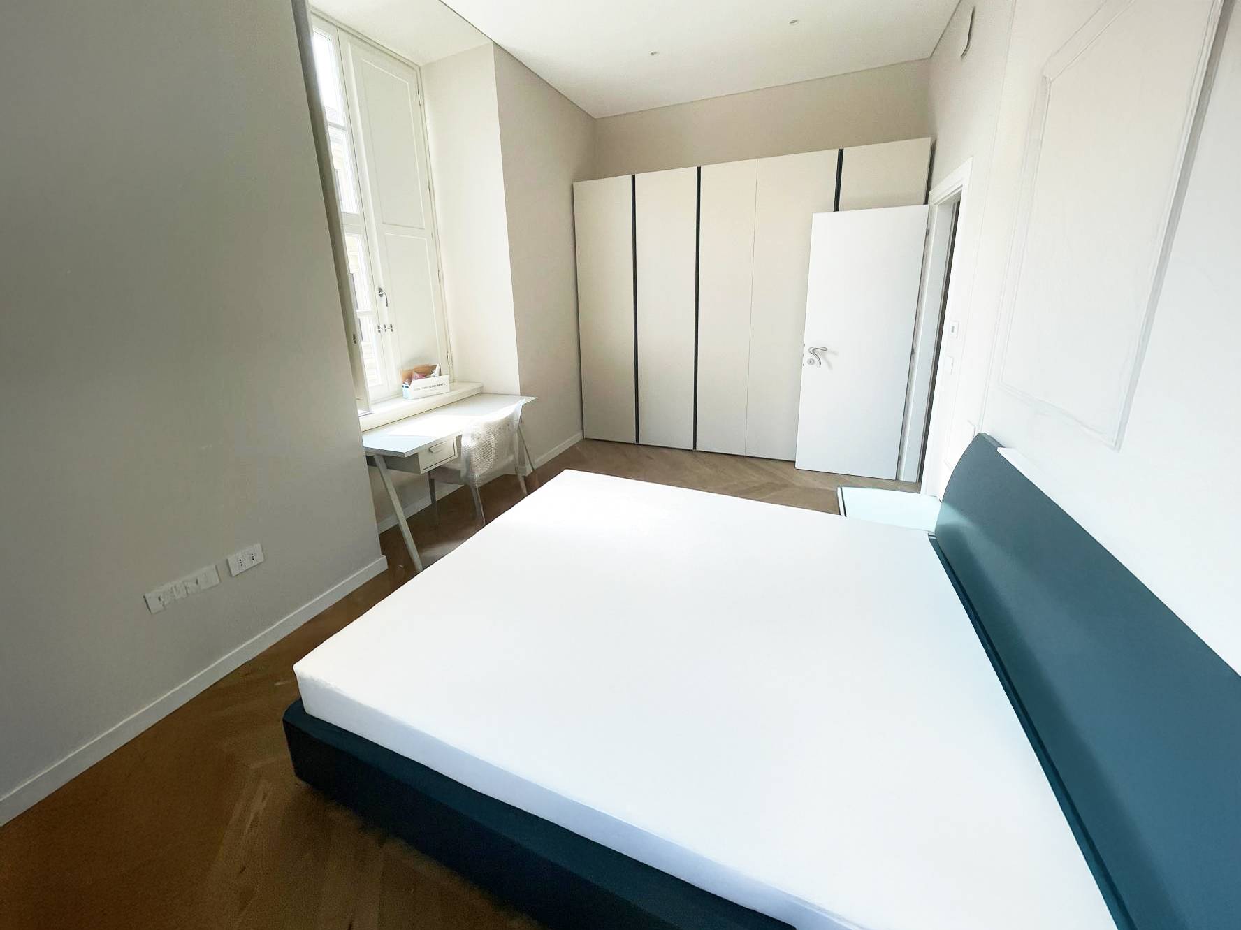 La camera dotata di doppio affaccio, su Via Alfieri e su Via Arsenale, mentre il salotto affaccia su Via Arsenale, e non dotato di balconi.