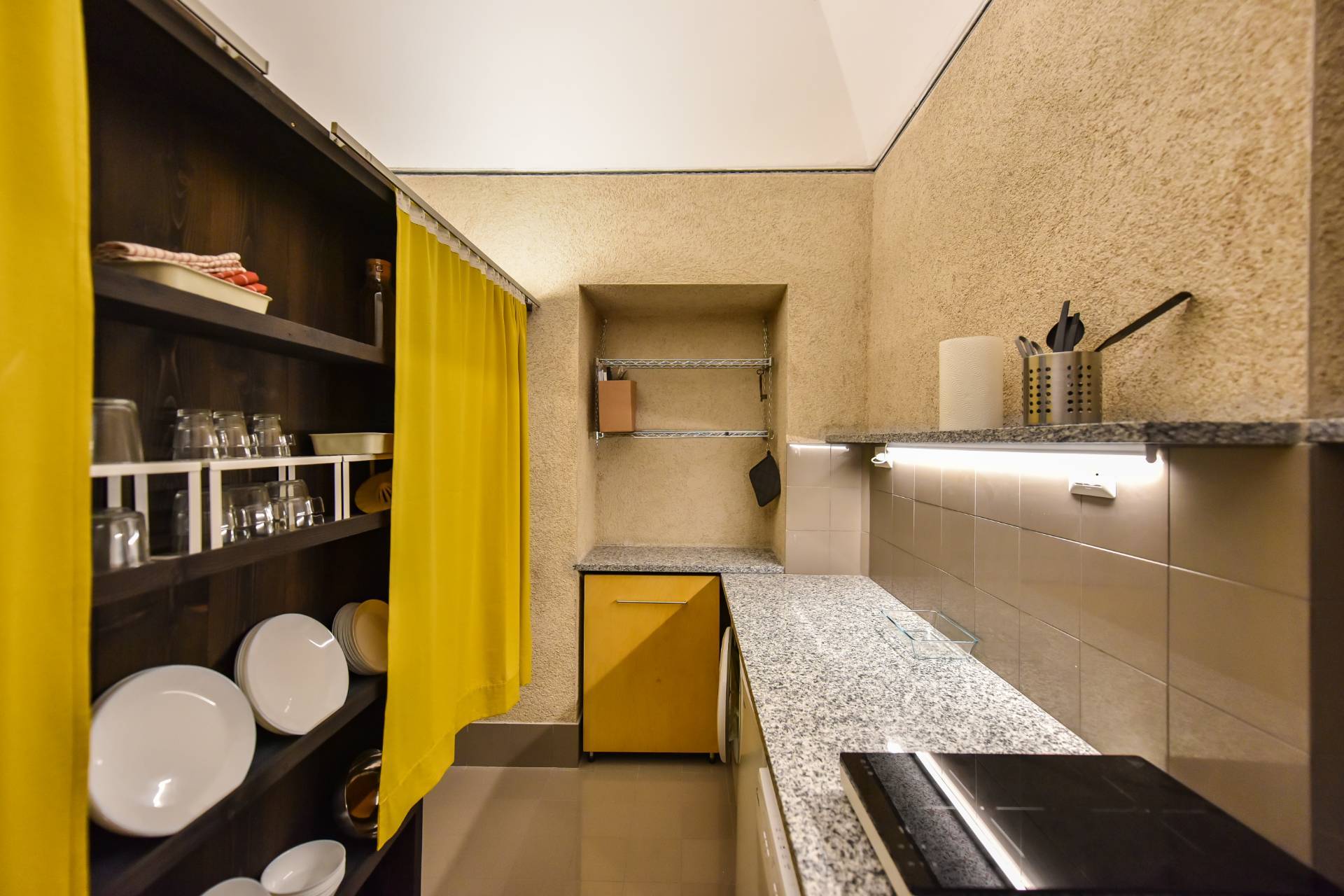 Al fondo della sala da pranzo, divisa da un elegante separ, la zona cucina con il piano cottura ad induzione e il lavandino, oltre a lavastoviglie e ampio piano di lavoro.