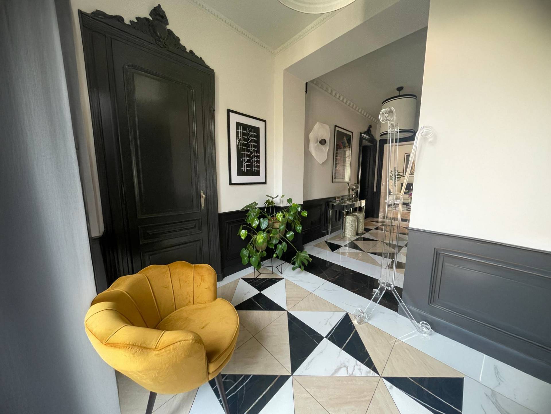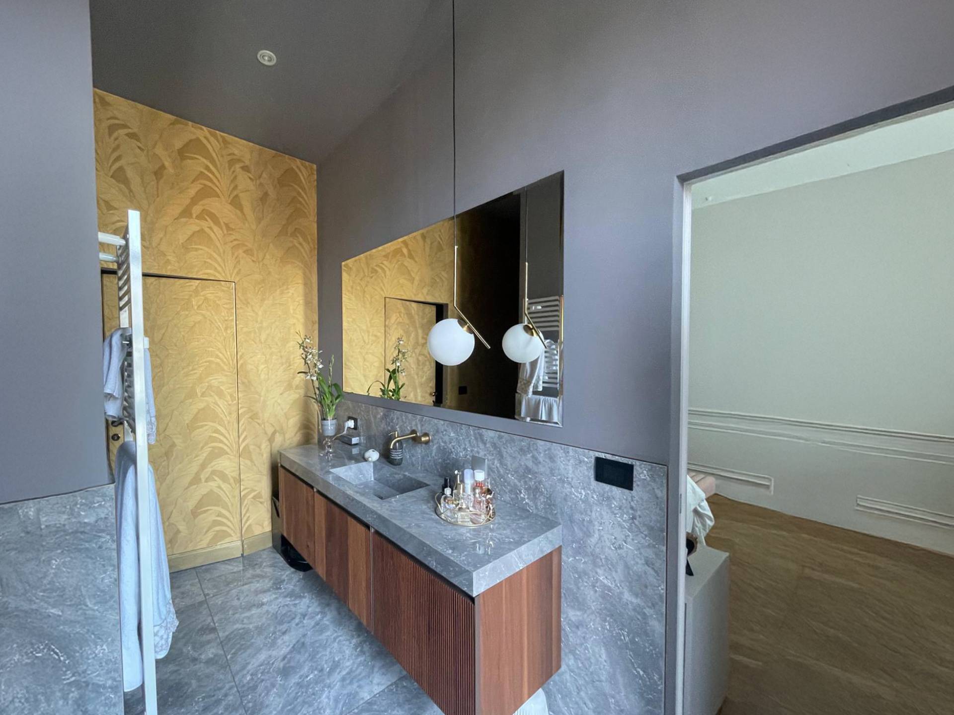 Internamente risulta cos composto: ampio ingresso, salone triplo con cucina a vista, arredata ed equipaggiata, zona pranzo e zona divani tv, tre camere da letto di cui una con cabina armadi e bagno in suite con affaccio su interno cortile, e altres presente un ulteriore ambiente adibito a studio.