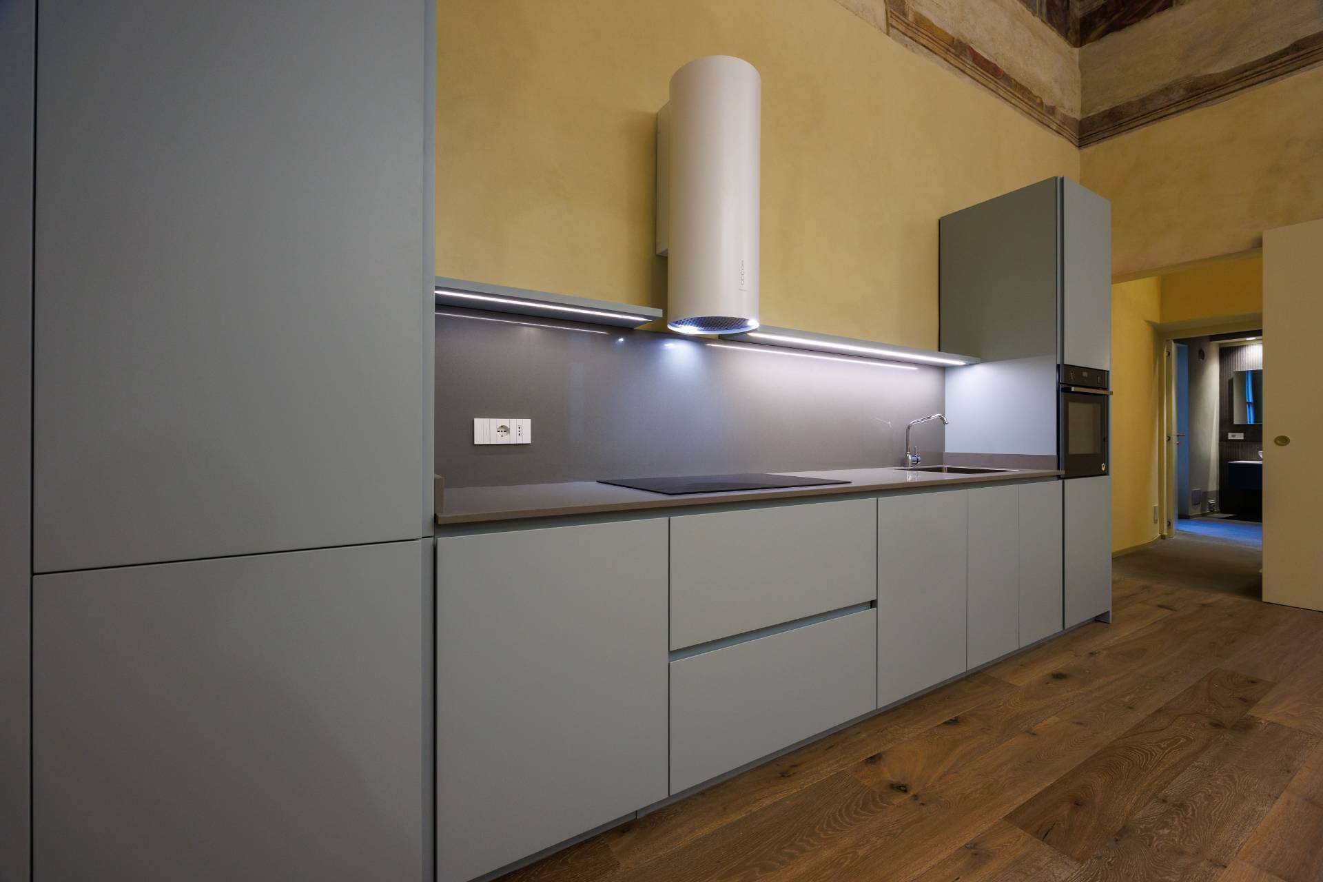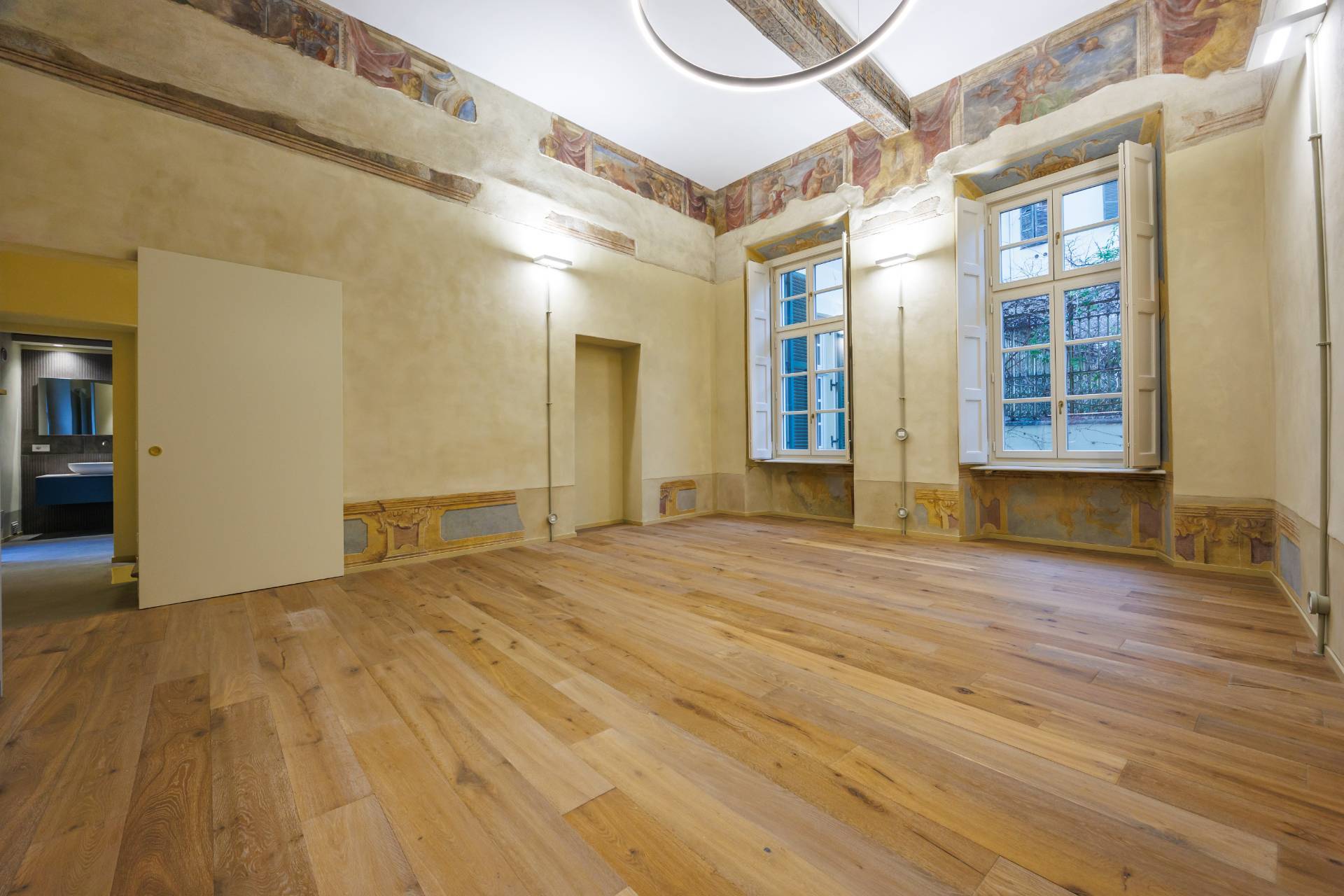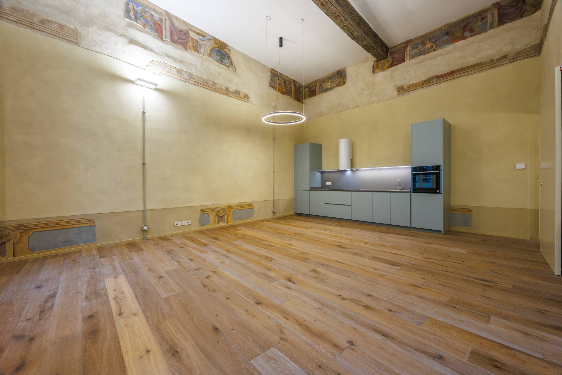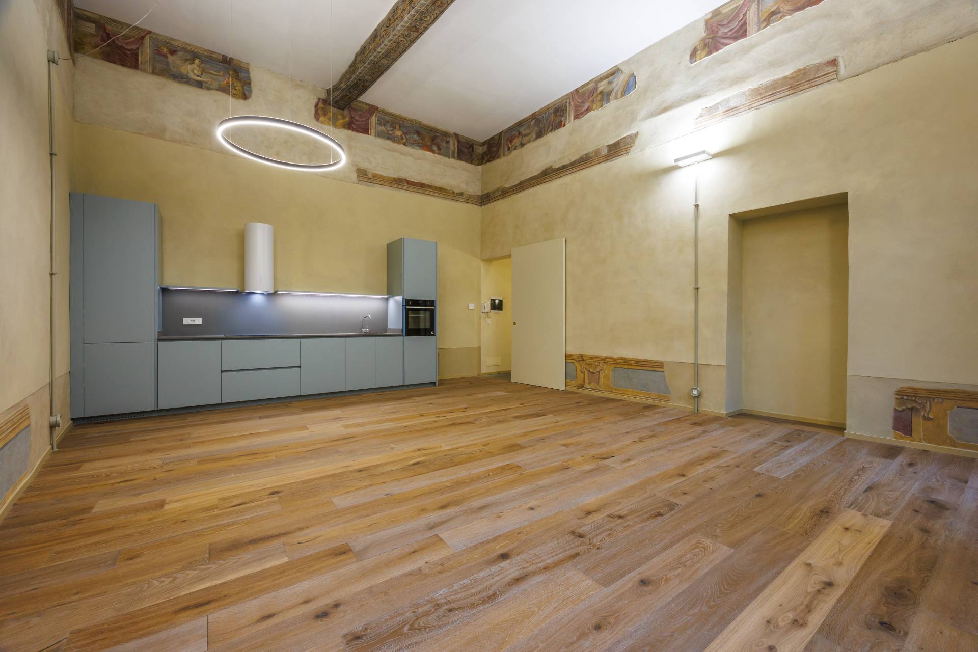 L'ingresso indipendente dal cortile condominiale, tramite una scala porta direttamente al magnifico salone, di circa 40 mq, con soffitti molto alti, travi a vista decorate e affreschi originali restaurati, corredato di cucina a vista.