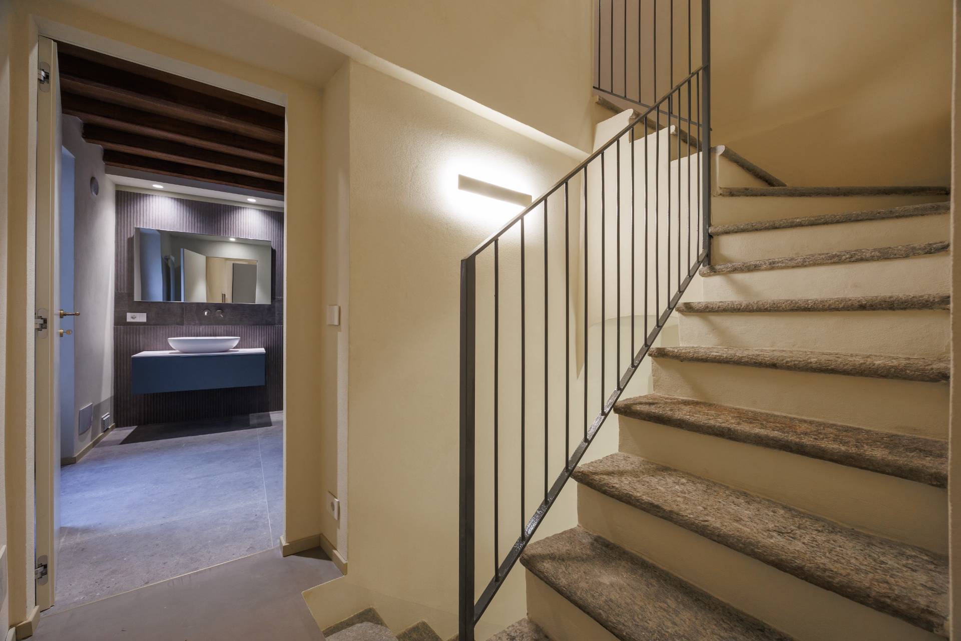 La scala prosegue per portare ad un soppalco ad uso deposito composto da una lavanderia e da due vani finestrati.