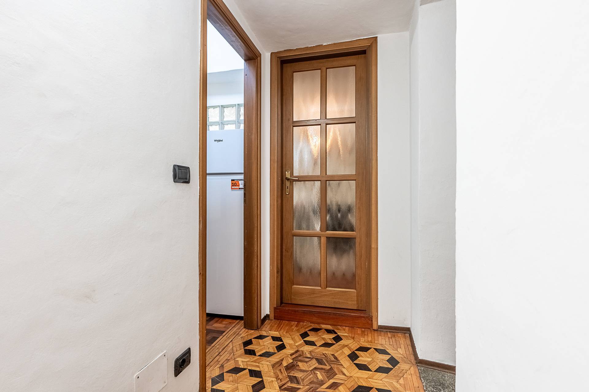 Ingresso, cucina, salotto, due camere (una con letto alla francese, l'altra con due letti separati), bagno con lavatrice, ripostiglio.