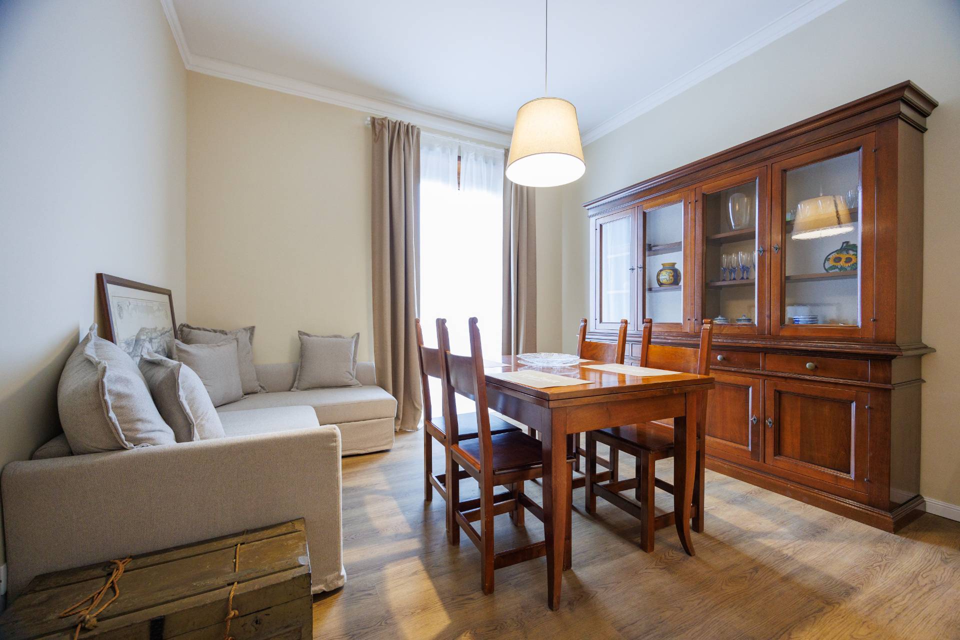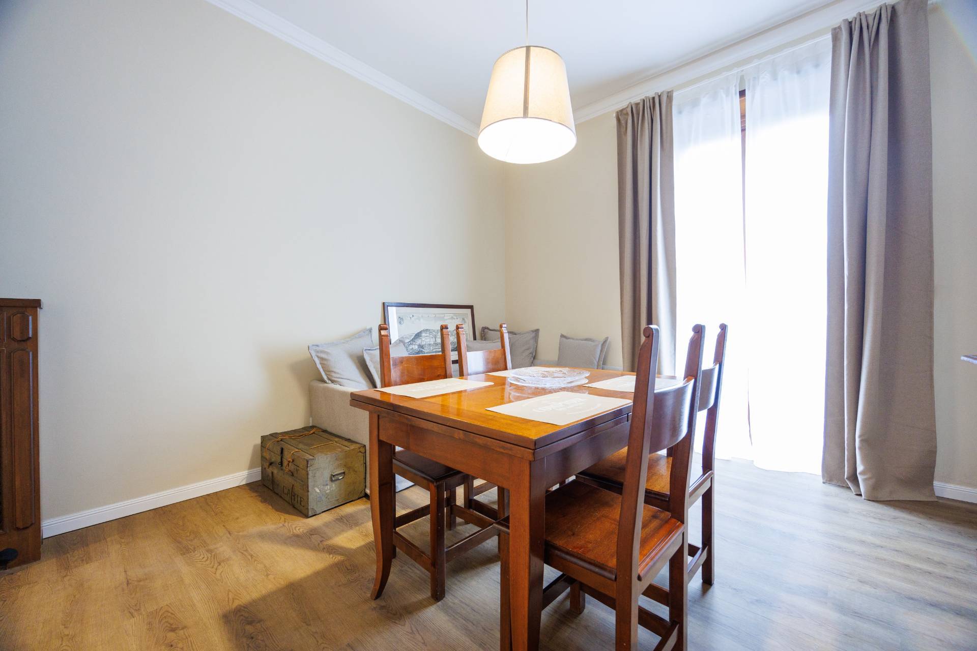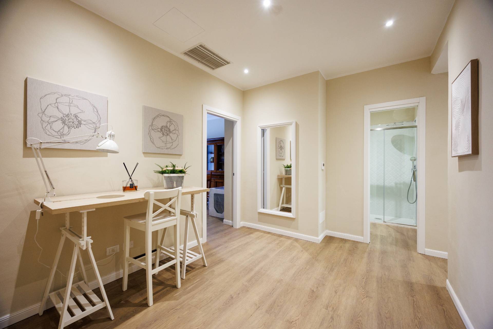 Luminoso e tranquillo l'appartamento composto da un ampio ingresso in cui stata ricavata una zona studio, uno spazioso soggiorno con cucinino a vista, una camera da letto matrimoniale, una cameretta e due bagni.