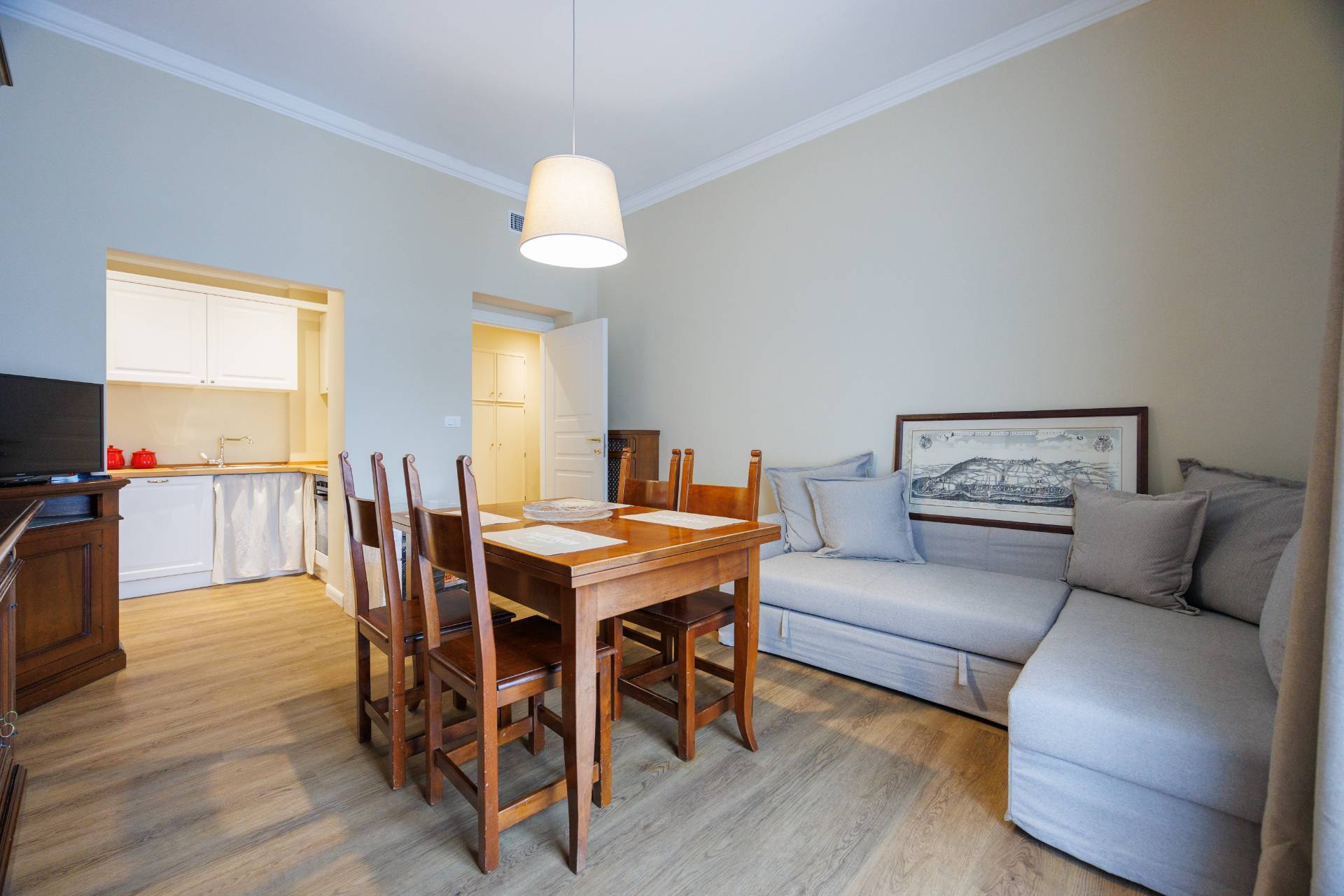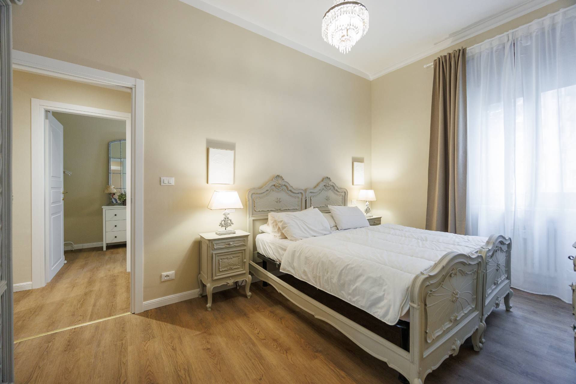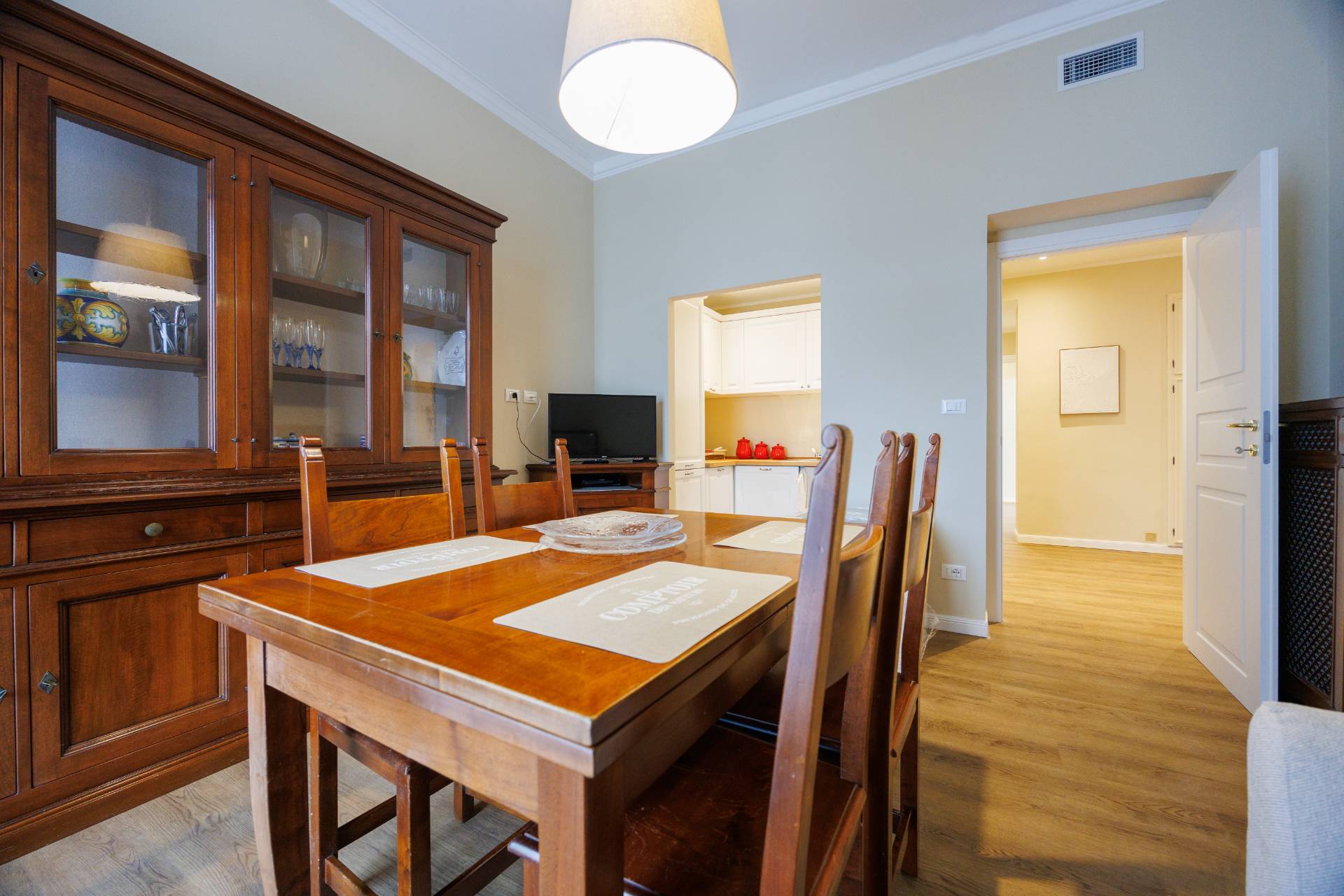 Luminoso e tranquillo l'appartamento composto da un ampio ingresso in cui stata ricavata una zona studio, uno spazioso soggiorno con cucinino a vista, una camera da letto matrimoniale, una cameretta e due bagni.