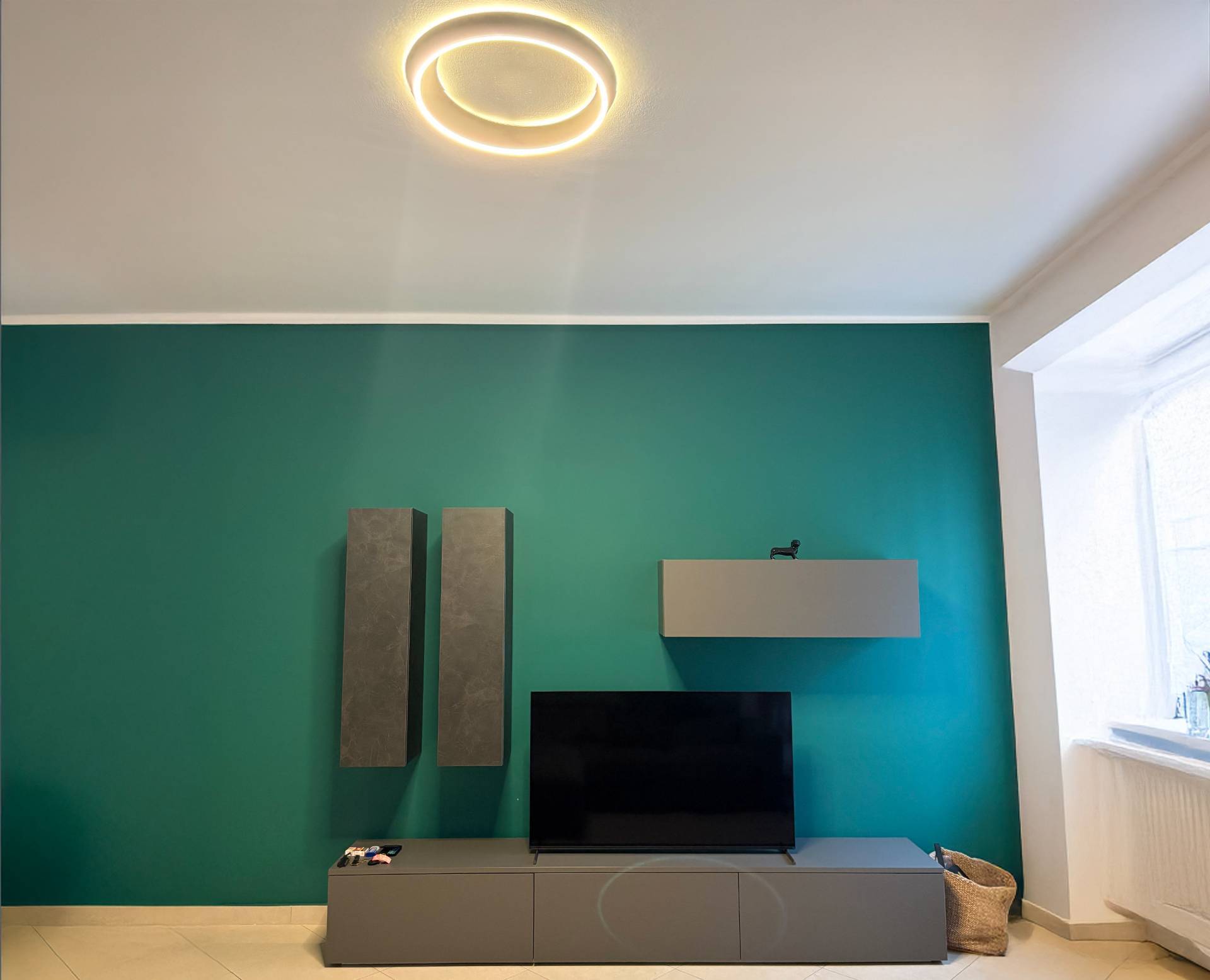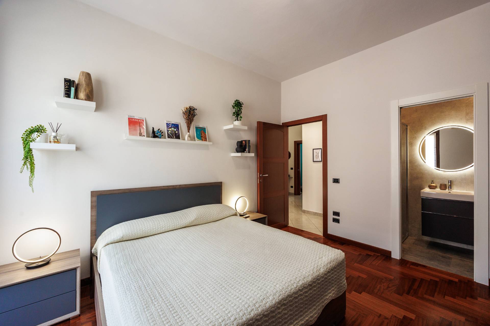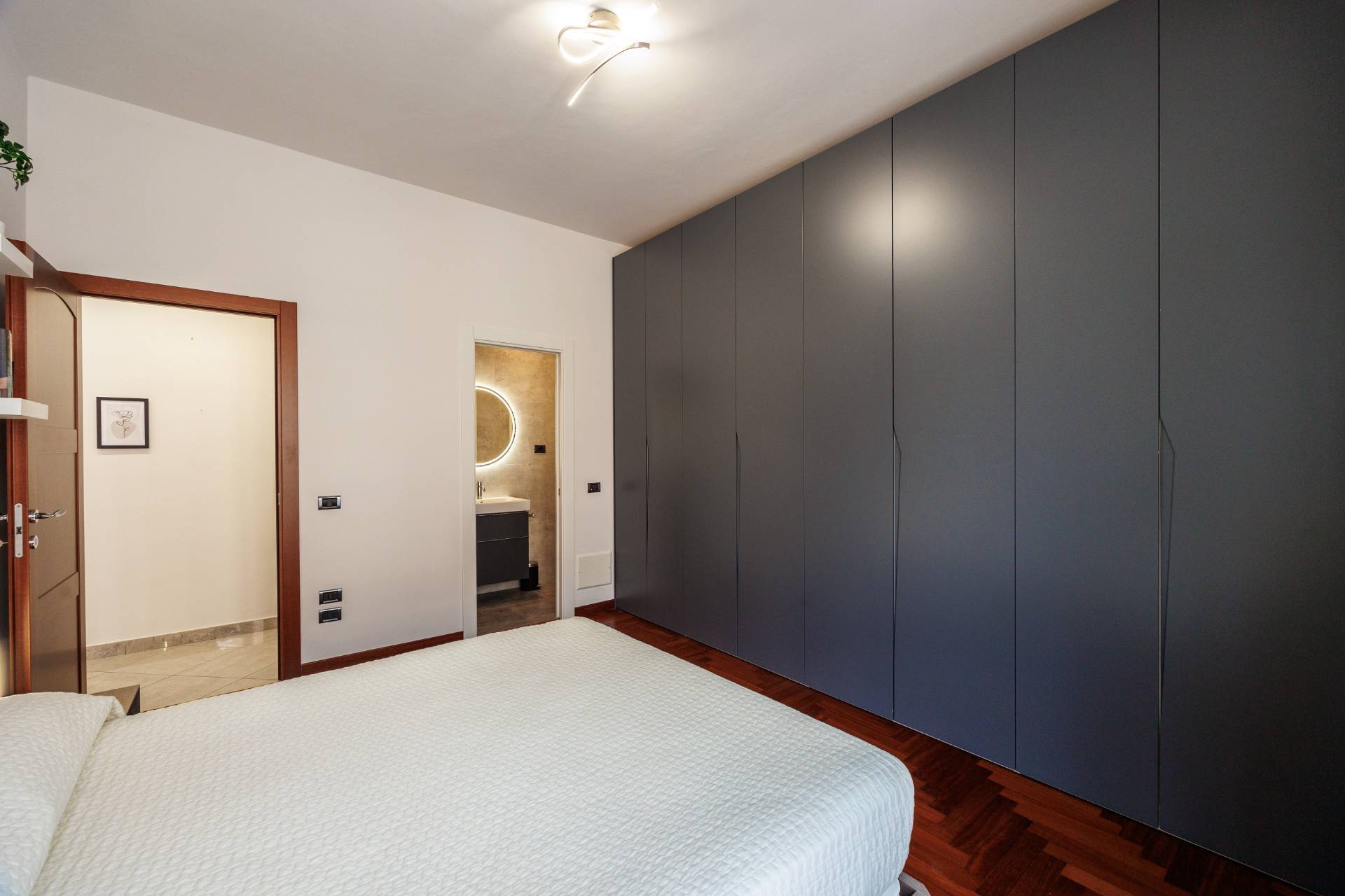 L'appartamento composto da ingresso, ampio soggiorno con cucina a vista, due camere da letto di cui la padronale con il bagno en suite, bagno e rispostiglio.