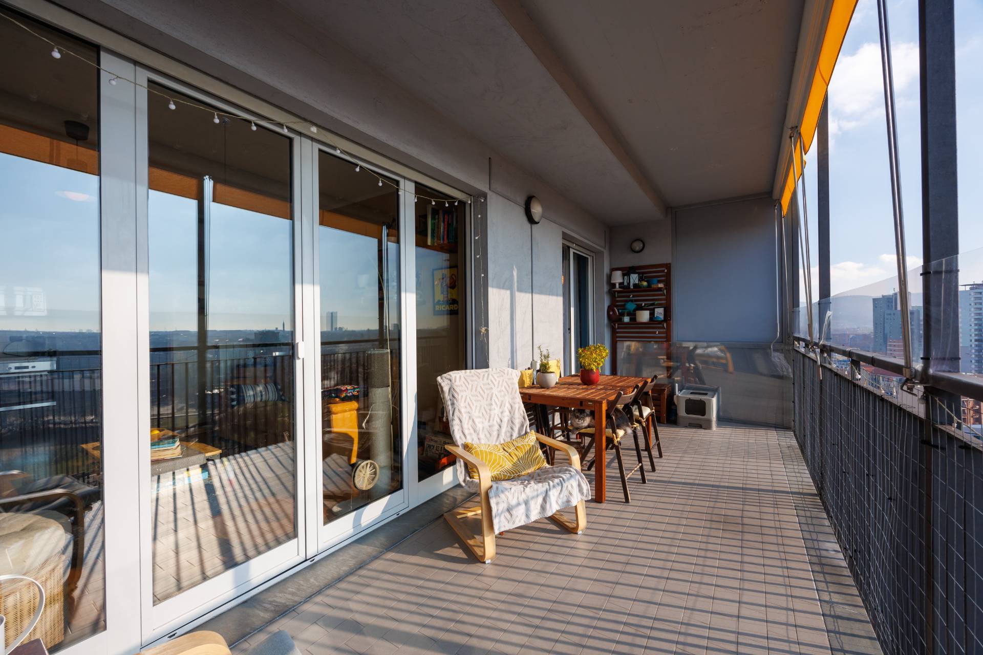 Il moderno grattacielo, servito da doppi ascensori e protetto da portineria, stato edificato nel 2005. L'immobile composto da ingresso su zona living con cucina a vista e salone, camera da letto, bagno e ampio terrazzo, e viene affittato parzialmente arredato.