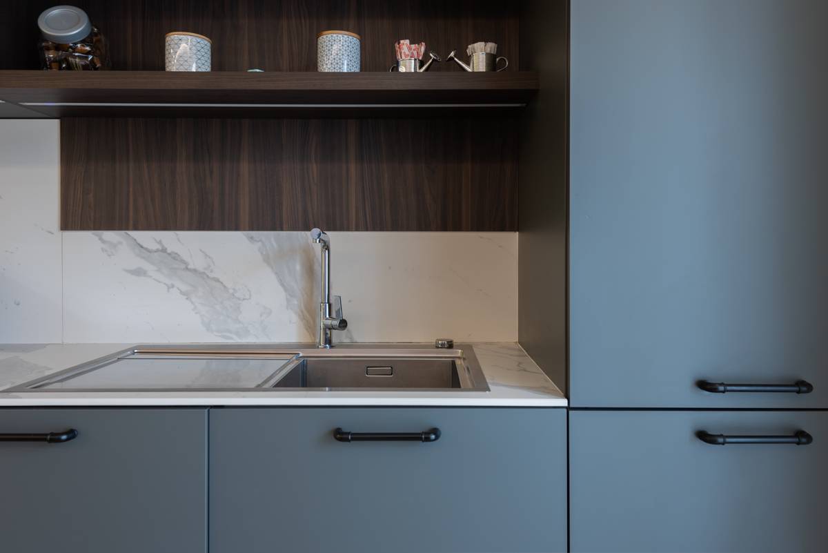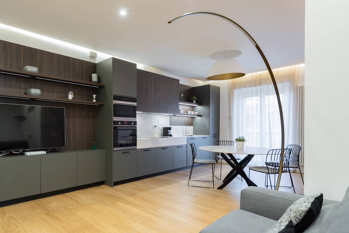 L'ingresso si apre su un ampio soggiorno arredato con gusto, dotato di zona living, zona pranzo e cucina a vista, completamente attrezzata con elettrodomestici moderni e finemente arredata con mobili di alta qualit.