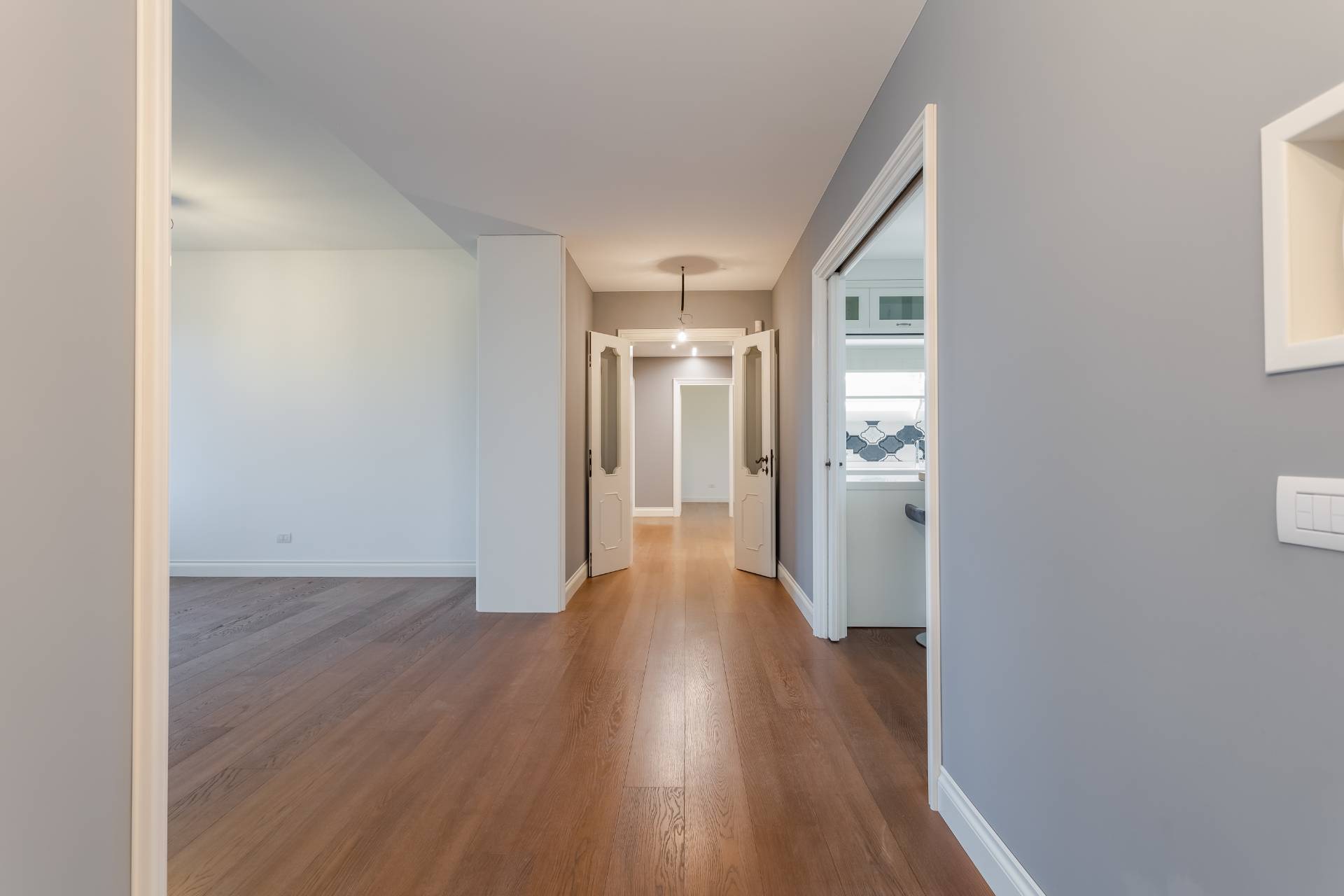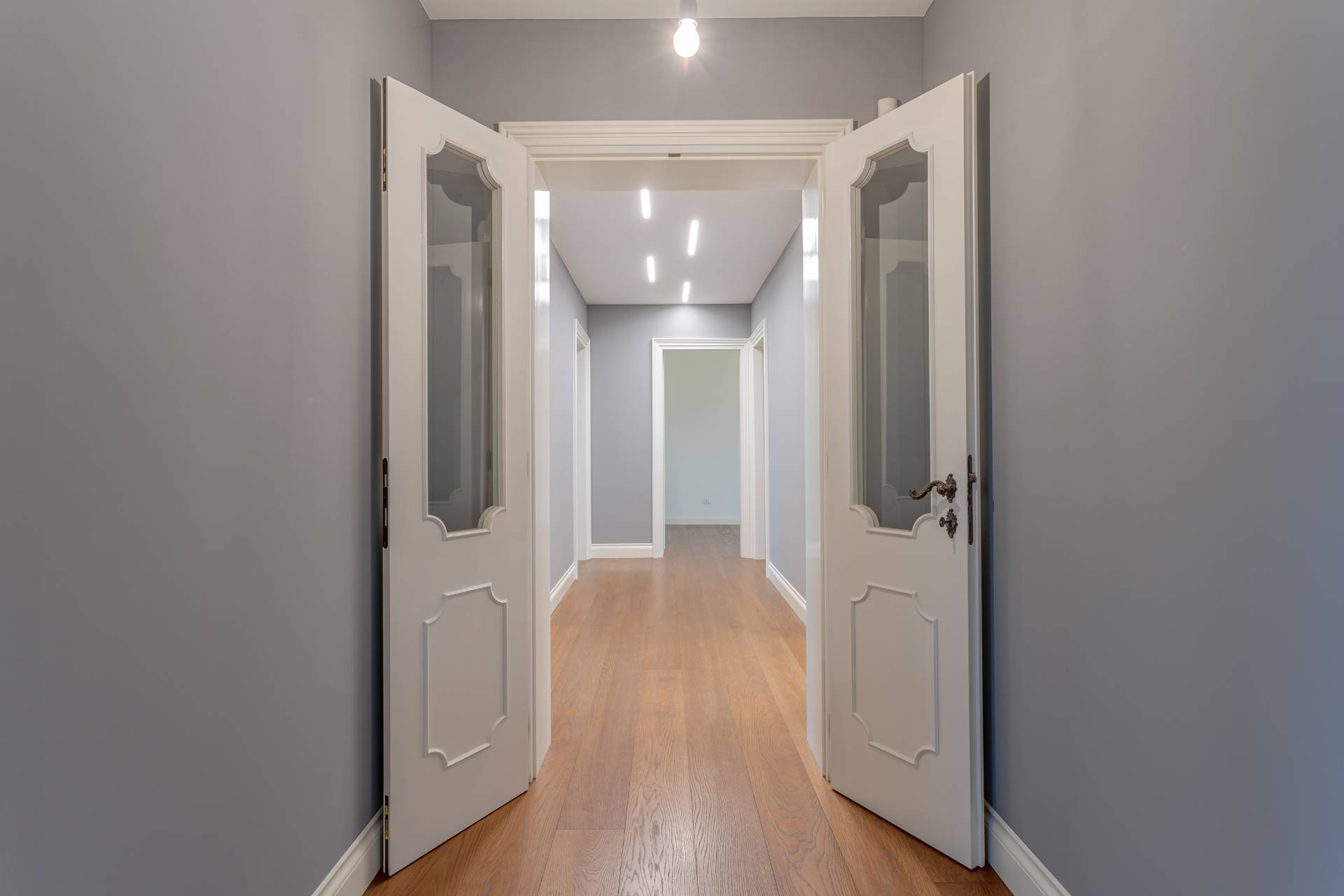 Le porte interne sono in legno massello laccato bianco.