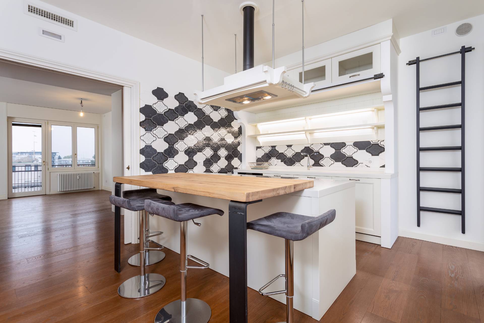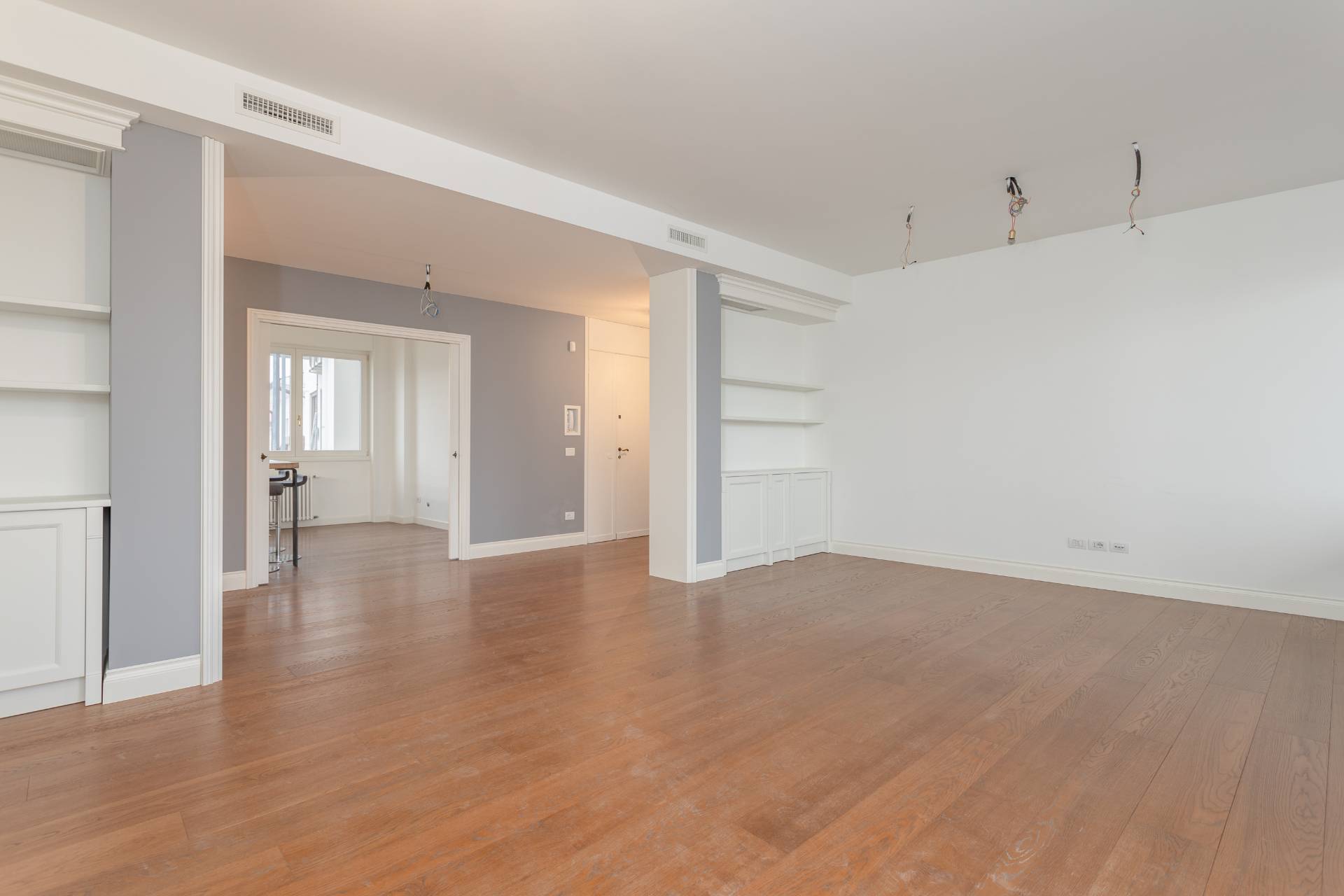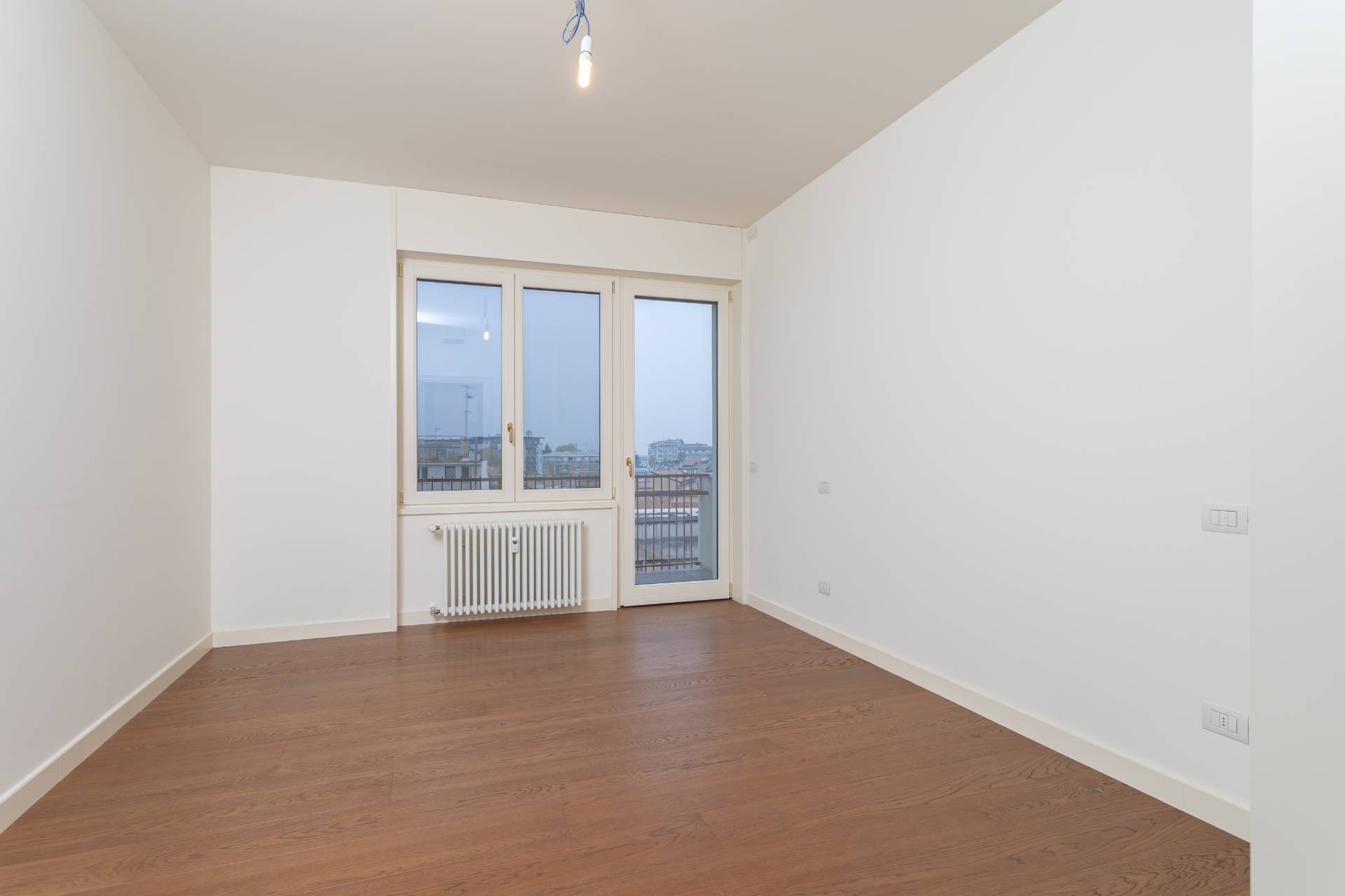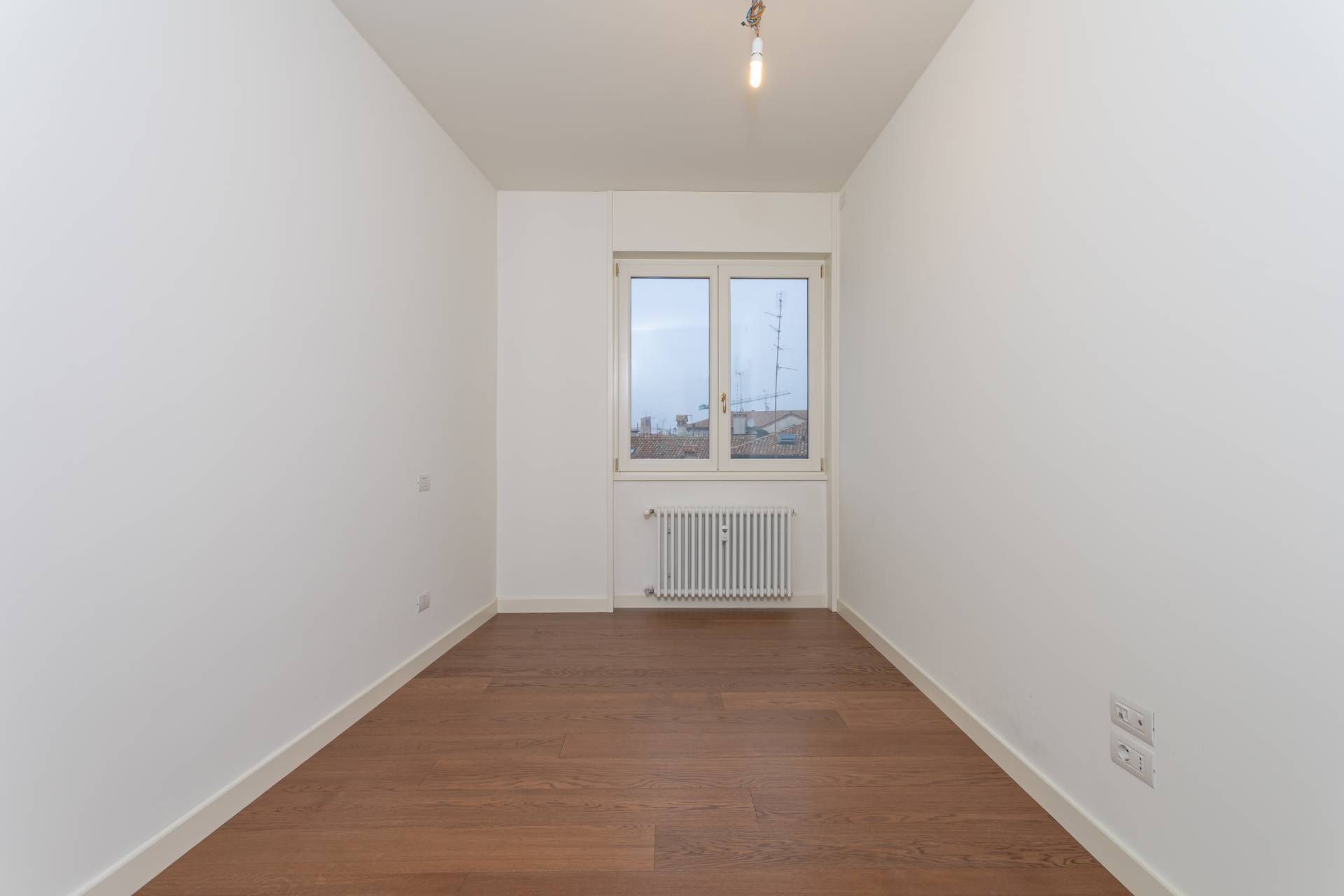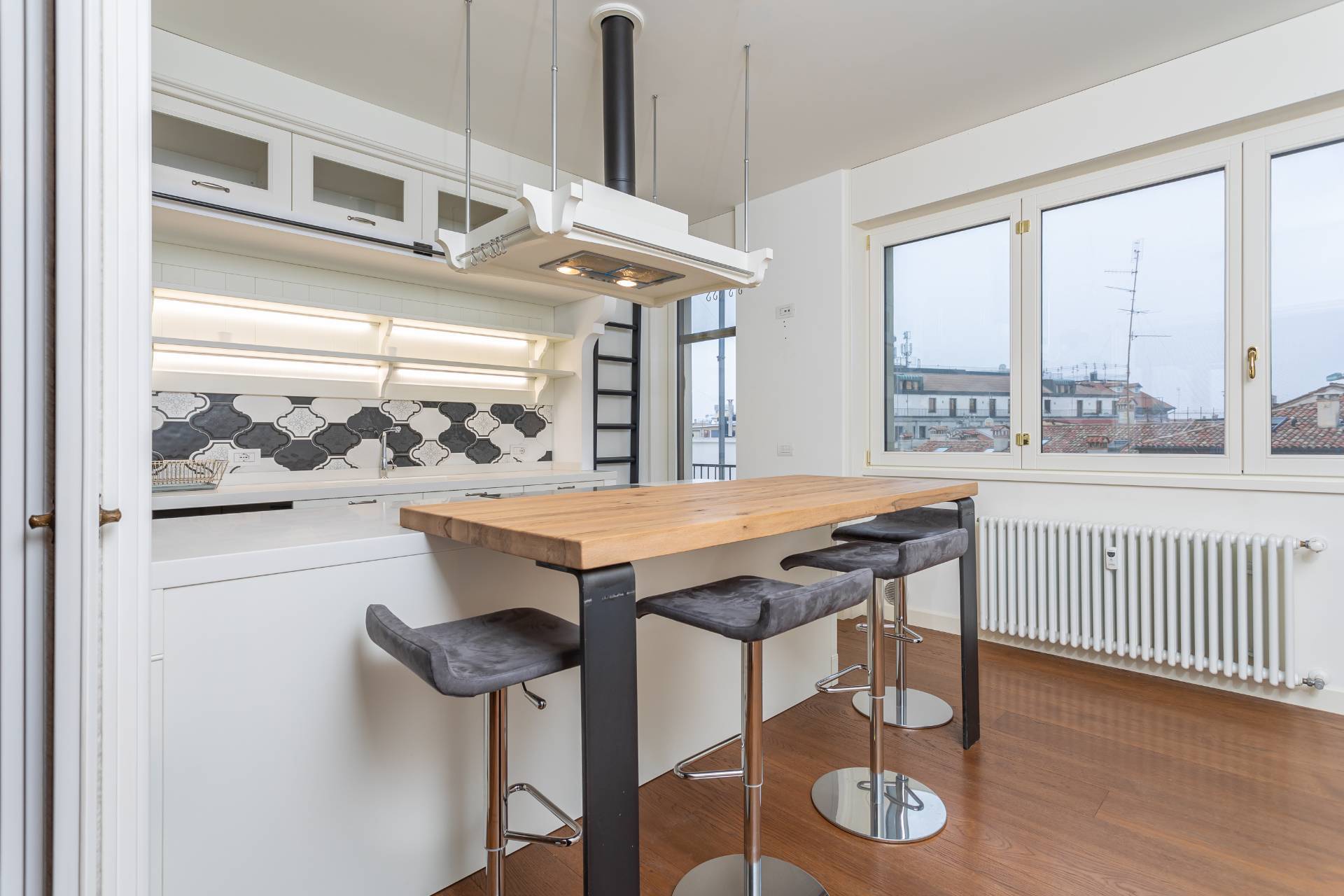 Gode di ottima illuminazione solare e offre una vista panoramica sui tetti della citt, sui giardini e sul fiume Sile. L'appartamento dispone di porta blindata, sistema d'allarme, tapparelle elettriche, aria condizionata canalizzata e riscaldamento semi-autonomo con termosifoni.