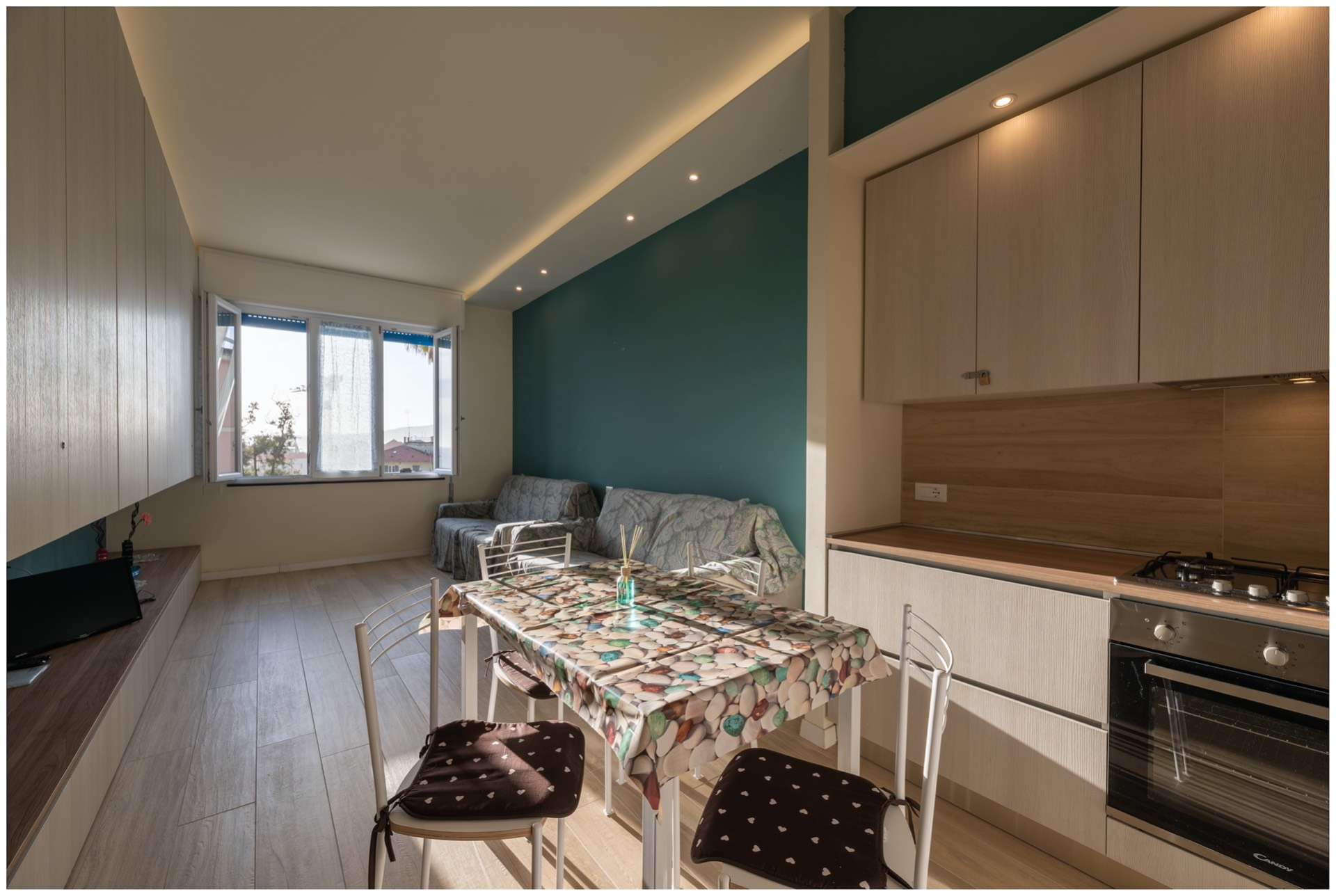 L'effetto legno predominante ed il primo sguardo corre senza ostacoli fino alla grande finestra, affacciata sullo skyline della cittadina e sul mare, verso sud-ovest.