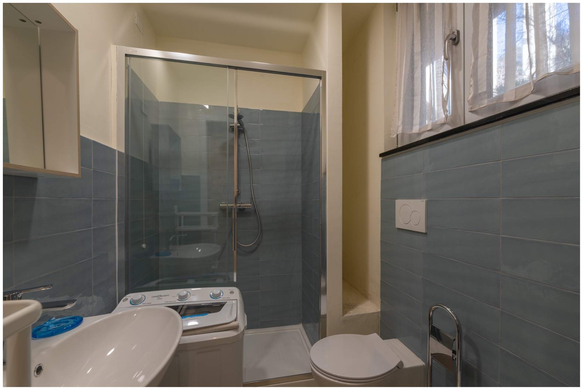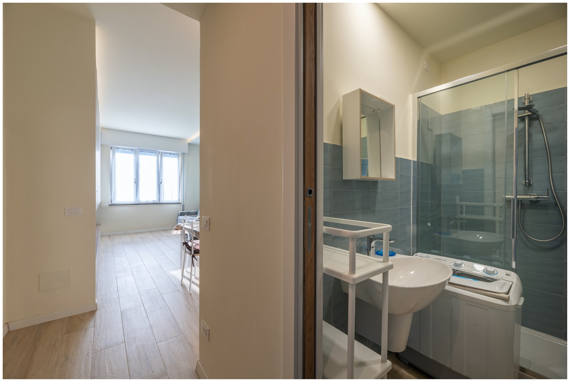 Muoviamo i nostri passi sul pavimento in grs effetto legno e notiamo alla nostra destra il bagno, finestrato e con doccia.