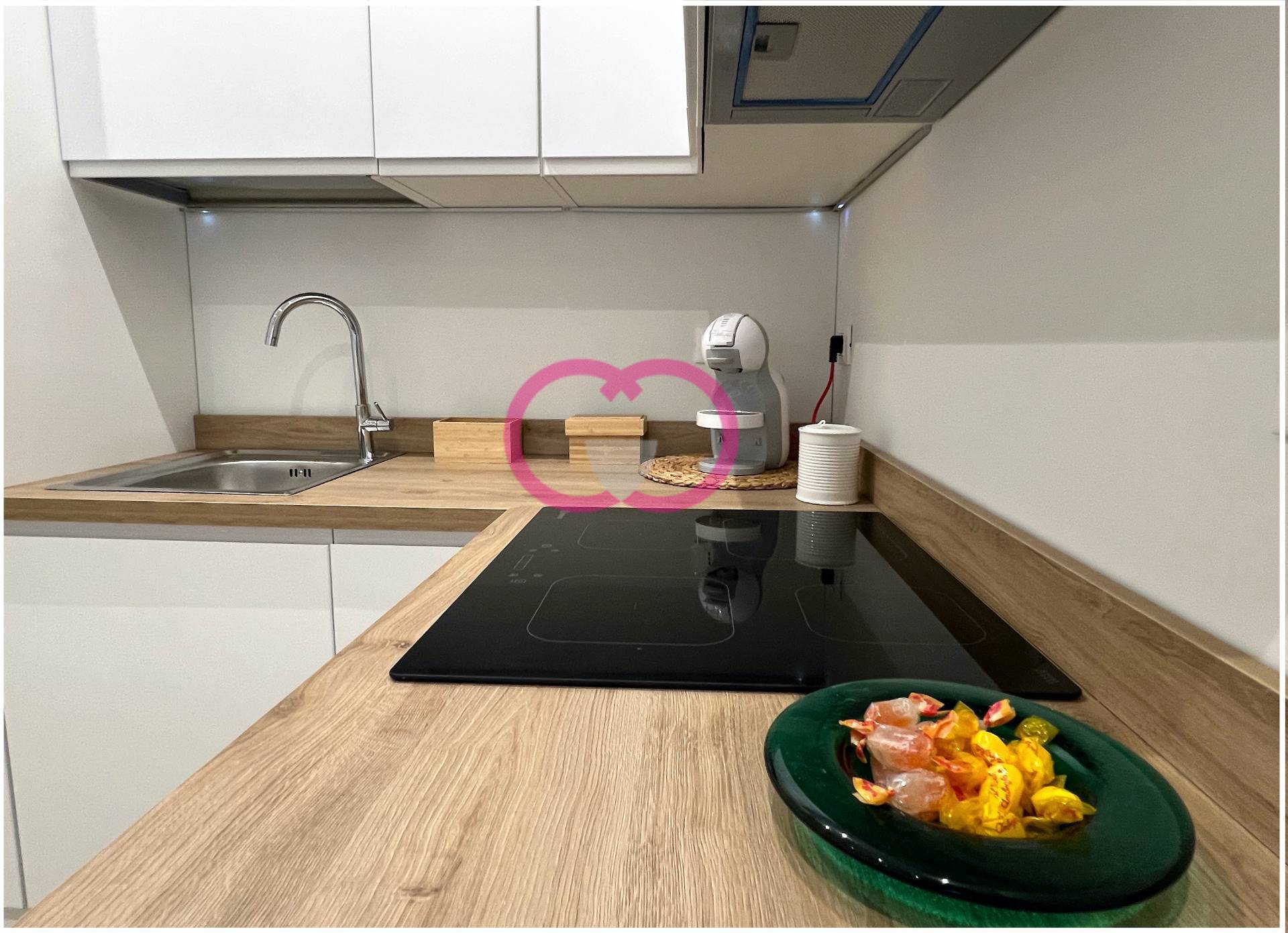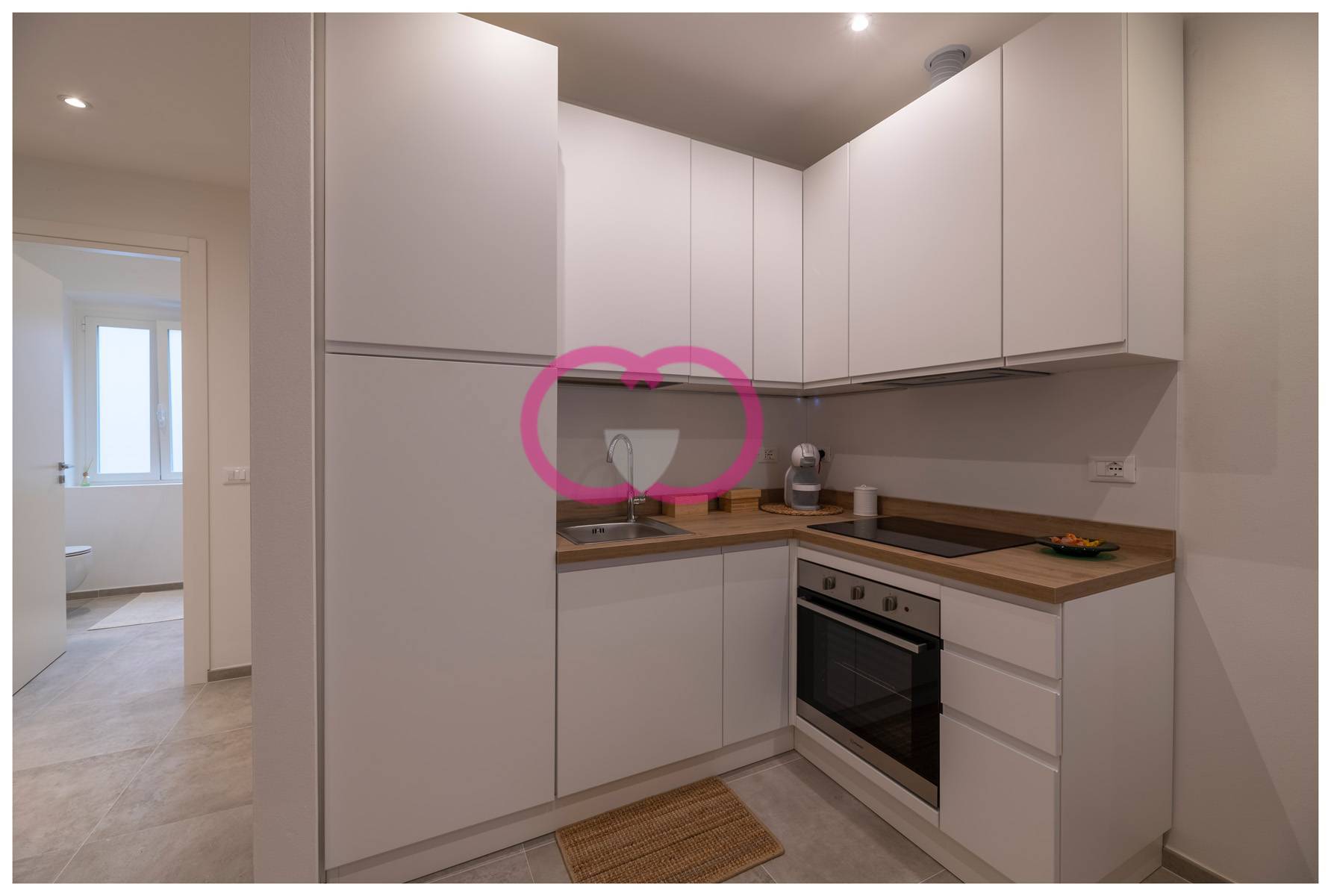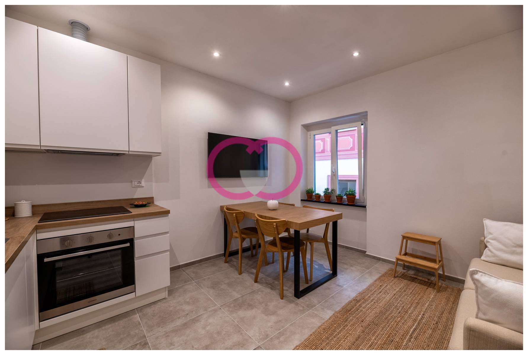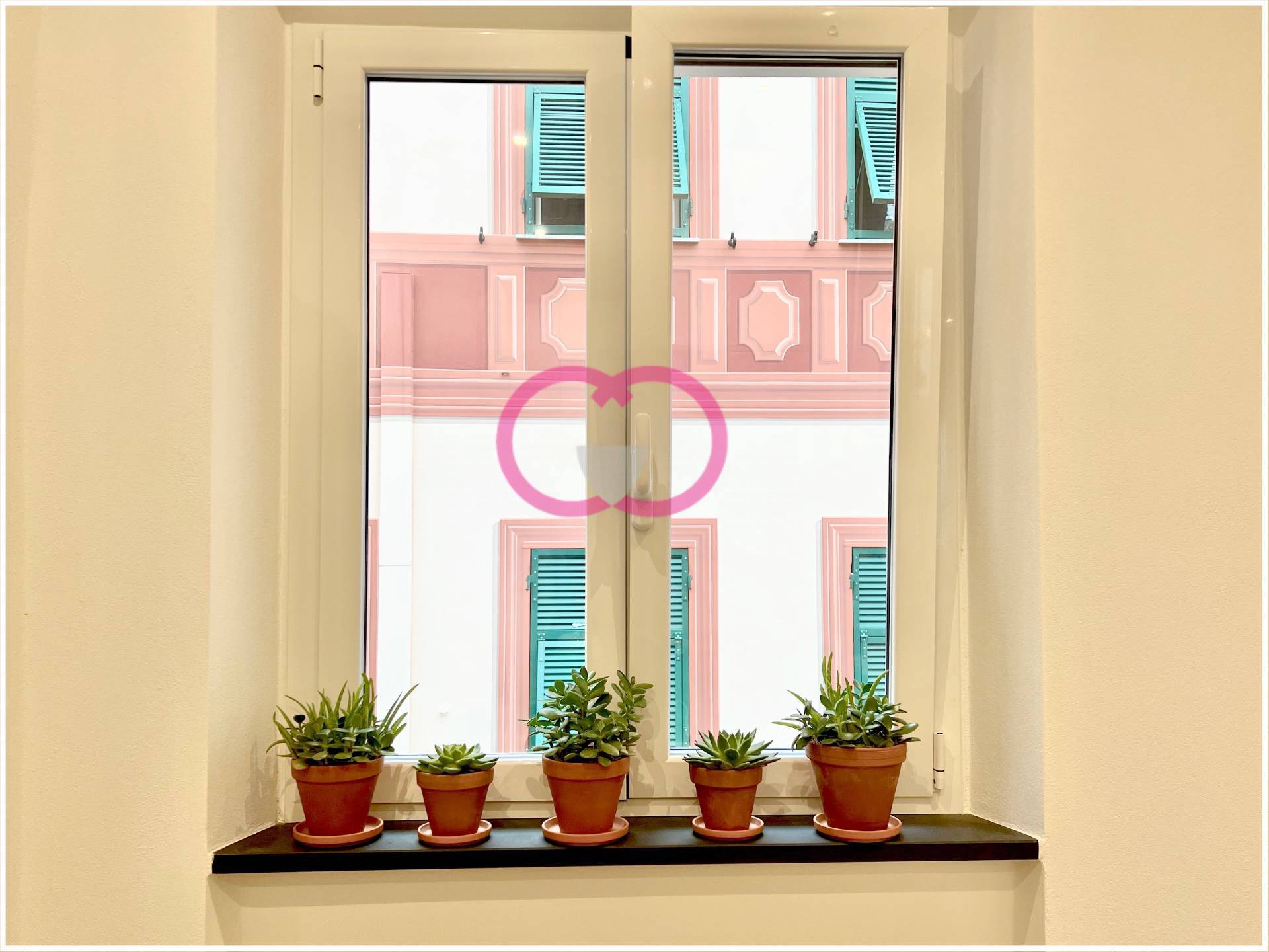 Dall'ingresso passiamo direttamente alla zona giorno, con angolo cottura ben equipaggiato con piano ad induzione, colonna frigo e freezer, forno e macchina del caff. La finestra affacciata sul caruggio principale, con i suoi colori e profumi tipici: un quadro sensoriale imperdibile.