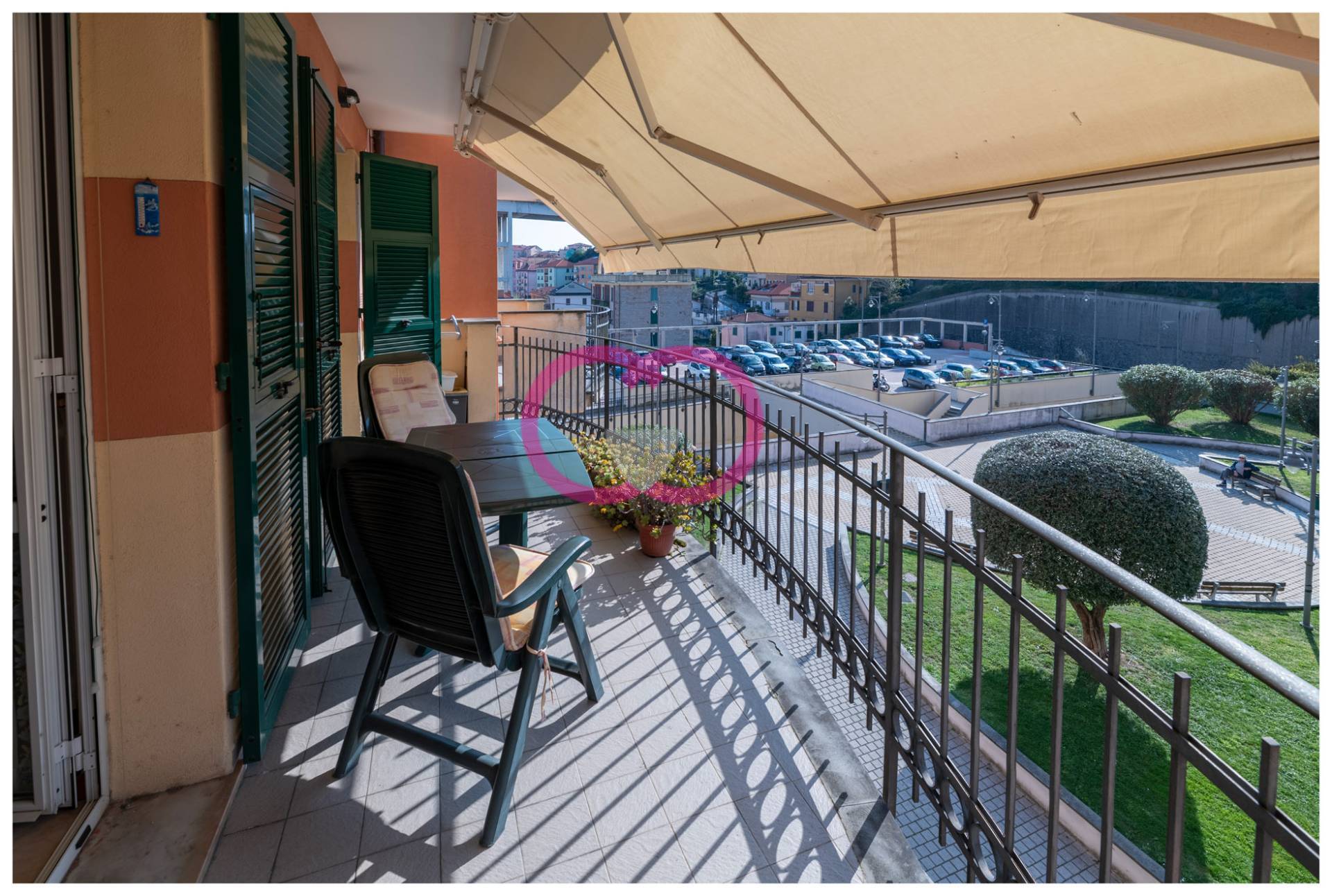 Siamo nel complesso Corte di Mare, a Varazze: una realt ordinata, viva, con giardini condominiali curati e spazi pensati anche per i pi piccoli.