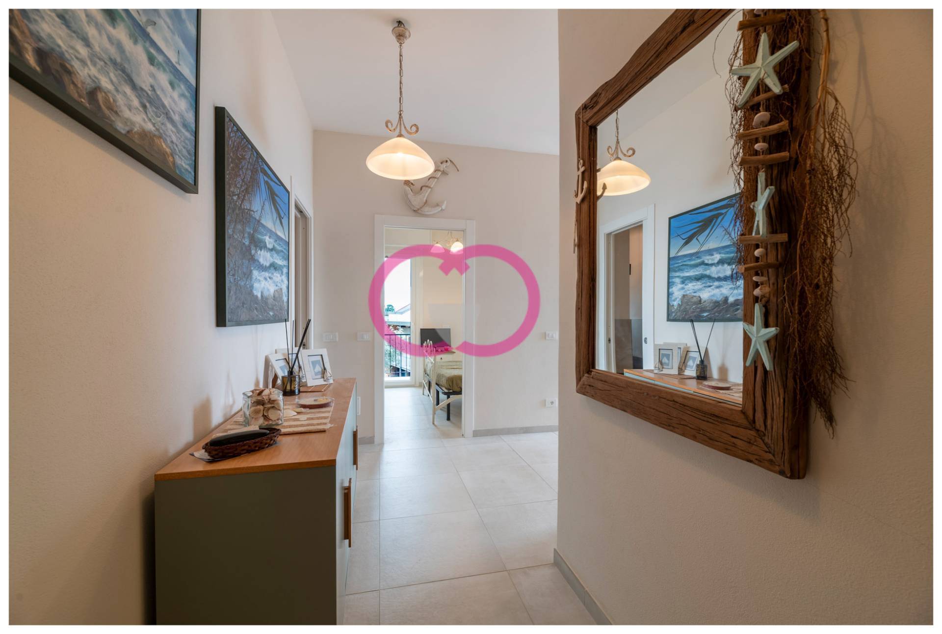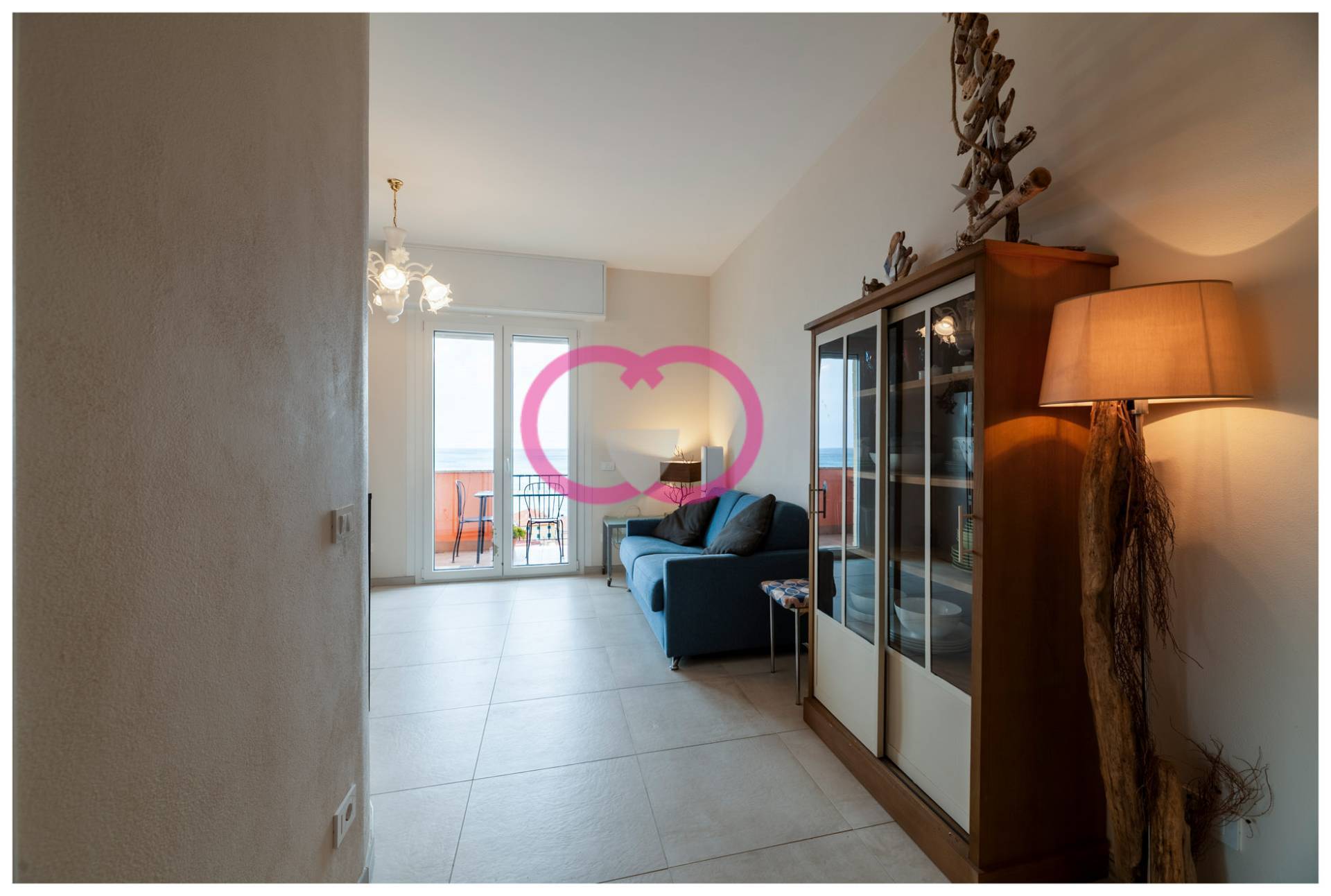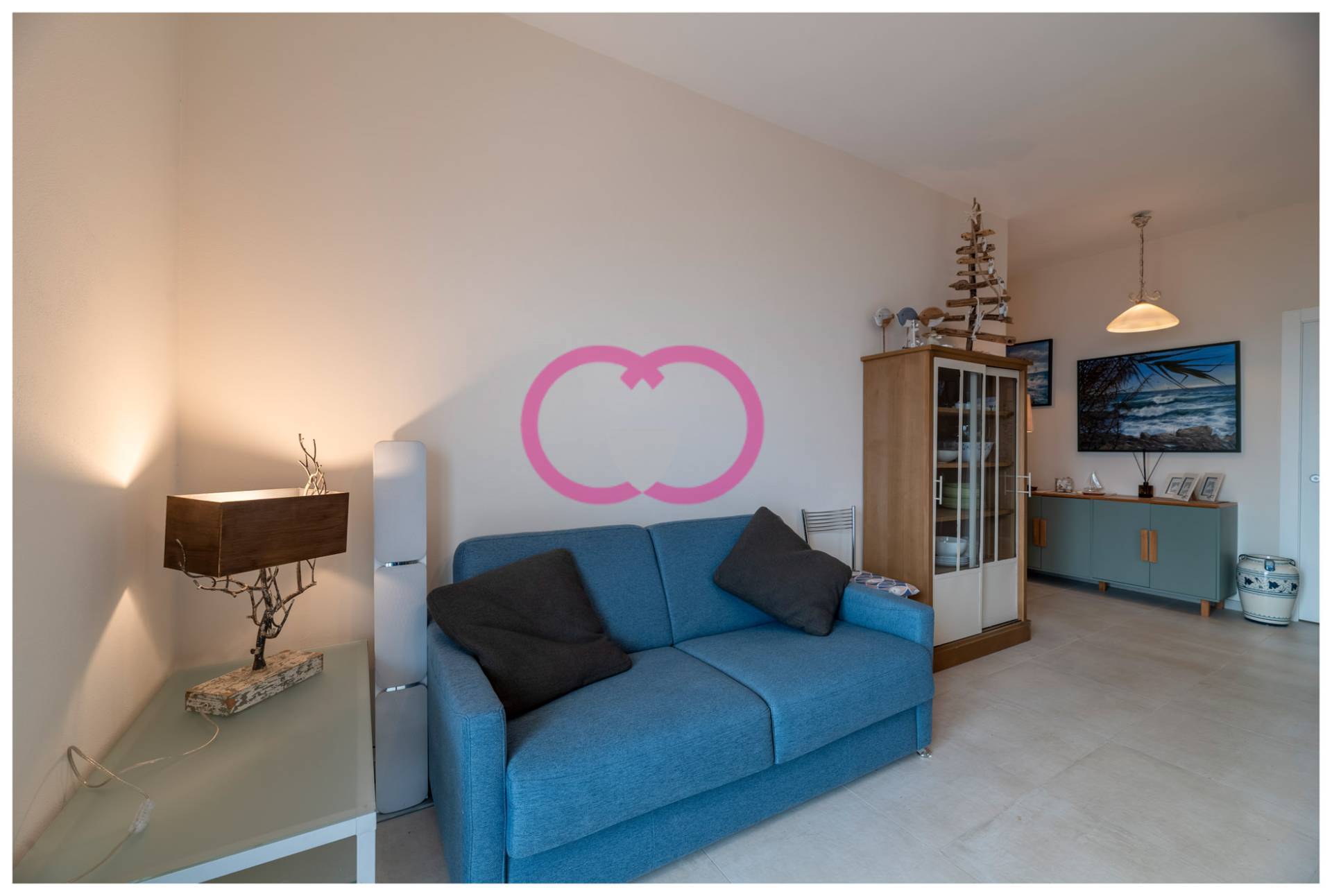 Il soggiorno accoglie con toni morbidi, colori che richiamano il mare. Blu profondi, sfumature sabbia, dettagli che non sono messi l per caso. Il legno protagonista discreto: lo trovi nelle finiture, negli arredi, negli oggetti scelti con cura. Decorazioni leggere, quasi sospese, che parlano di mare in modo elegante, mai forzato.
