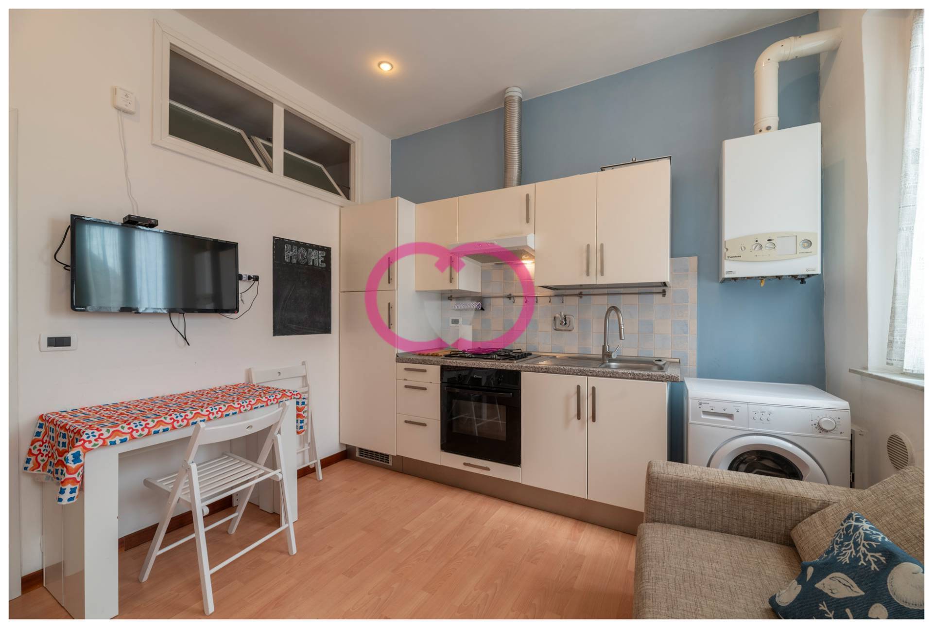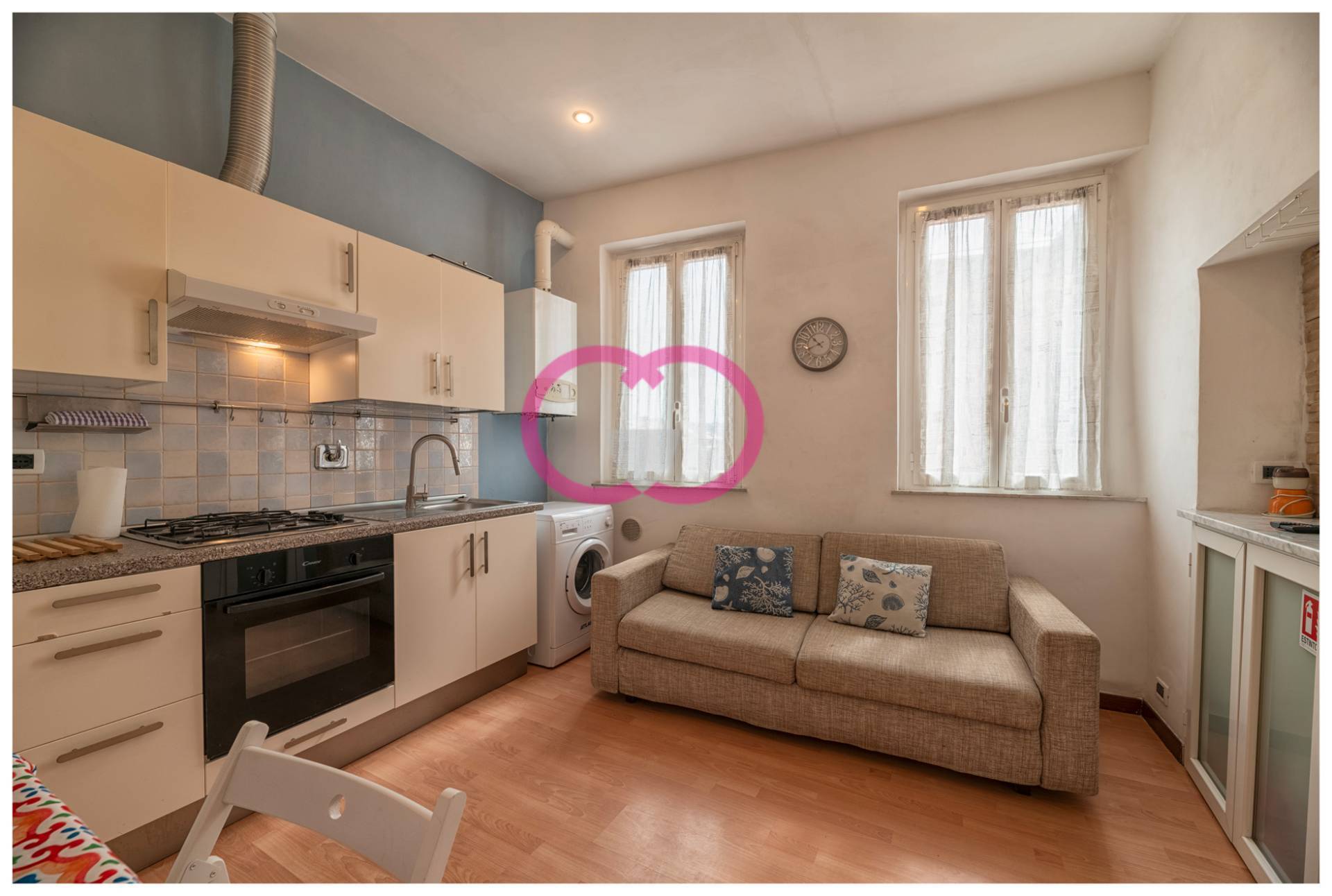 La zona giorno compatta e ben organizzata: cucina attrezzata, divano, luce naturale che entra dalle finestre e rende lambiente piacevole in ogni momento della giornata.