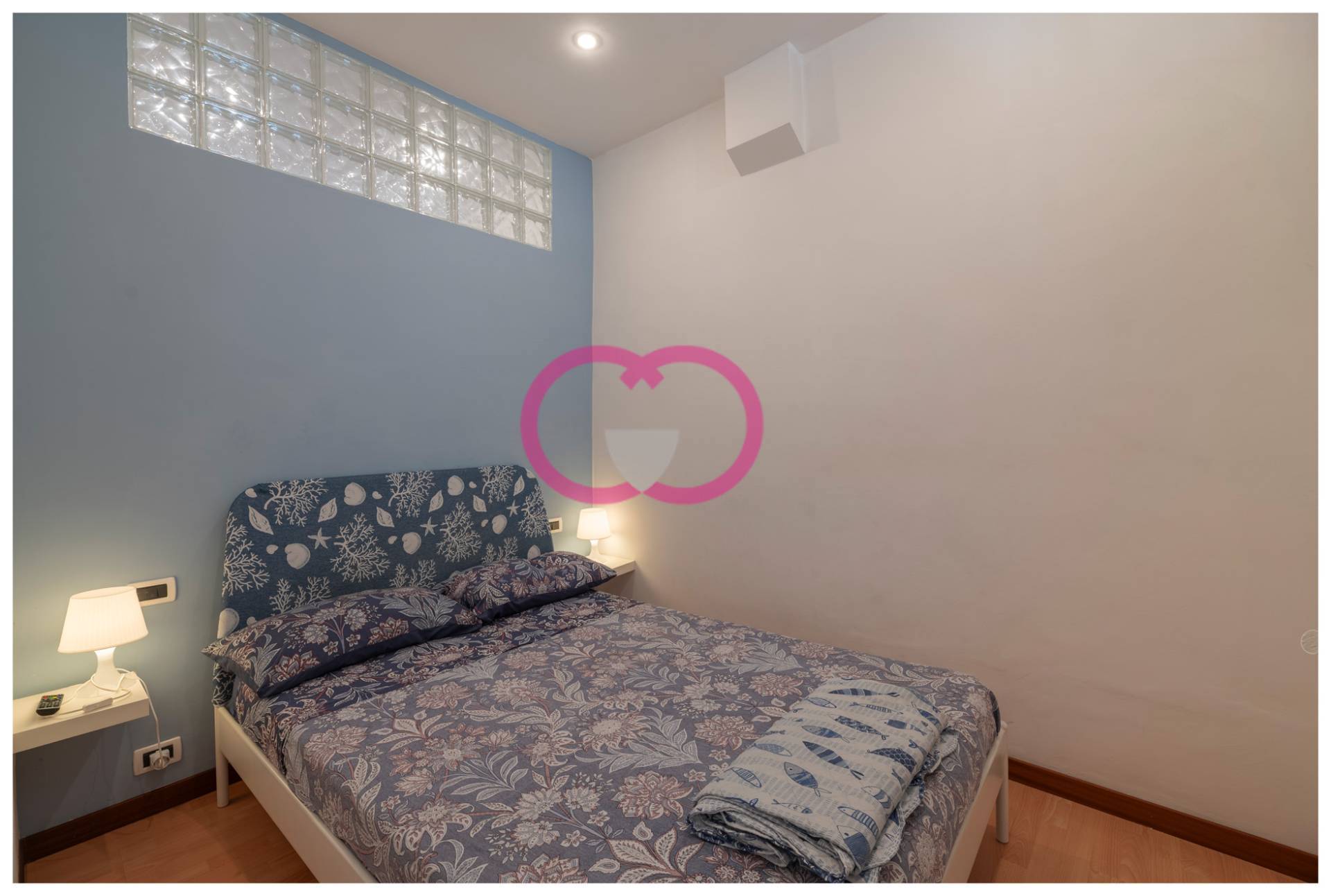 La camera matrimoniale ha unatmosfera rilassante, con toni chiari e una parete blu che richiama il mare. Accanto, la cameretta con letto a castello una soluzione intelligente per ospitare bambini o amici, senza rinunciare allo spazio.